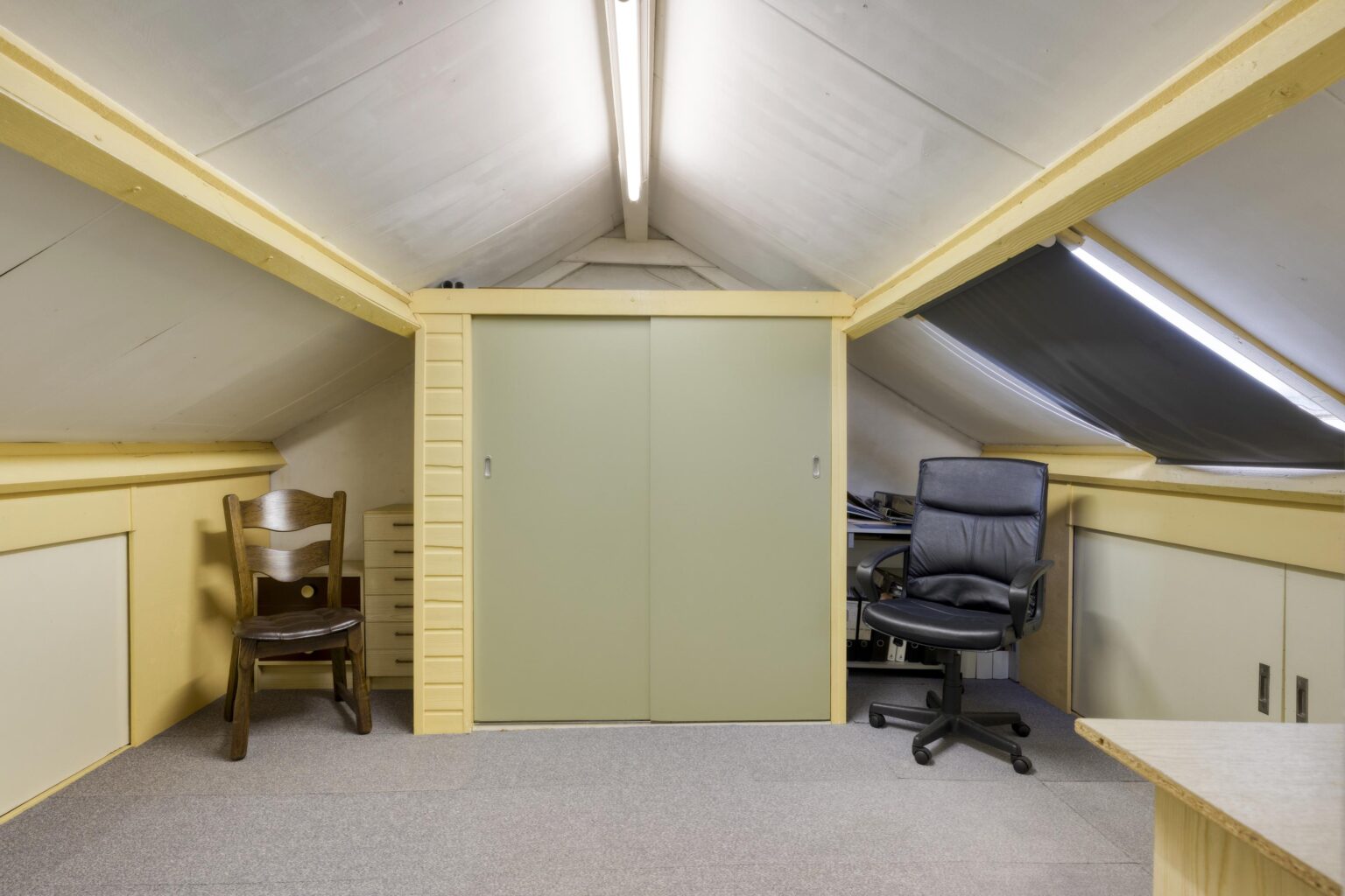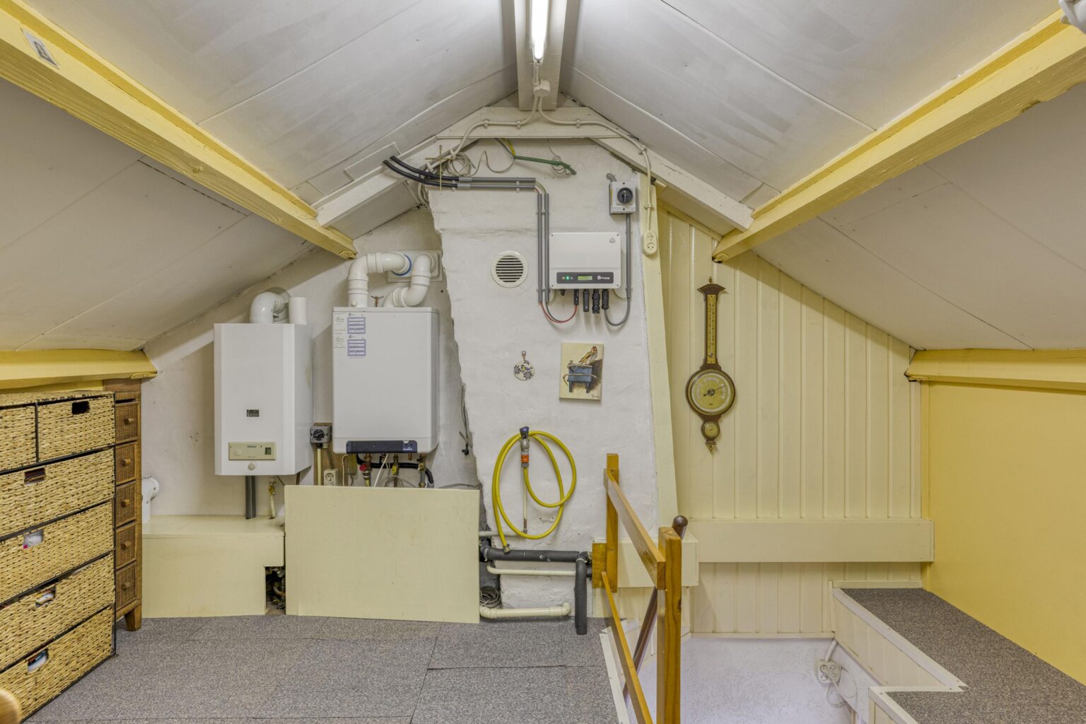 Middels vaste trap bereik je de voorzolder met de opstelling van de cv (Intergas, bouwjaar 2012), de omvormer ten behoeve van de zonnepanelen en bergruimte.