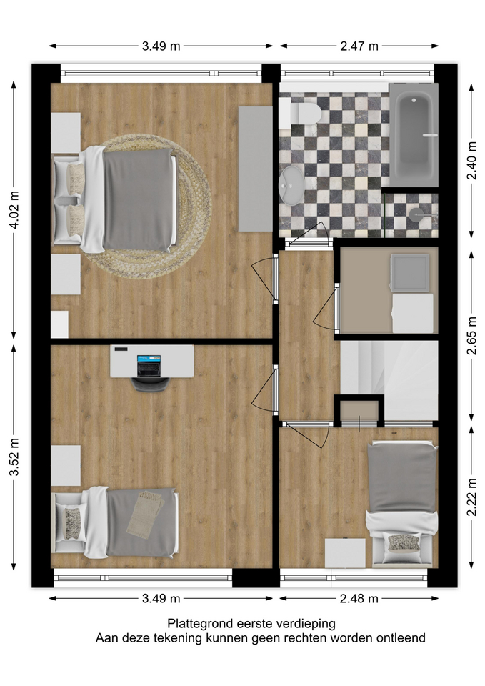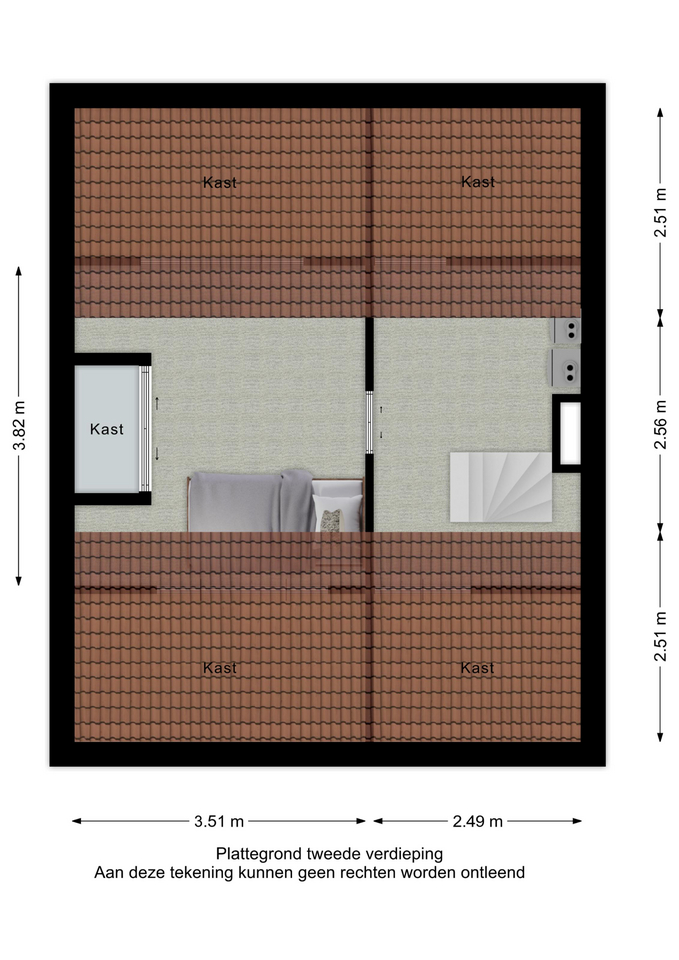 De slaapkamer aan de rechtervoorzijde biedt de vaste trap naar de tweede verdieping.