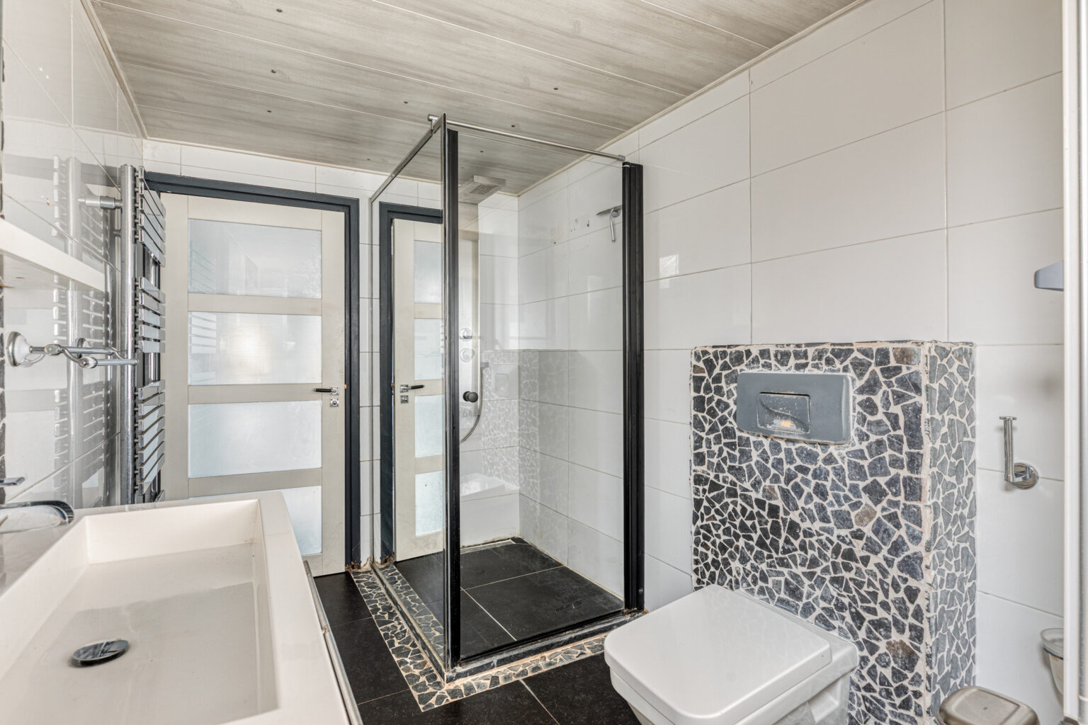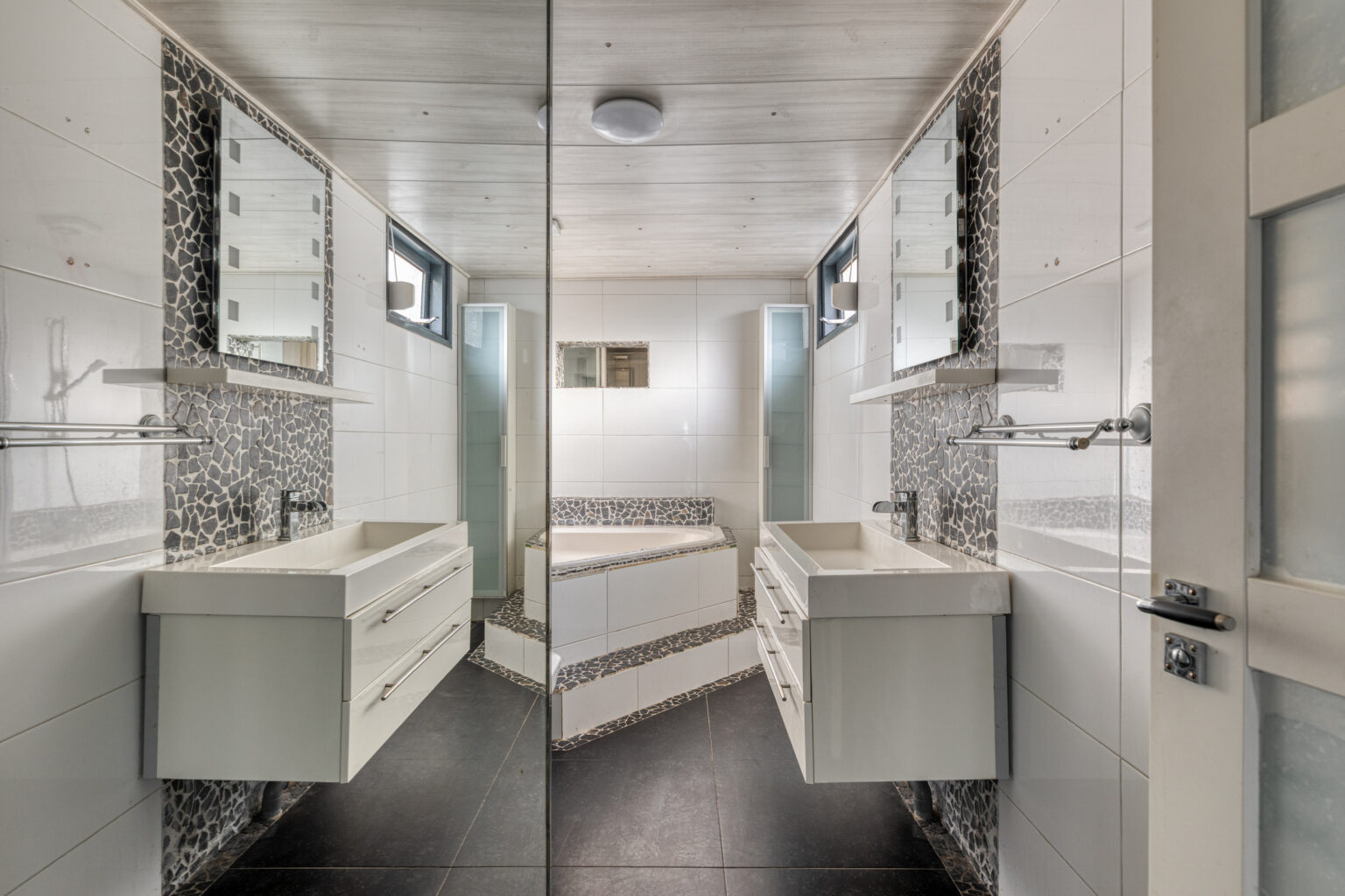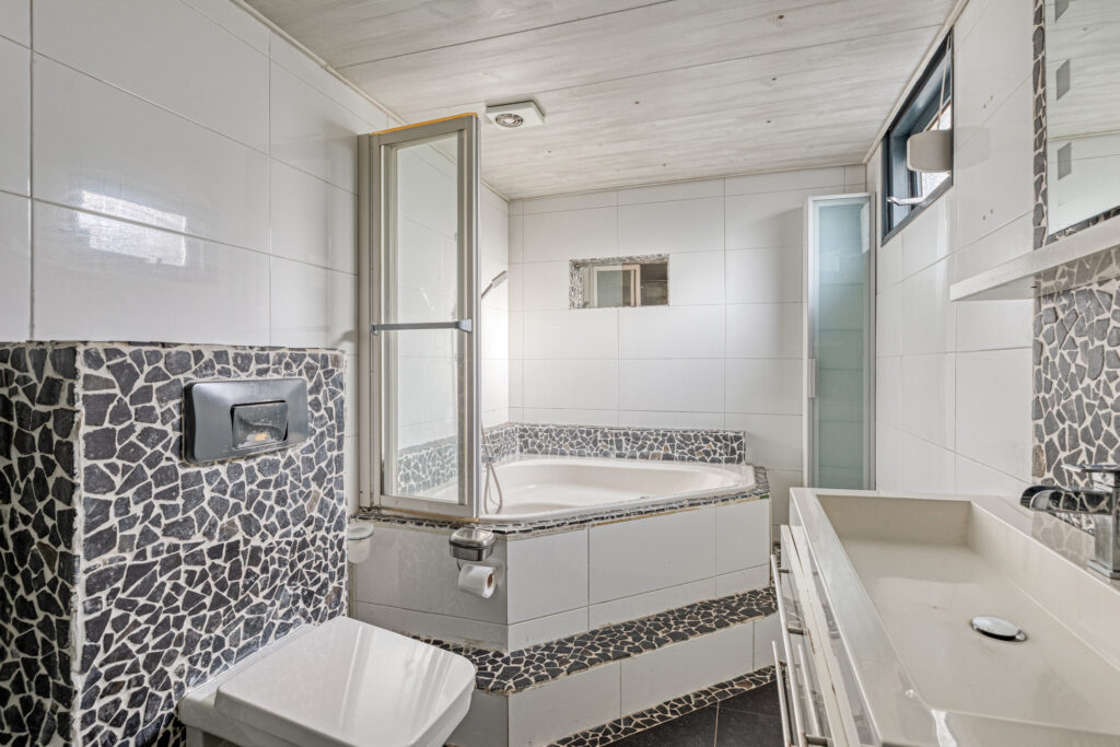 De aanbouw biedt tevens plaats aan de royale badkamer, volledig betegeld en uitgerust met een whirlpool, breed wastafelmeubel, toilet en inloopdouche.