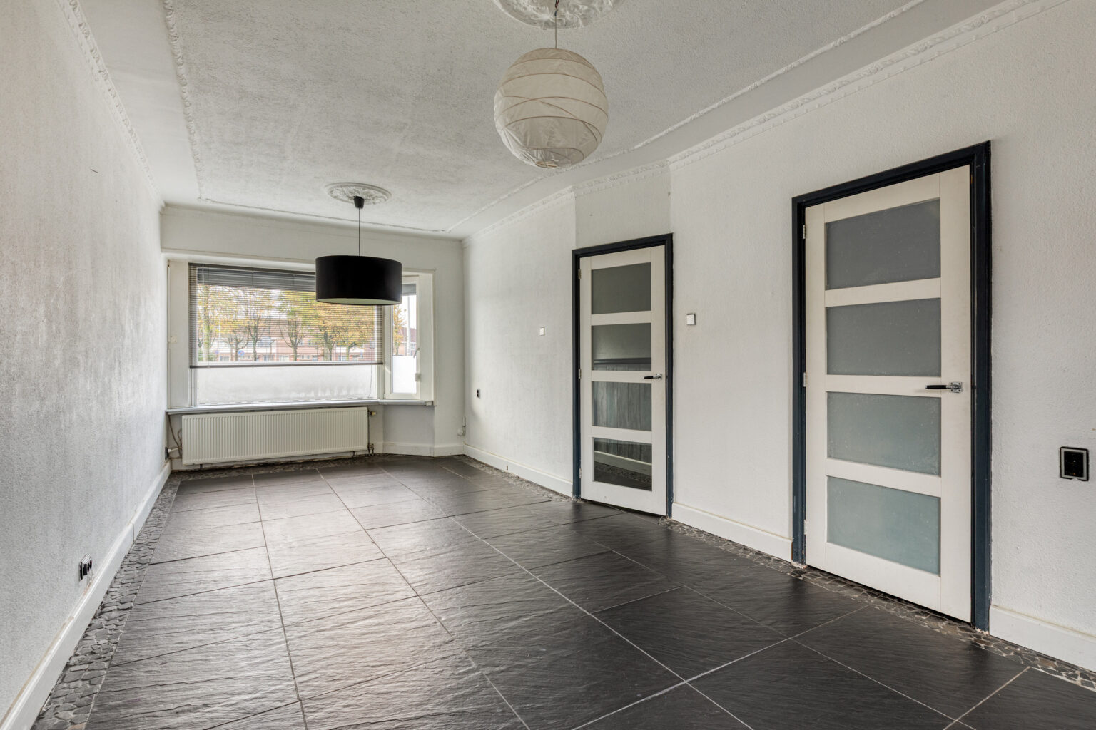 Bij binnenkomst in de hal vind je direct een handige inbouwkast voor wasmachine en droger. Vanuit hier stap je de lichte en sfeervolle woonkamer in met een charmante erker die zorgt voor veel lichtinval. De woonkamer is voorzien van een tegelvloer, stucwanden en sierlijsten.