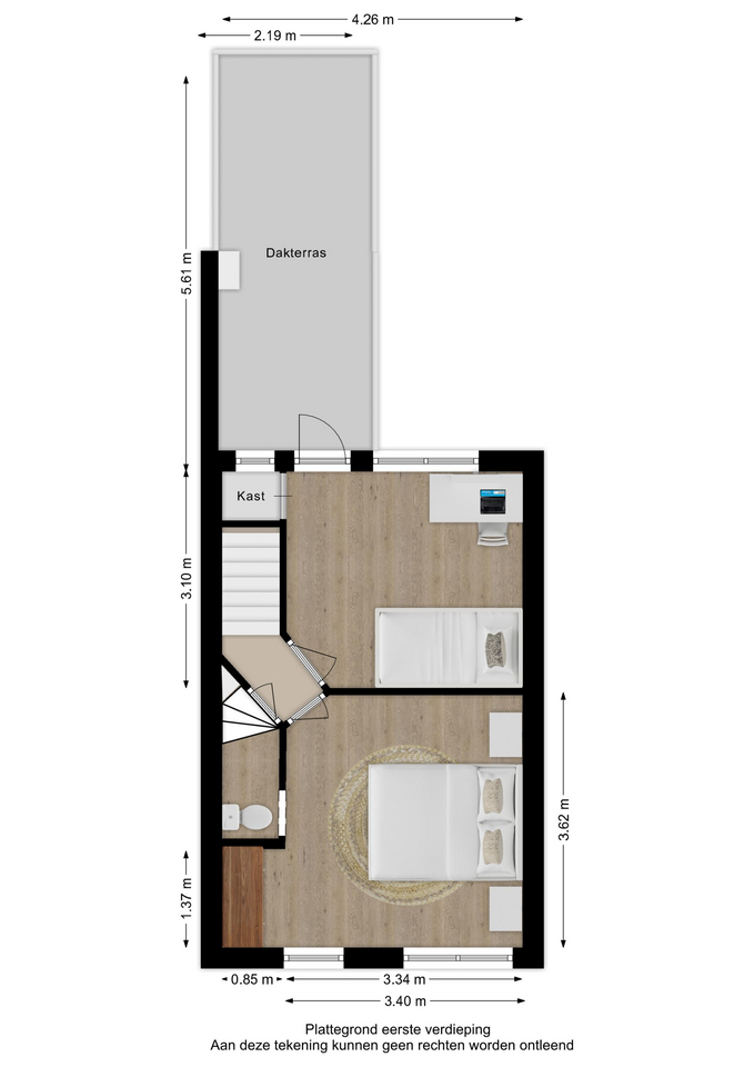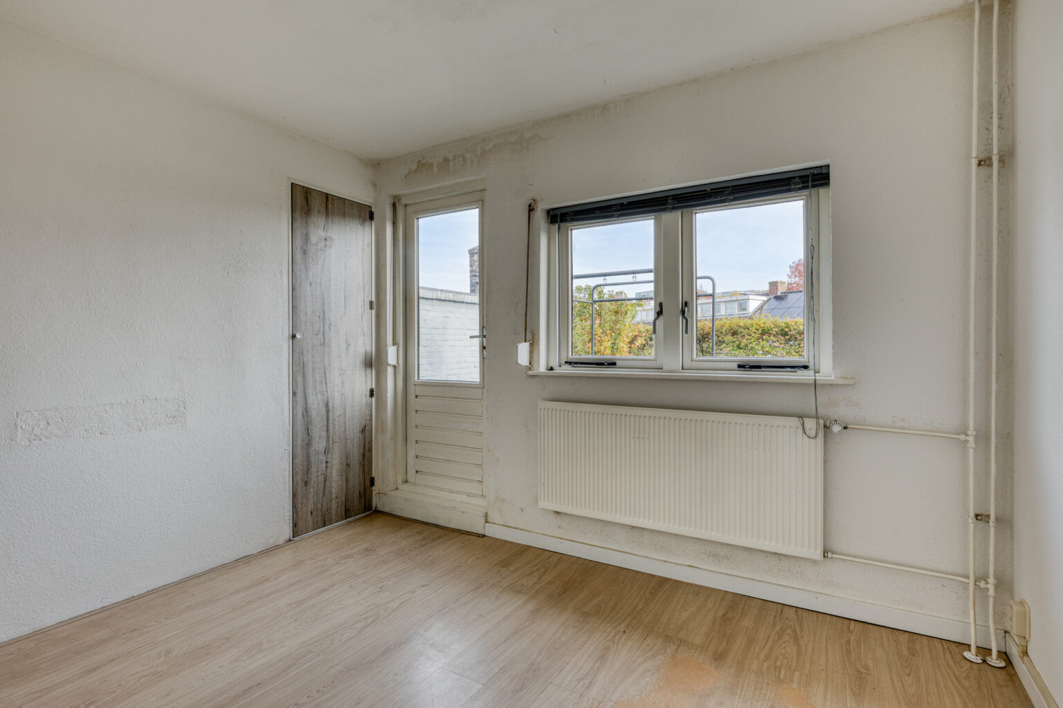 De ruime slaapkamer aan de voorzijde is licht en comfortabel en beschikt over een extra toilet. De slaapkamer aan de achterzijde heeft een inbouwkast en een deur naar het platte dak die tevens ook gebruikt kan worden als dakterras.