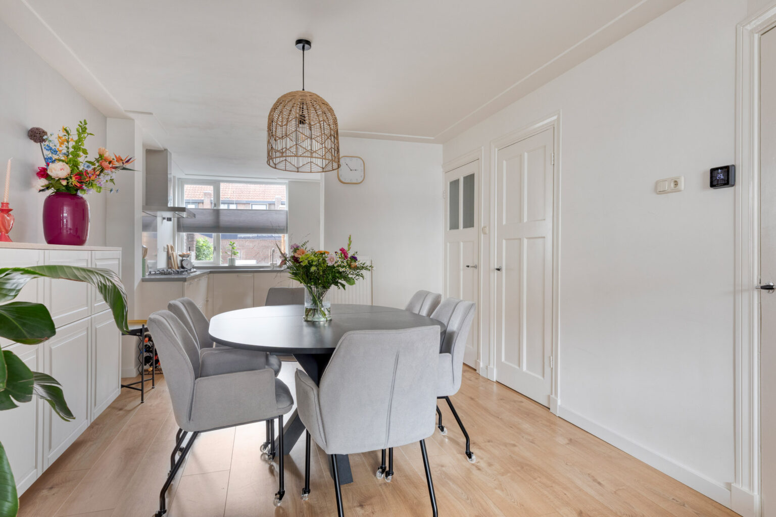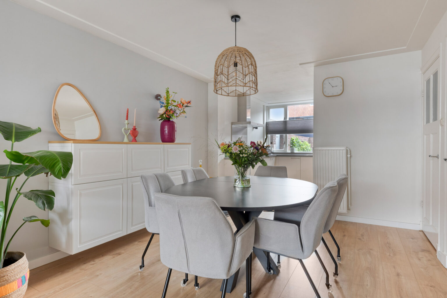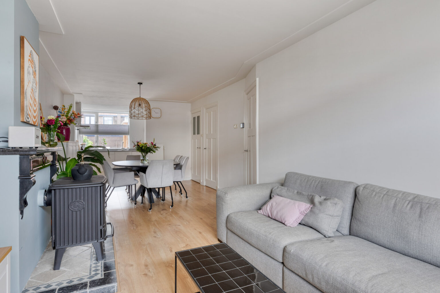 De woonkamer biedt een mooie laminaatvloer, stucwanden en stucplafond. Door de erker, de haard en de open verbinding met de keuken is een aangename ruimte gecreëerd waar het fijn vertoeven is.