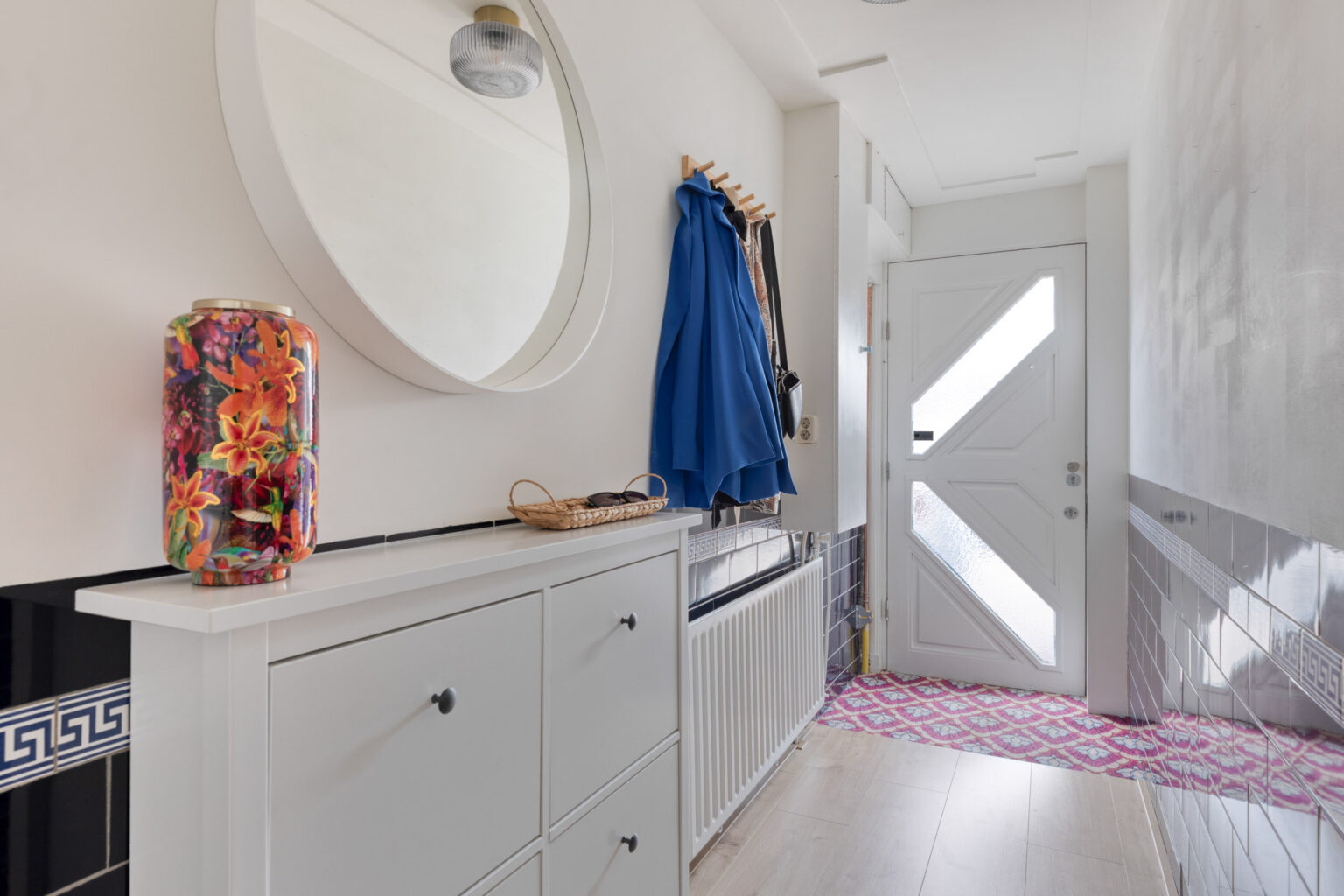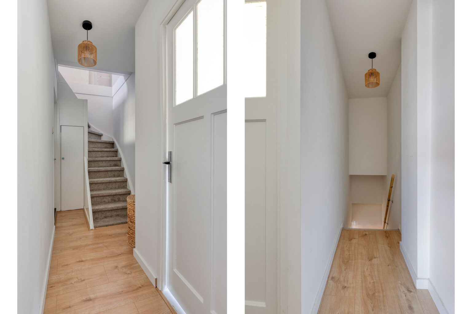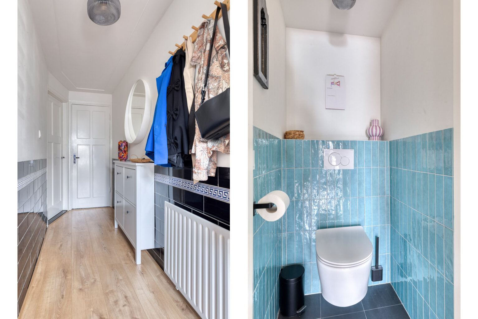 De entree van de woning biedt direct de authentieke sfeer die je verwacht bij de woning door de mooie deels betegelde wanden, laminaatvloer en stucplafond. Vanaf hier bereik je de meterkast, toilet en de woonkamer.