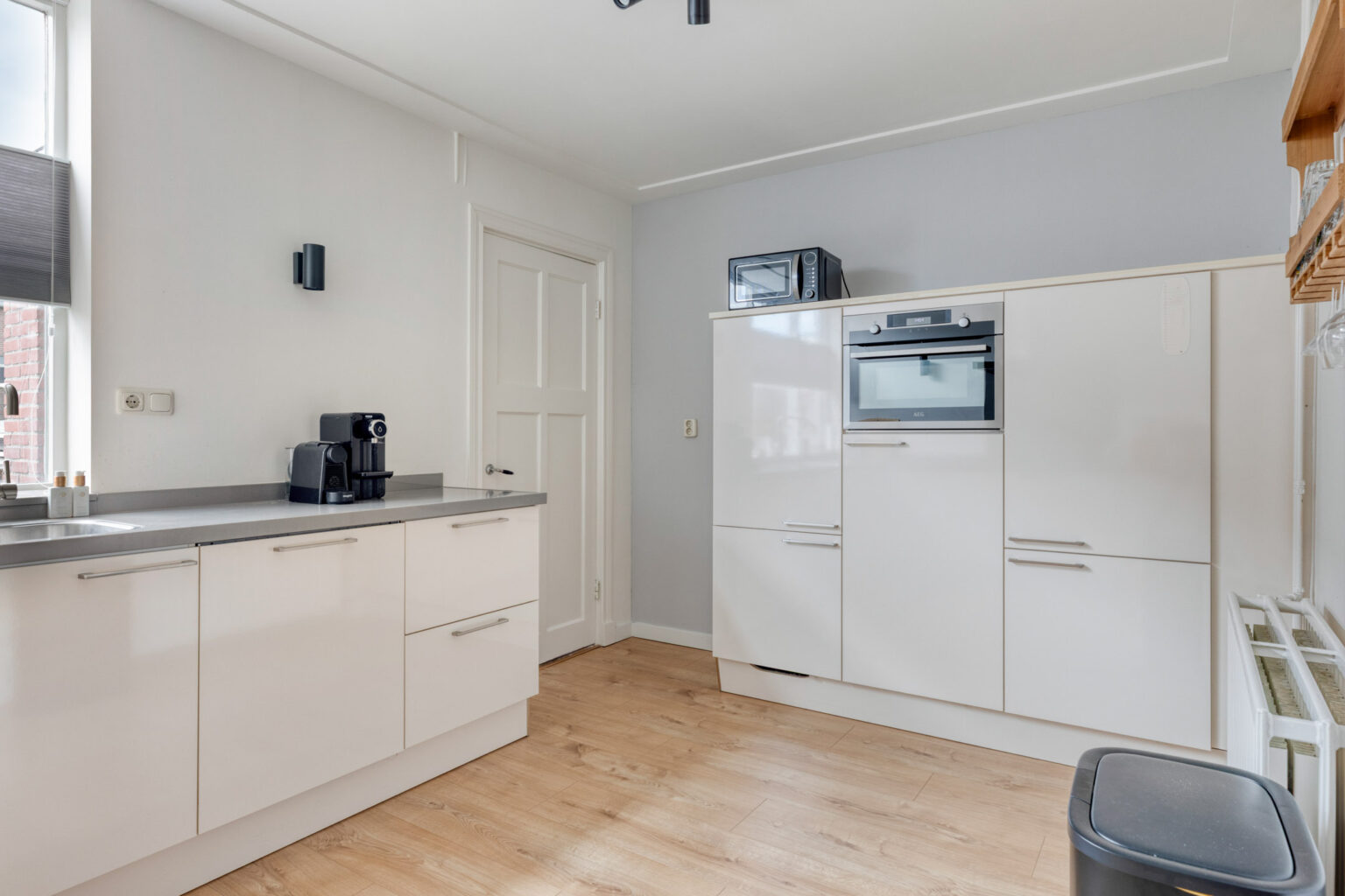 De ruime en lichte keuken tref je in de uitbouw met een 5-pits gaskookplaat, afzuigkap, vaatwasser, combi-oven, koelkast en diverse kasten. Een loopdeur leidt naar de bijkeuken.
