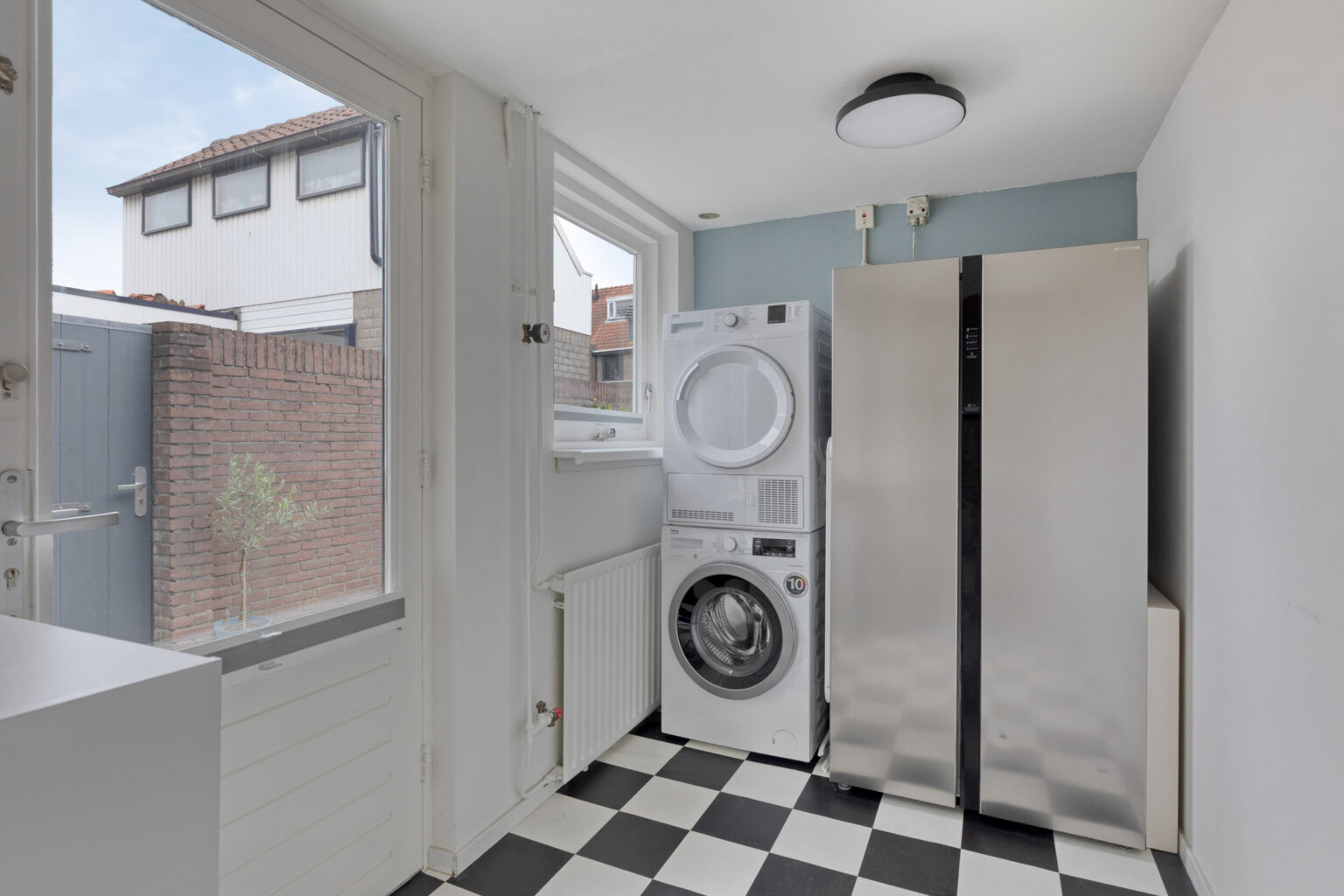 In de praktische bijkeuken tref je de aansluiting voor de wasapparatuur en een loopdeur naar de tuin.