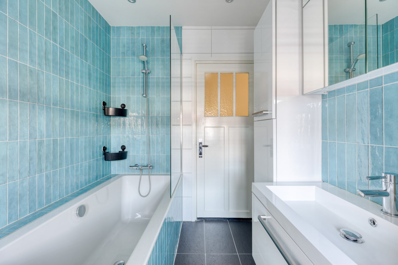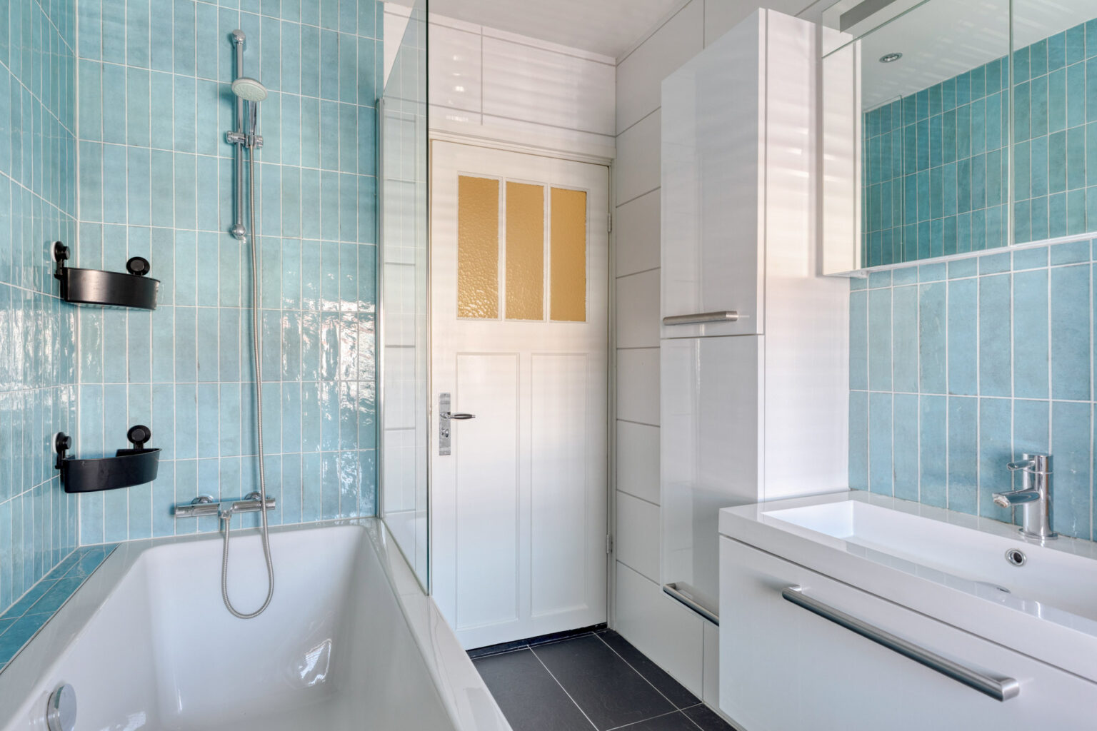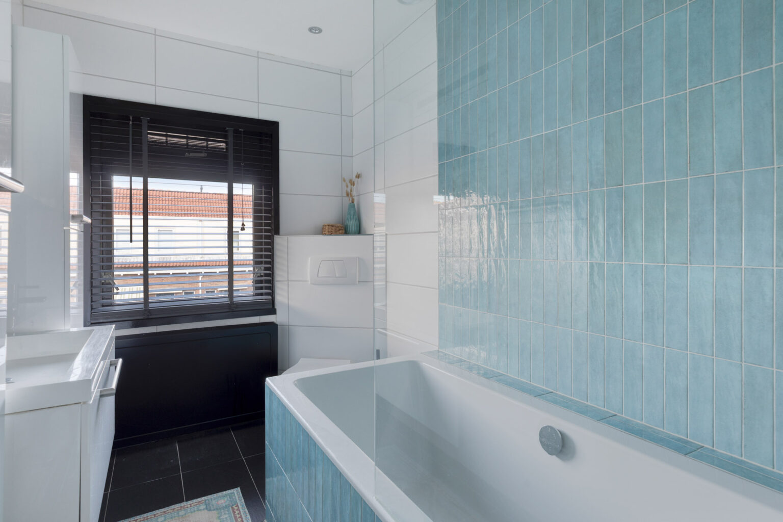 De badkamer is mooi afgewerkt met trendy betegeling, waardoor een eigentijdse en warme sfeer ontstaat. Het ligbad en het fraaie meubel maken het plaatje compleet.