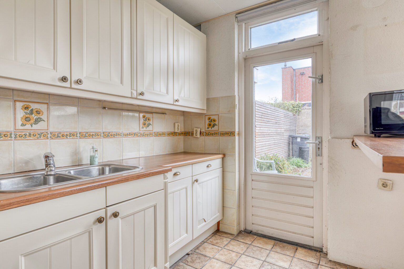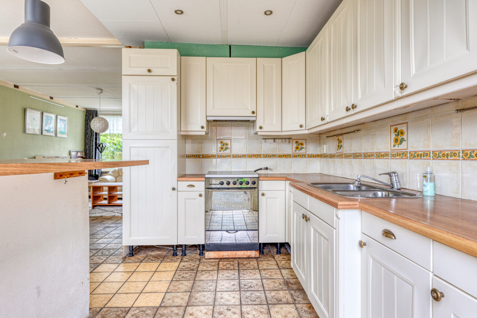 De keuken is gelegen aan de achterzijde en biedt een 4-pits gaskookplaat, afzuigkap, oven, koelkast en diverse kasten.