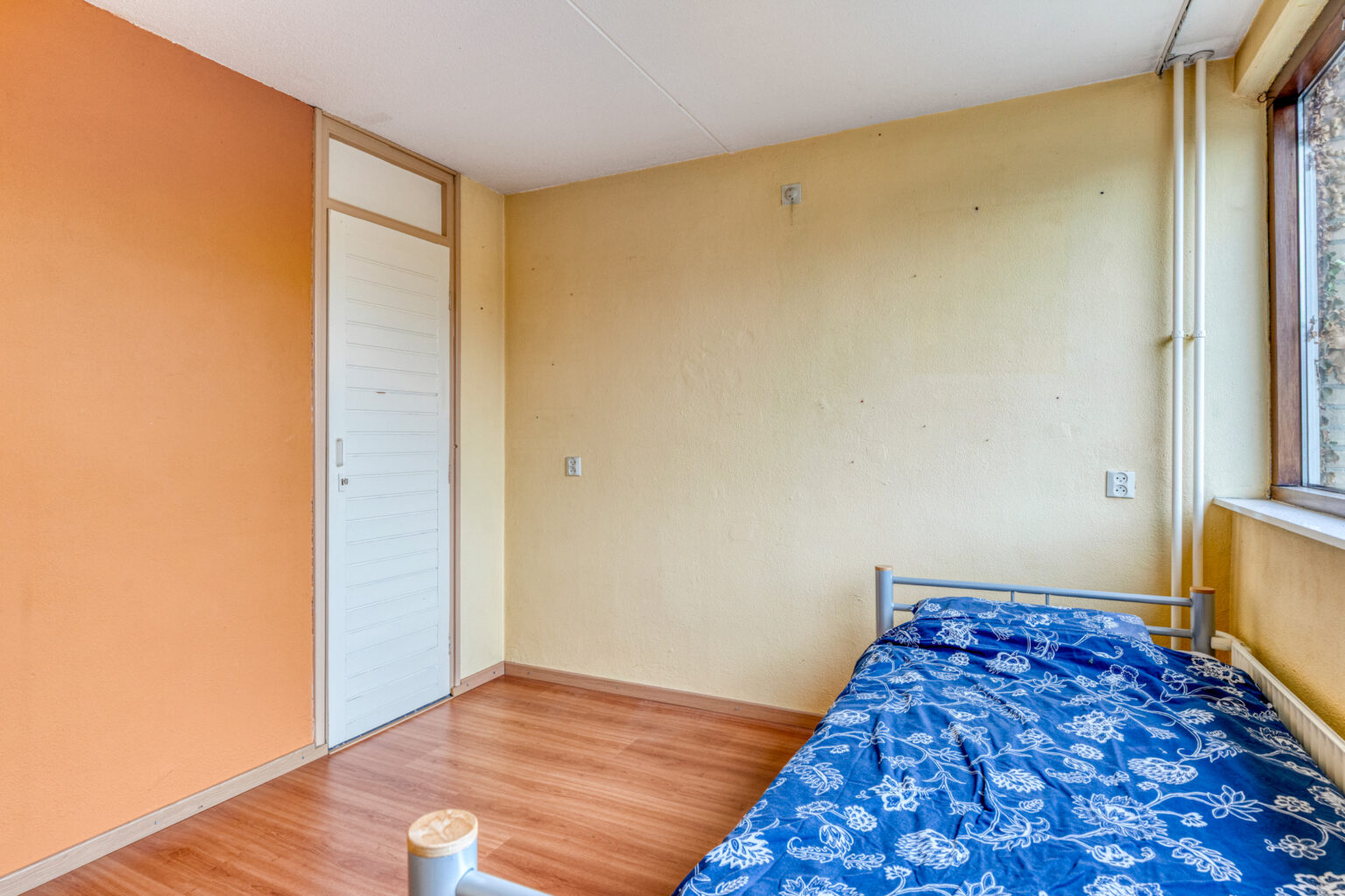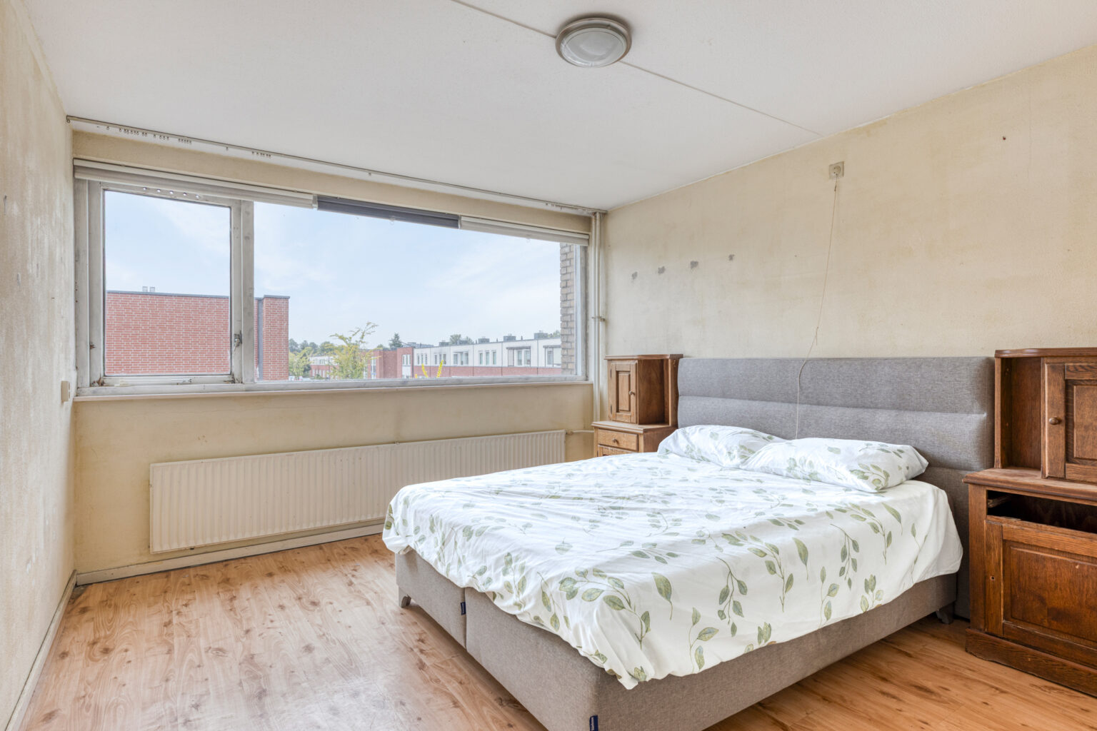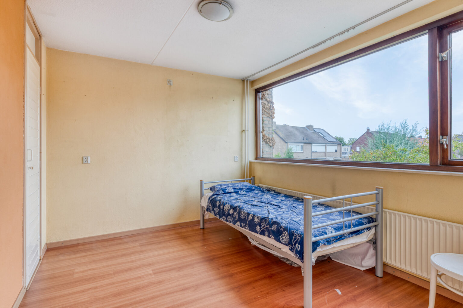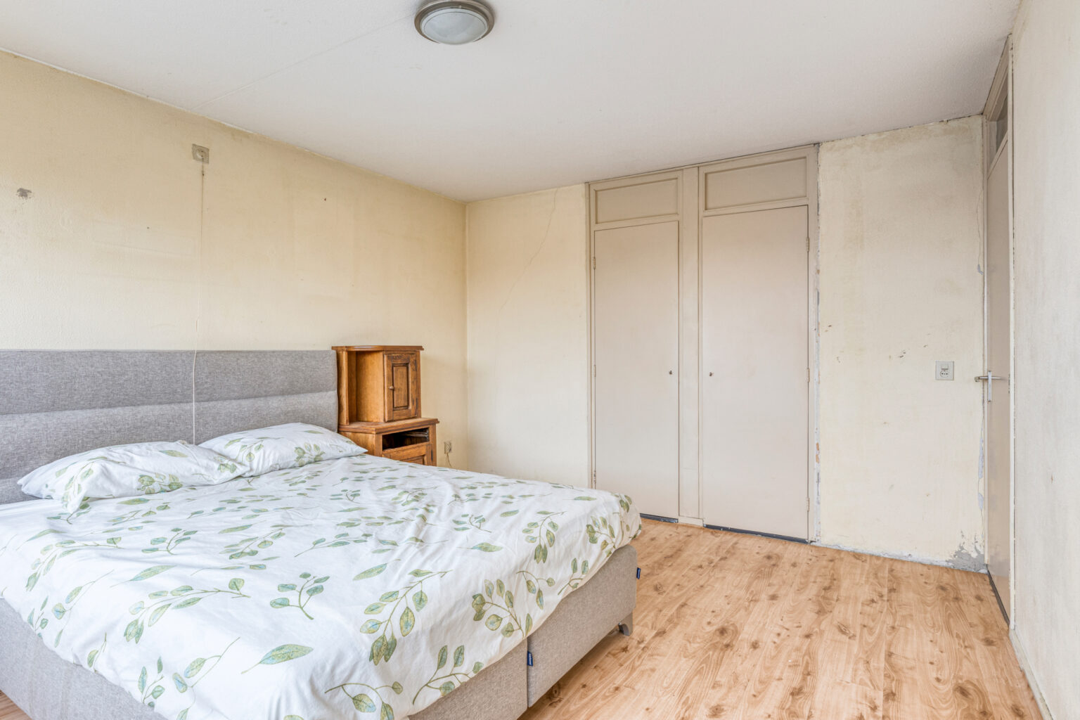 De slaapkamer gelegen aan de rechtervoorzijde biedt laminaat, spuitwerkwanden, spuitwerkplafond en inbouwkasten.