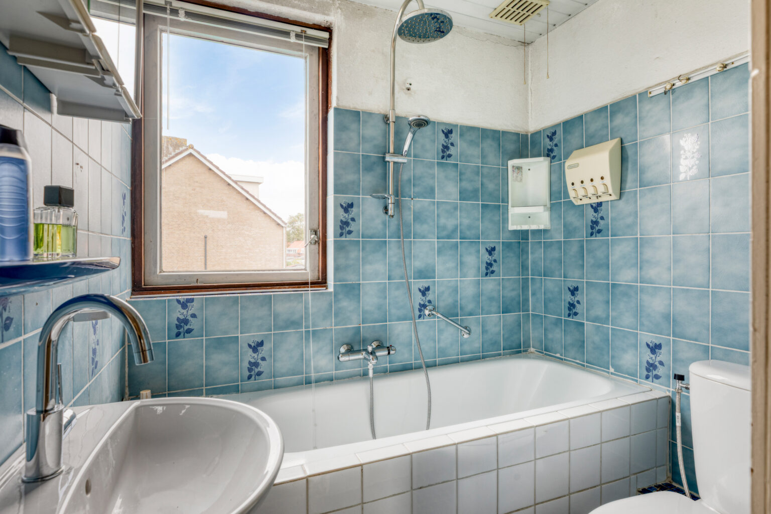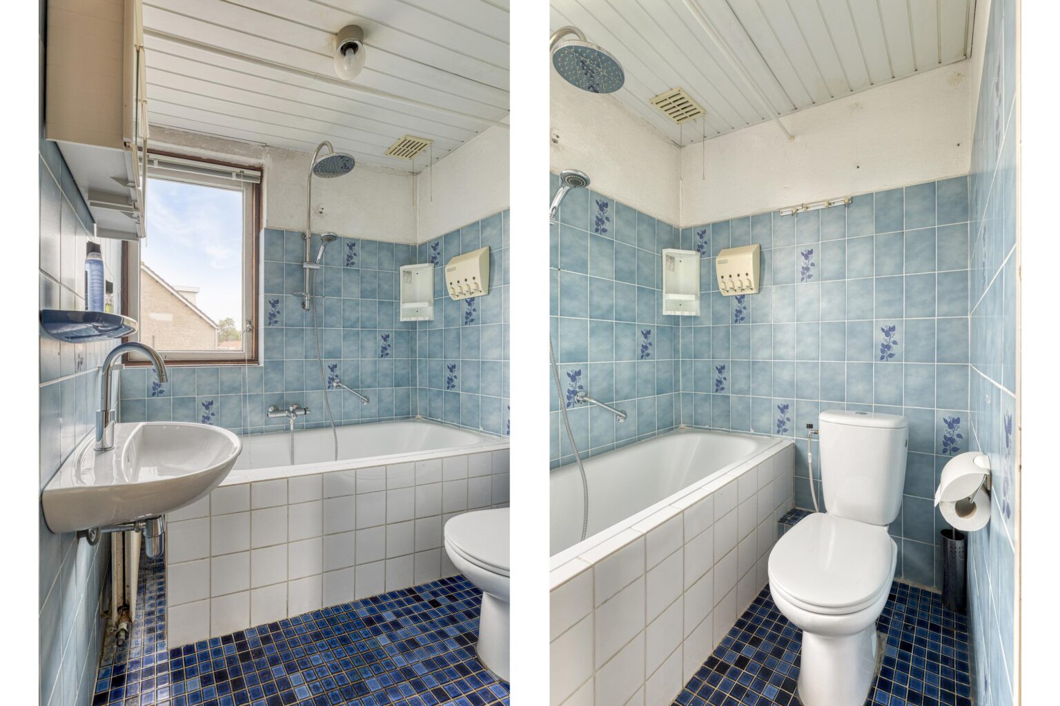 De badkamer is deels betegeld en biedt een bad, closet en wastafel.