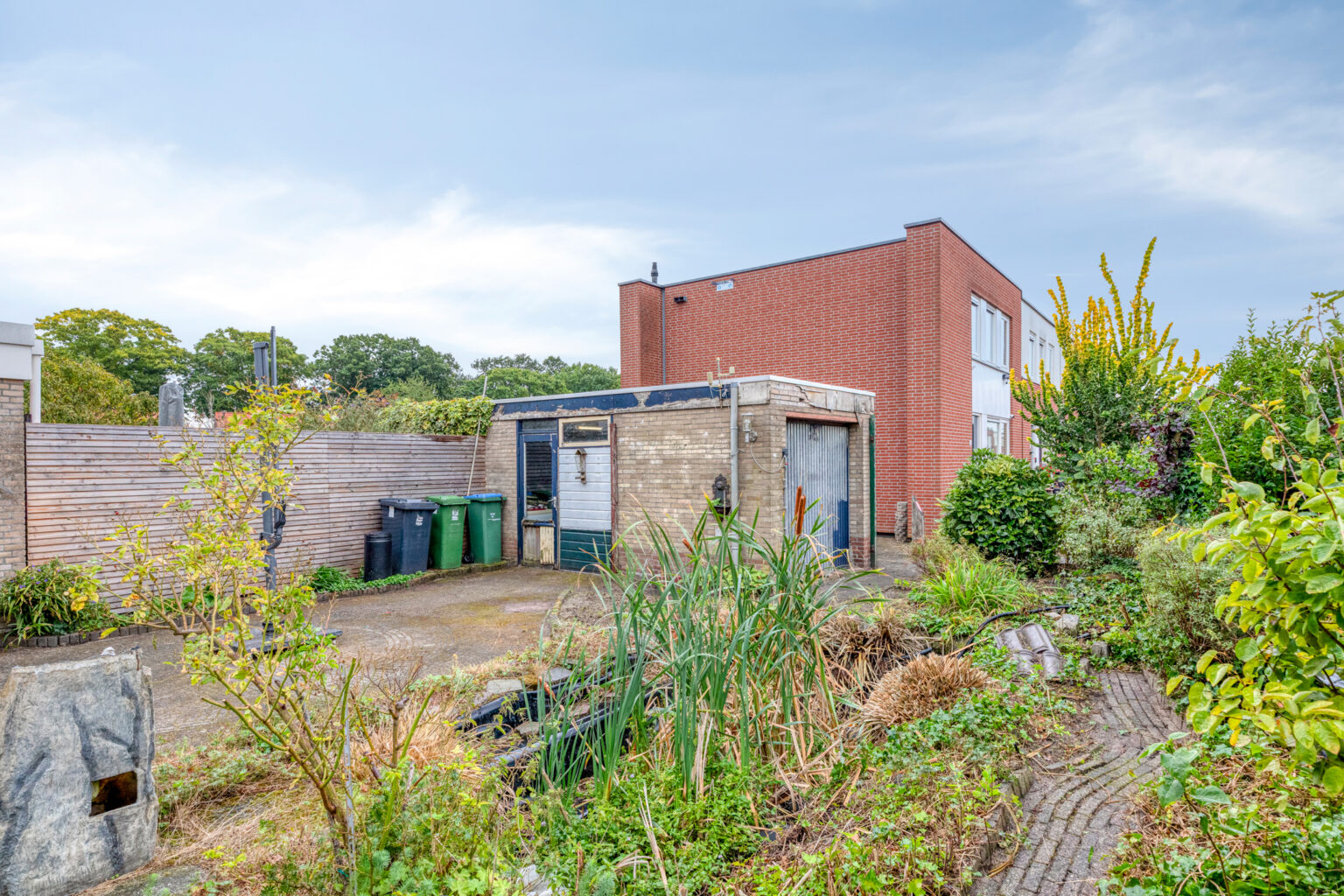 De achtertuin biedt bestrating, beplanting, een vijver en aan de achterzijde tref je de garage met de oprit.
