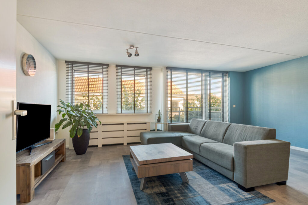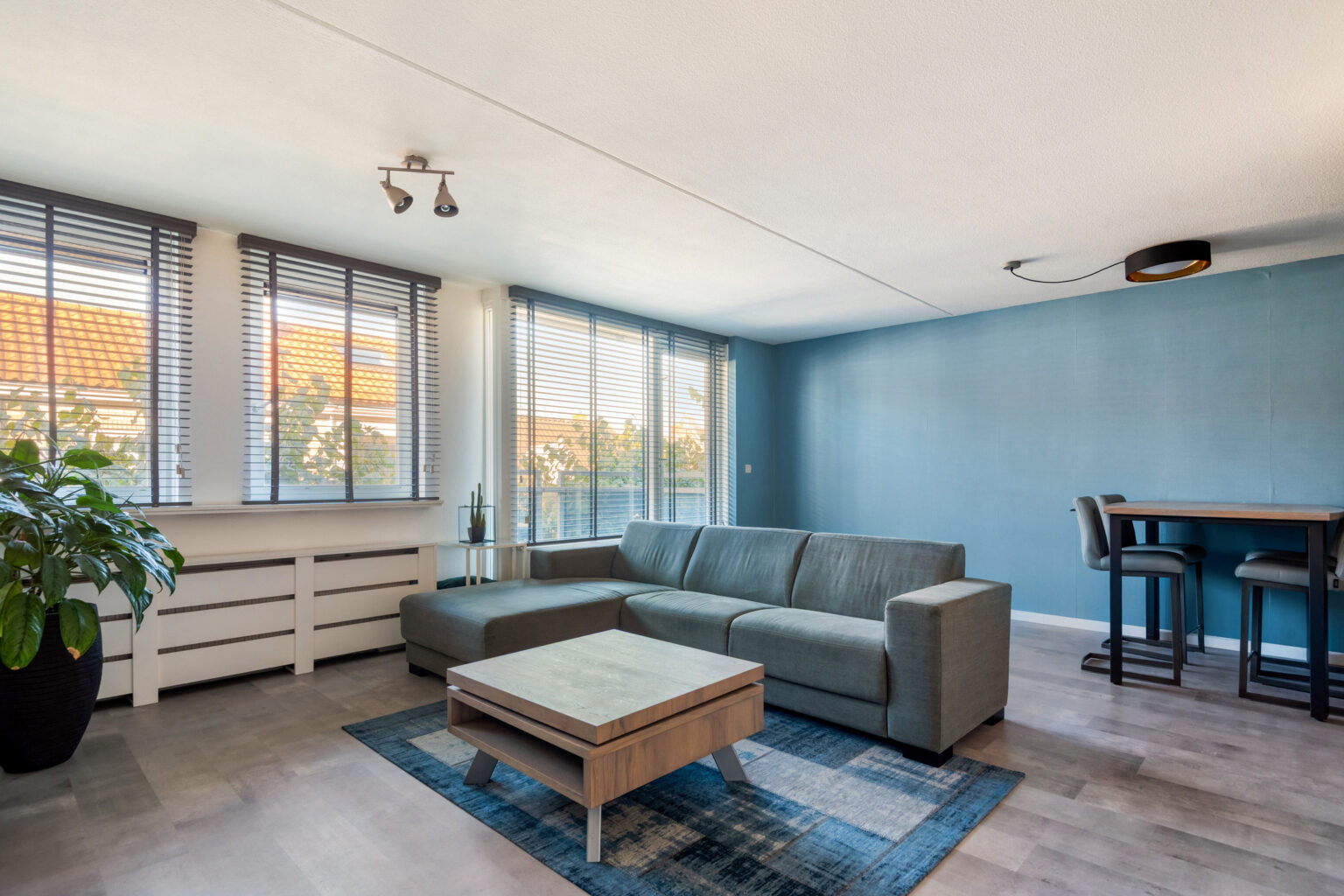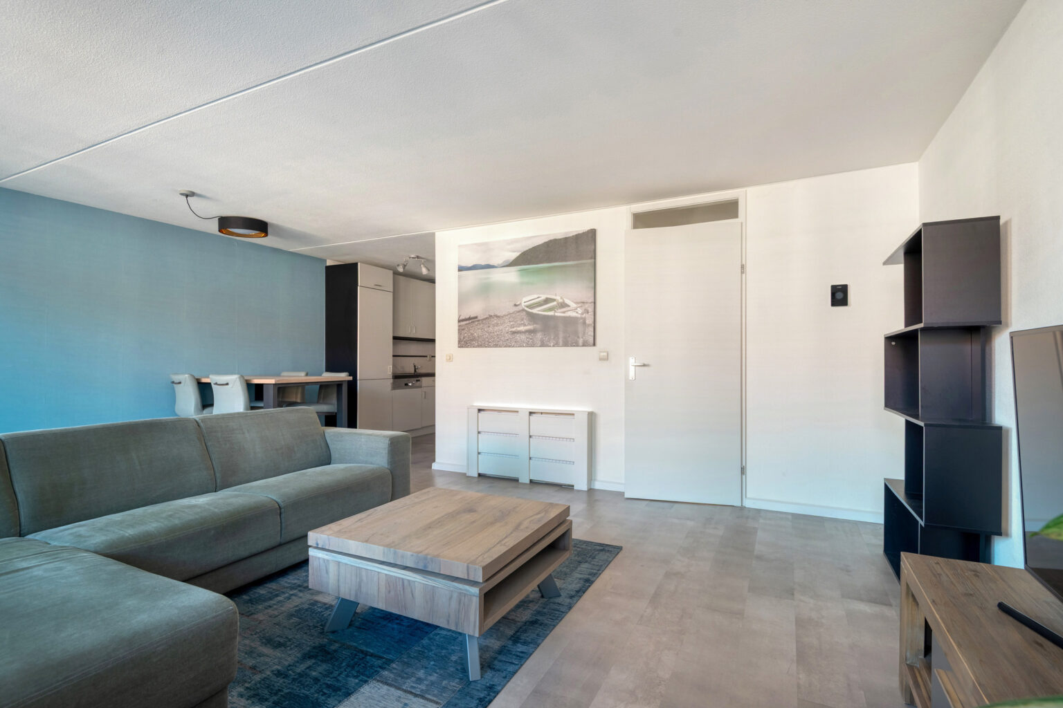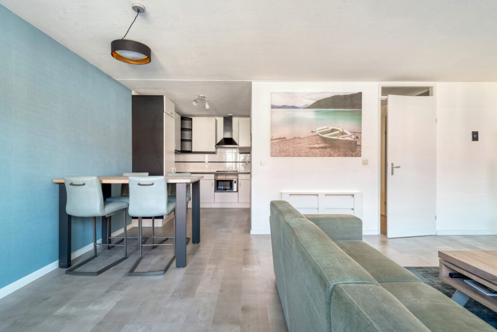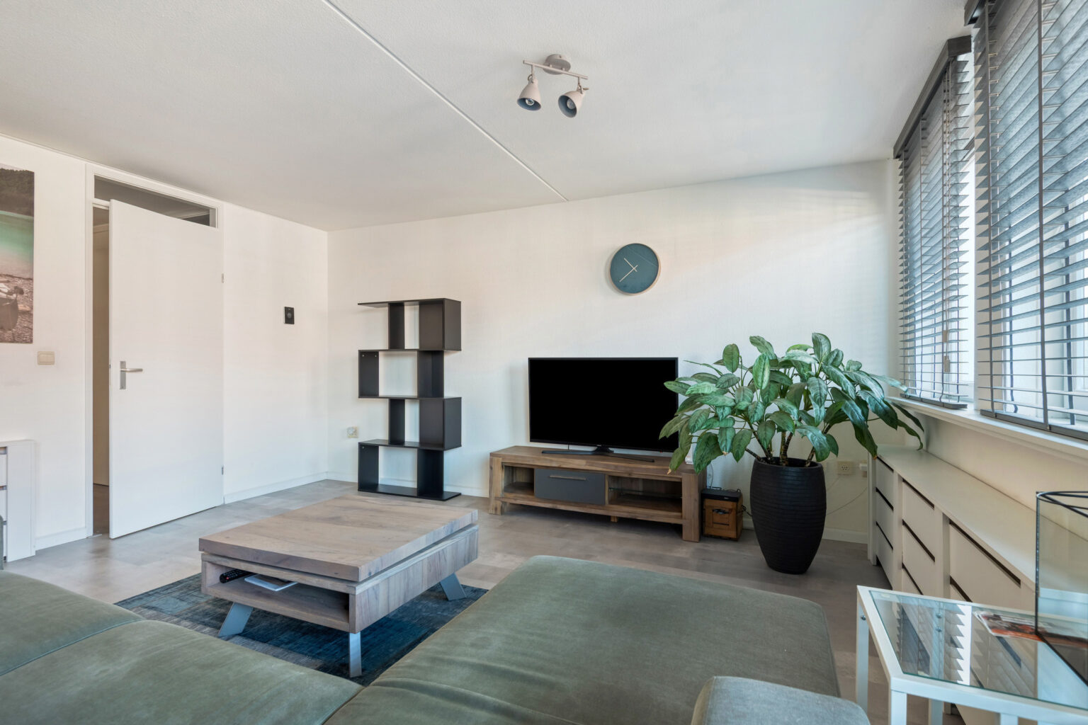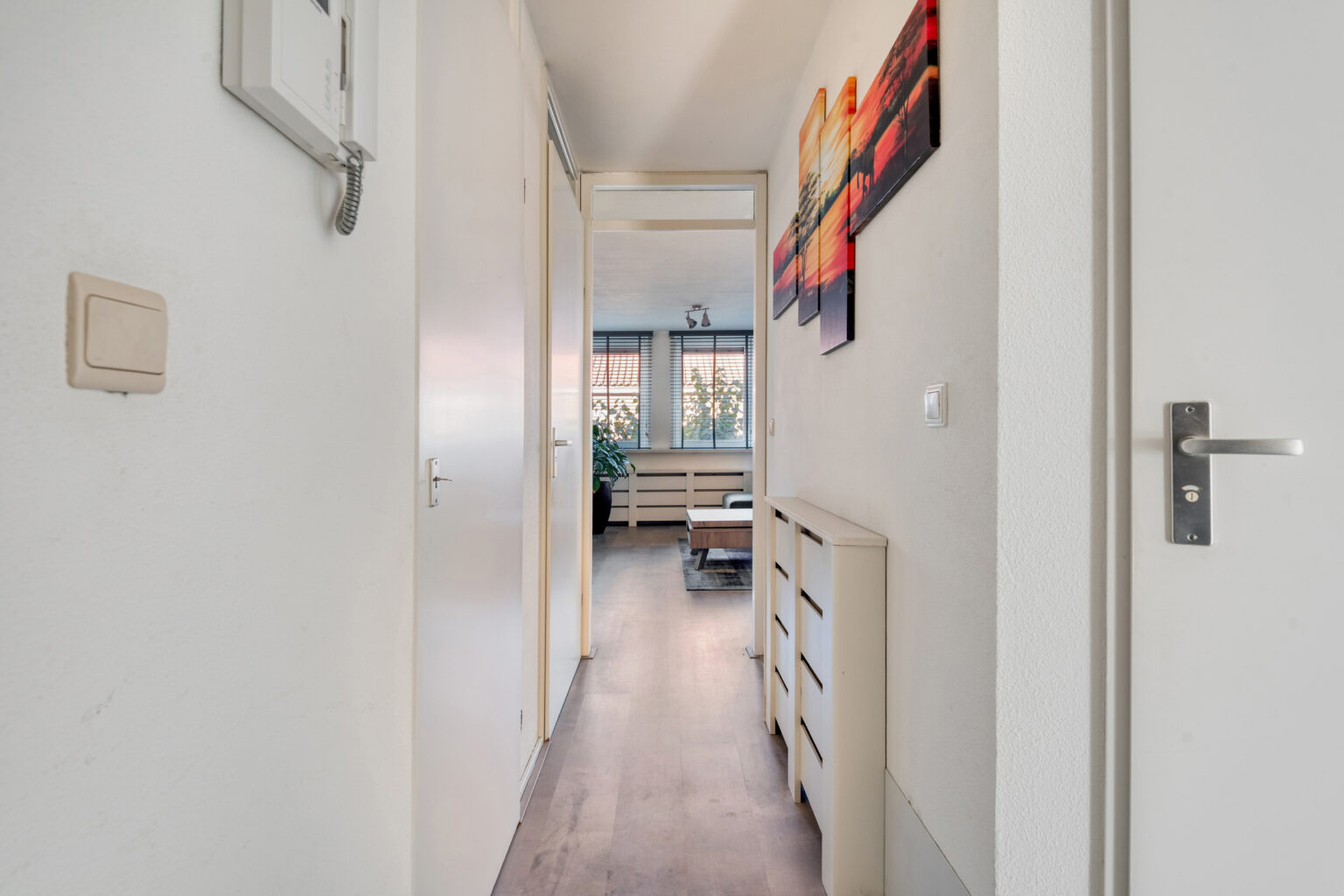 Bij binnenkomst in de hal vind je toegang tot de woonkamer met open keuken, 2 slaapkamers, badkamer, toilet en cv-ruimte. De grote ramen zorgen voor een lichte, prettige woonkamer en de afwerking is mooi met een laminaat vloer en behangen wanden.