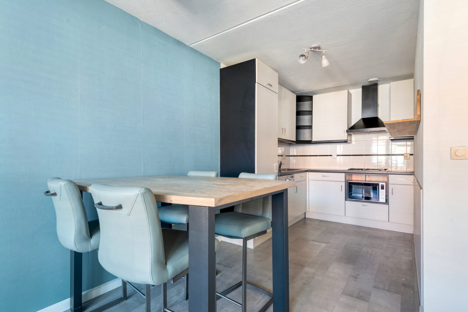 De open keuken is uitgerust met een 4-pits gaskookplaat, afzuigkap, vaatwasser, combimagnetron, koel/vrieskast en diverse kasten.