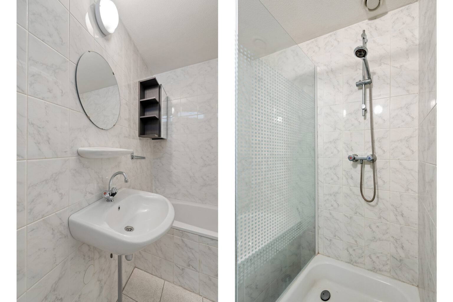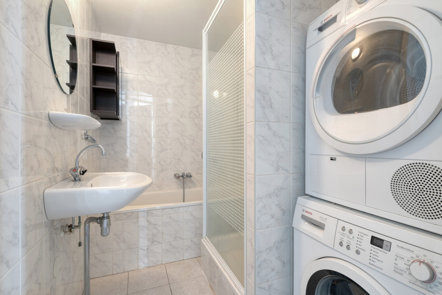 De badkamer is geheel betegeld en voorzien van een ligbad, douche, wastafel en aansluiting voor de wasapparatuur. Het aparte toilet is deels betegeld en heeft een fontein.