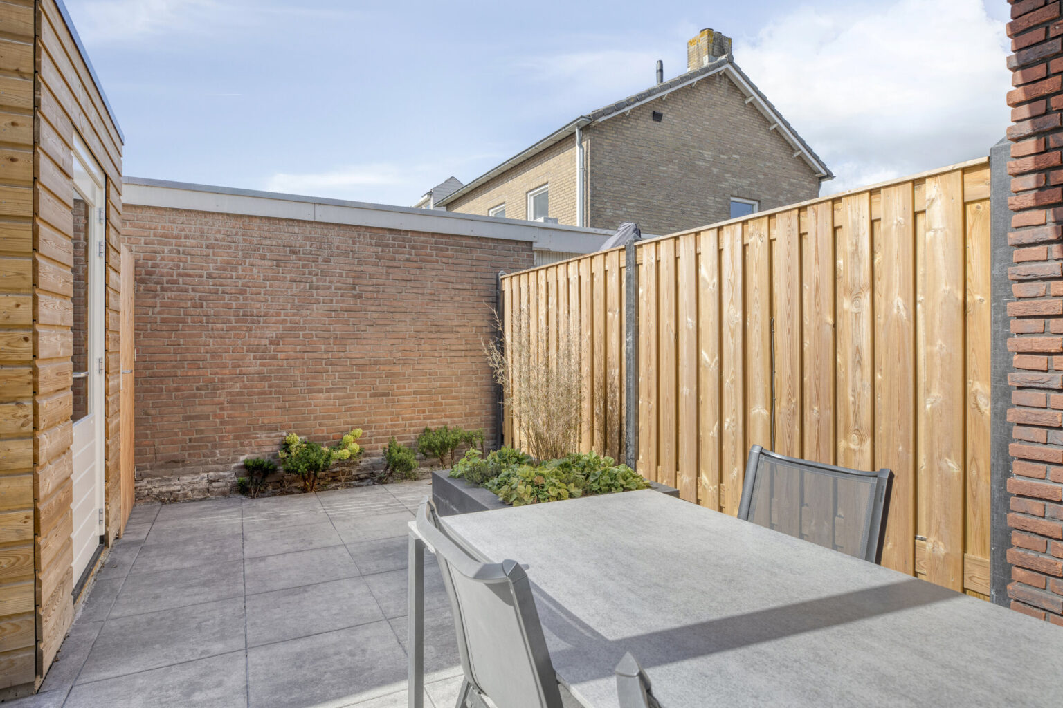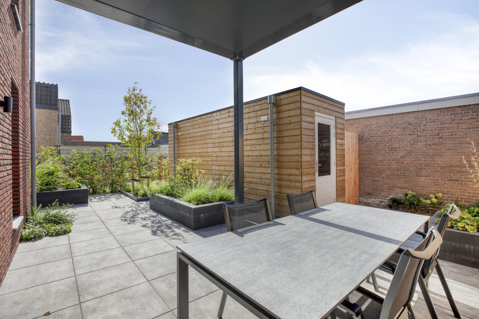 Je kunt door de ligging op het zuidoosten altijd ergens genieten van het zonnetje of van de schaduw. Achterin staat een nette houten berging – perfect voor de fietsen of het tuingereedschap – en via de handige poort loop je zo de achterzijde uit. Daar vind je direct de bijbehorende parkeerplaats.