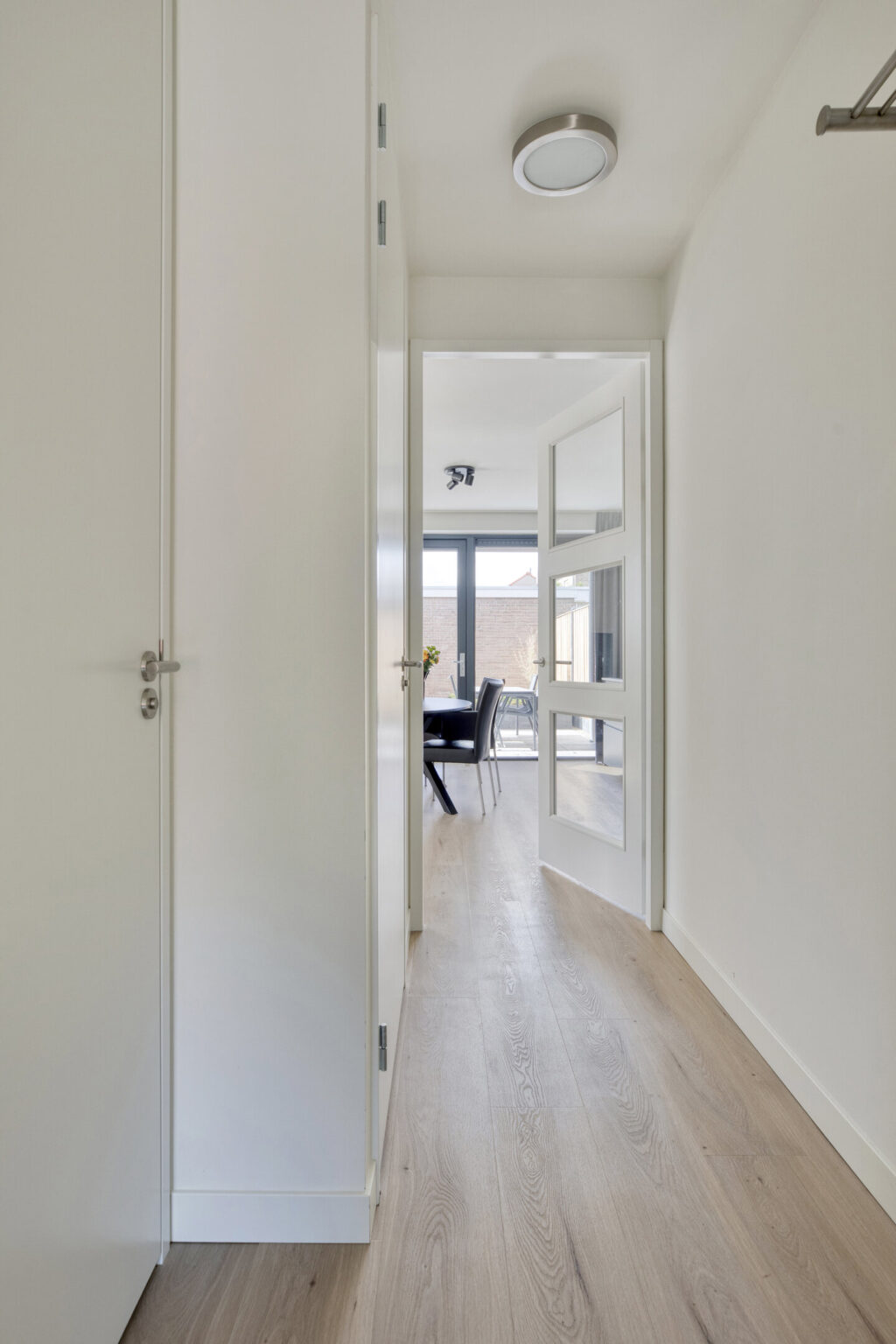 De hal biedt toegang tot de meterkast, slaapkamer 1, badkamer en de woonkamer met open keuken.