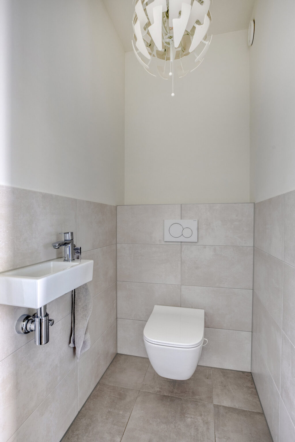 Het separaat toilet is deels betegeld en biedt een hangcloset en fontein.