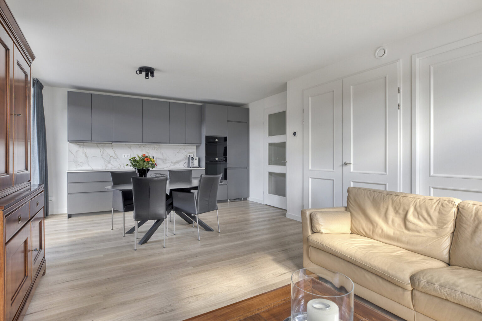 De woonkamer is bijzonder licht dankzij de grote raampartijen rondom. Hierdoor geniet je de hele dag van veel natuurlijk licht en fraai zicht op de tuin. De strakke wanden en pvc-vloer geven de ruimte een moderne, rustige uitstraling.