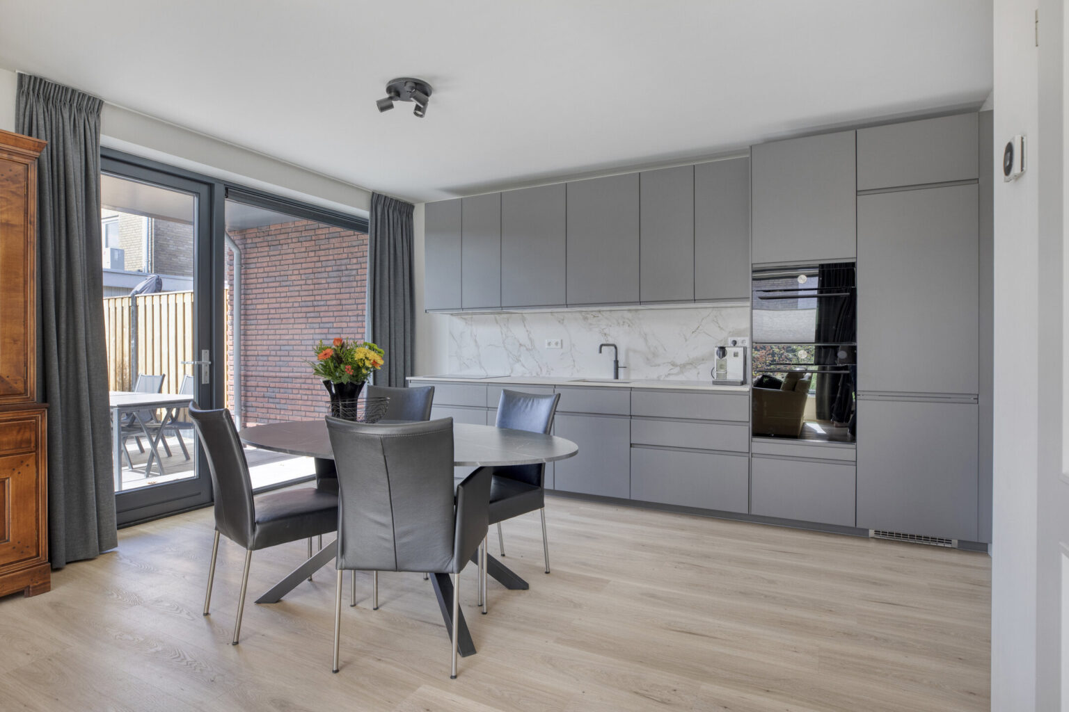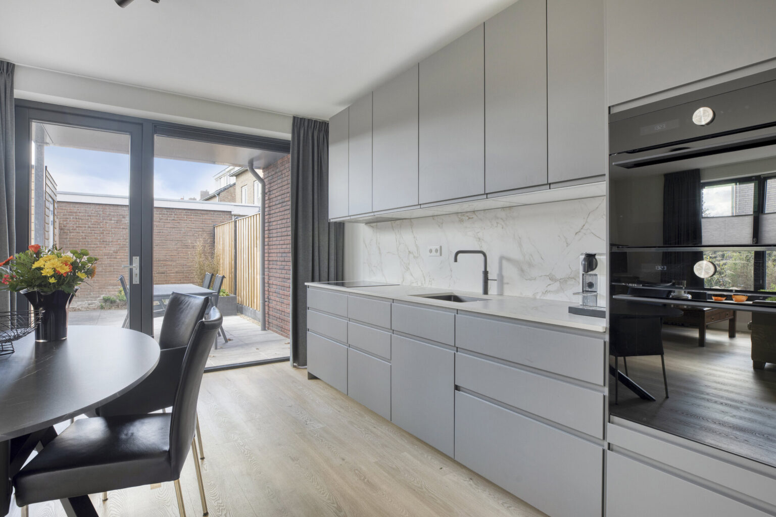 De trendy keuken is volledig uitgerust met een 4-pits inductiekookplaat, afzuigkap, combi-oven, oven, koelkast, vriezer, vaatwasser en Quooker. Koken wordt hier een plezier, terwijl de open opzet contact met de woonkamer behoudt.