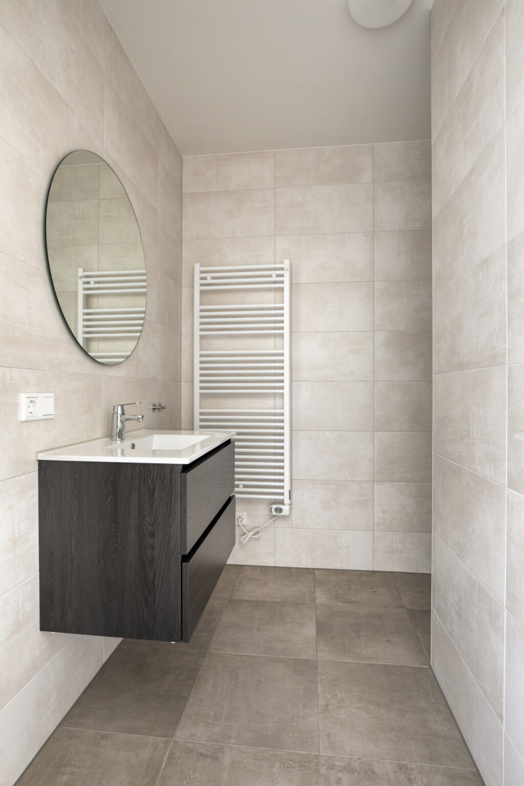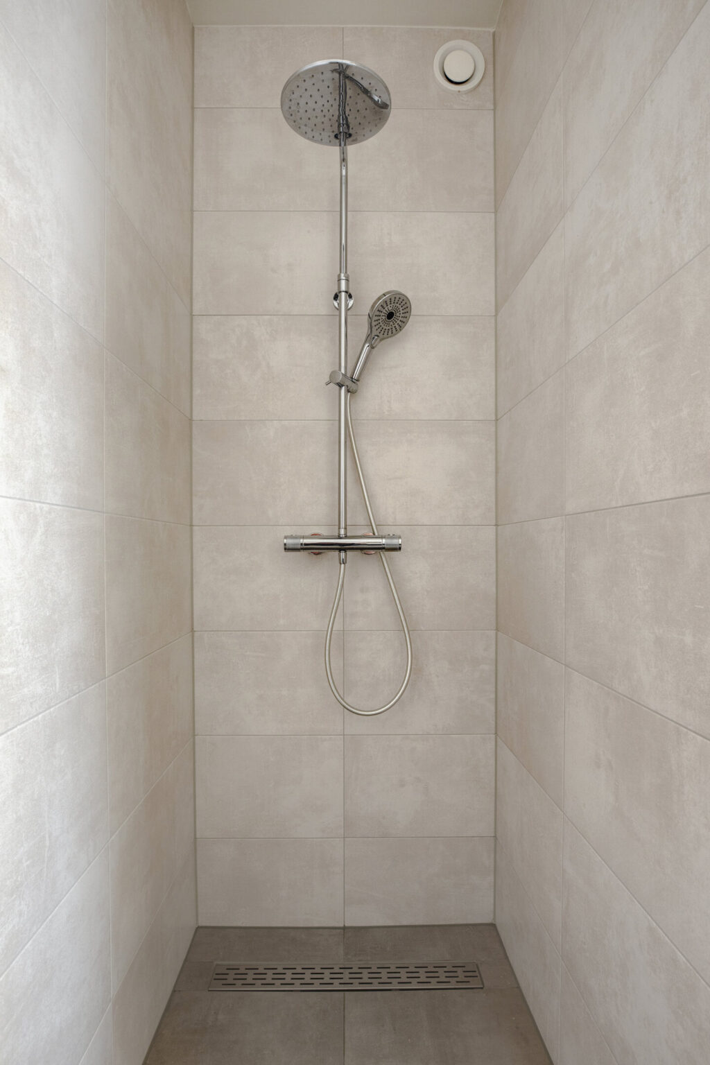 De sfeervolle badkamer is volledig betegeld en uitgerust met een inloopdouche en een mooi wastafelmeubel.