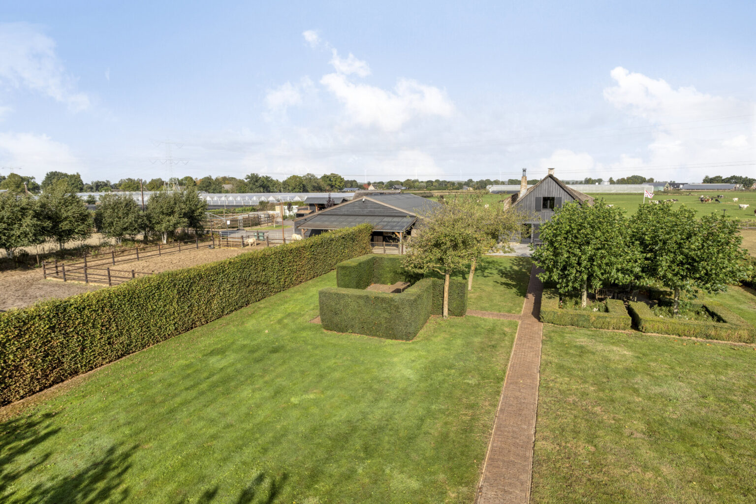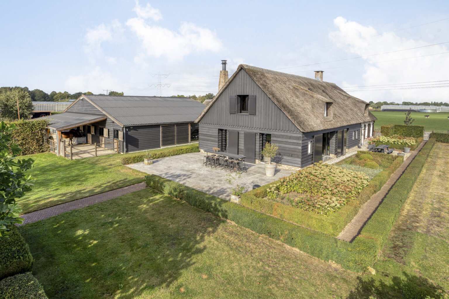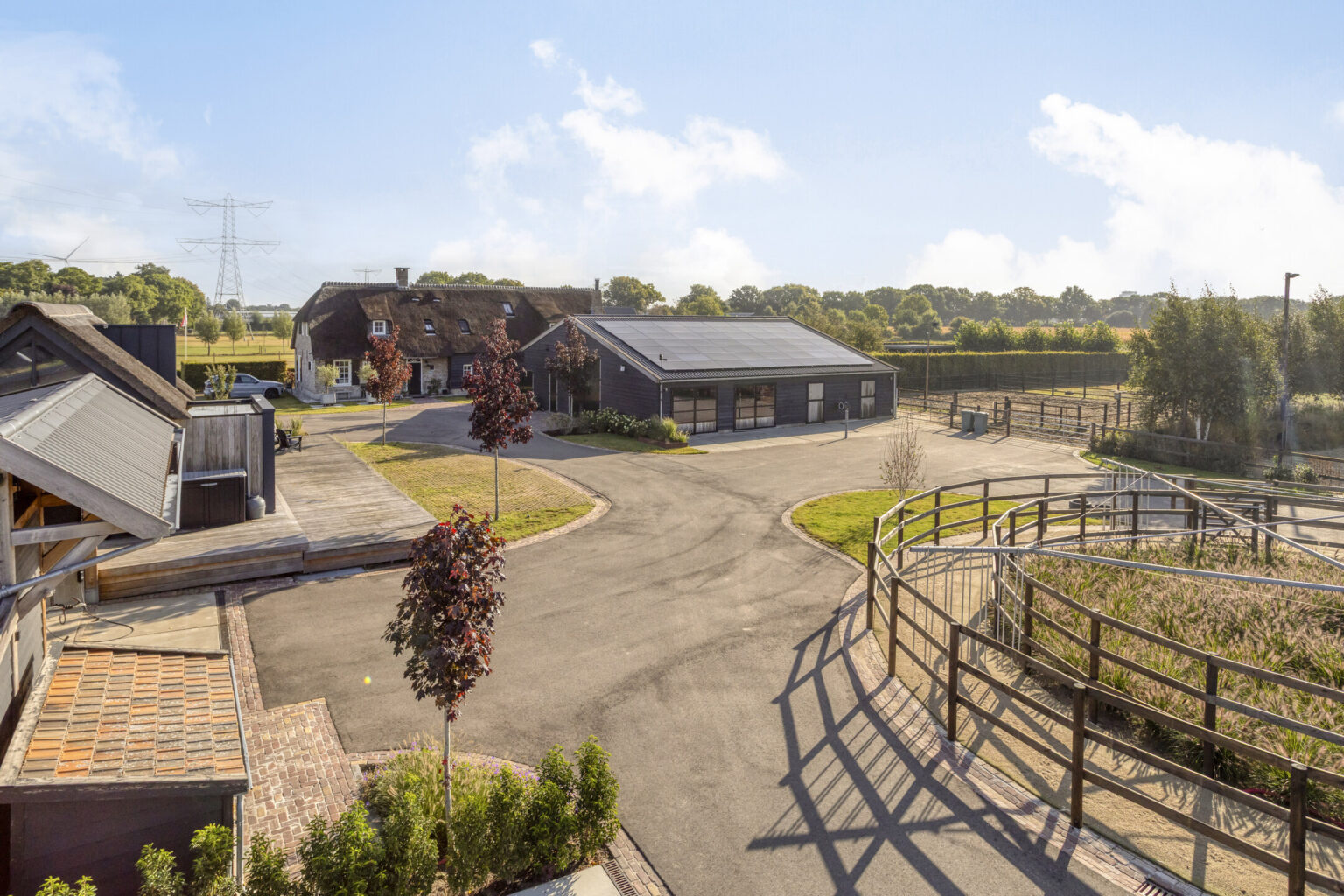 Voor paardenliefhebbers is dit een echte droomlocatie: het terrein beschikt over een professioneel aangelegd paardencomplex met stallen, stapmolen, rijbak, longeercirkel en ruime paddock, omgeven door goed onderhouden weilanden.