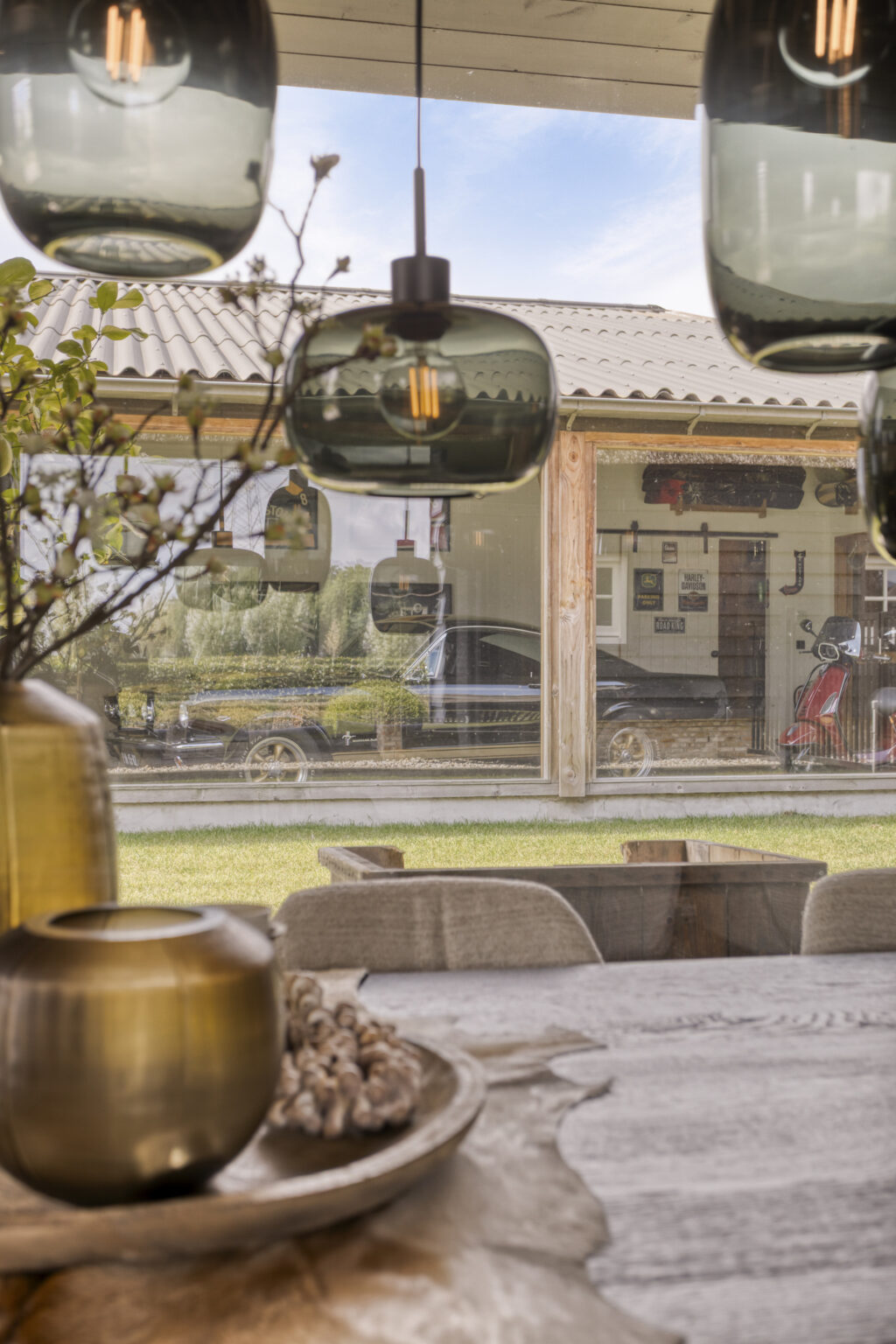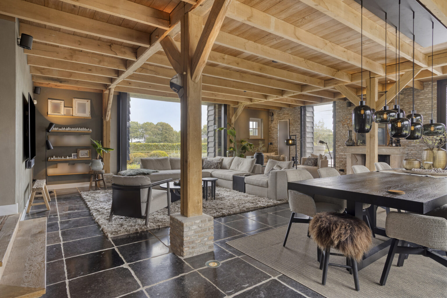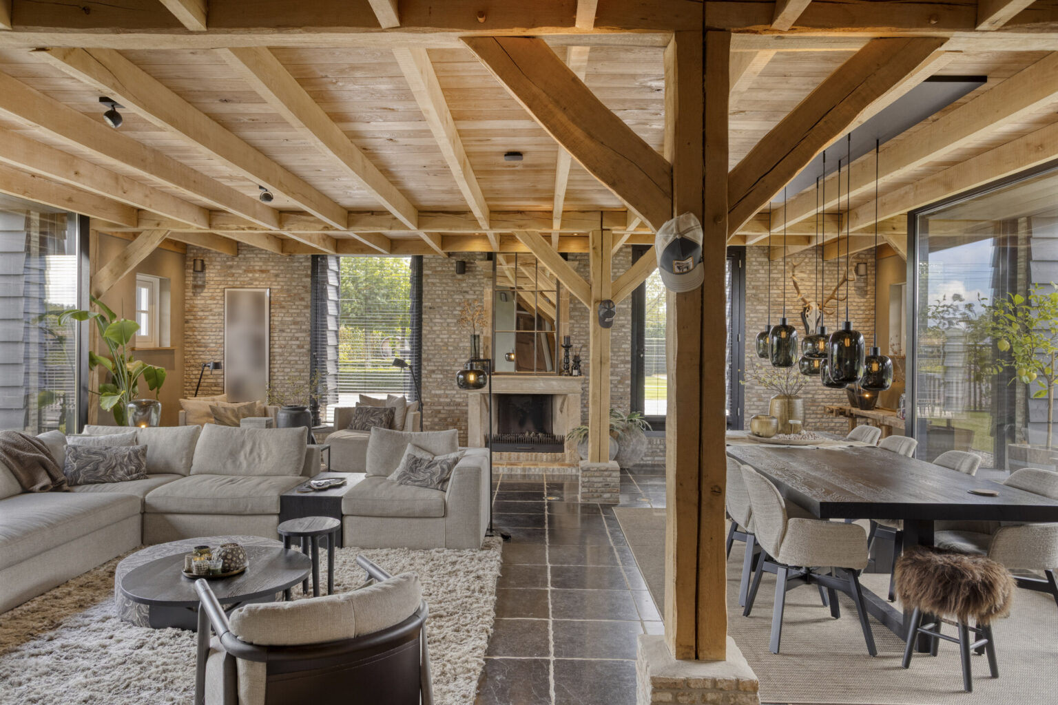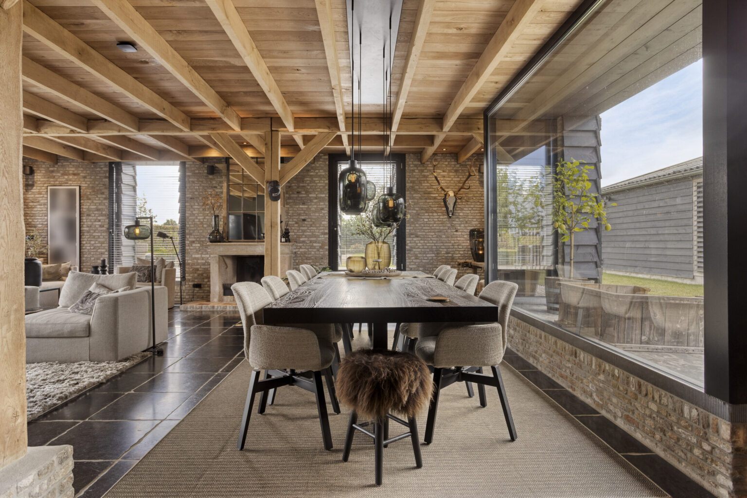 Grote ramen en een directe doorgang naar het terras laten het buitenleven naadloos aansluiten op het interieur.