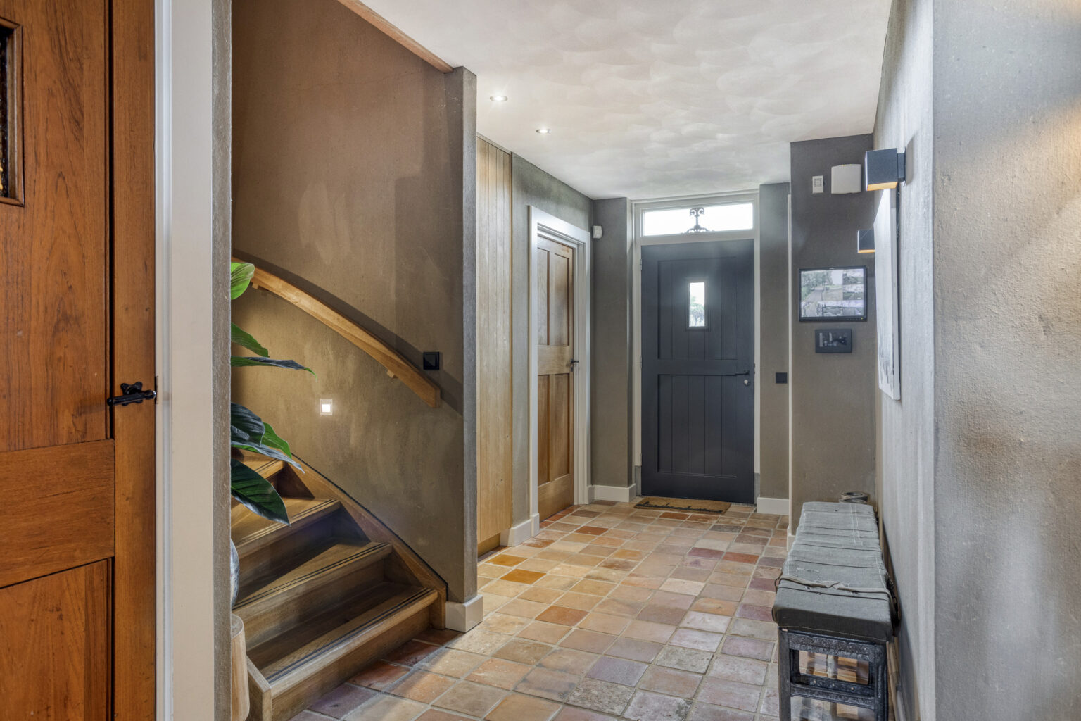 Bij binnenkomst valt meteen de ruime, sfeervolle hal op, die toegang biedt tot de woonkamer, woonkeuken, bijkeuken, kantoorruimte, opkamer en kelder.