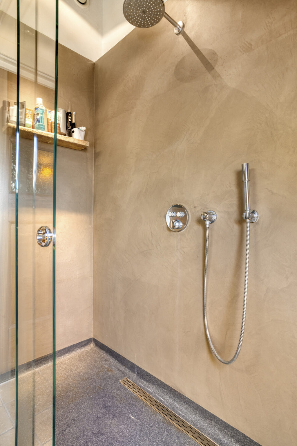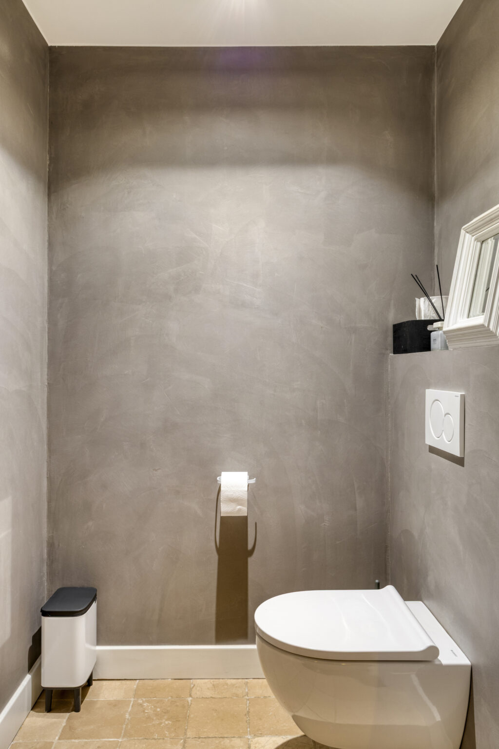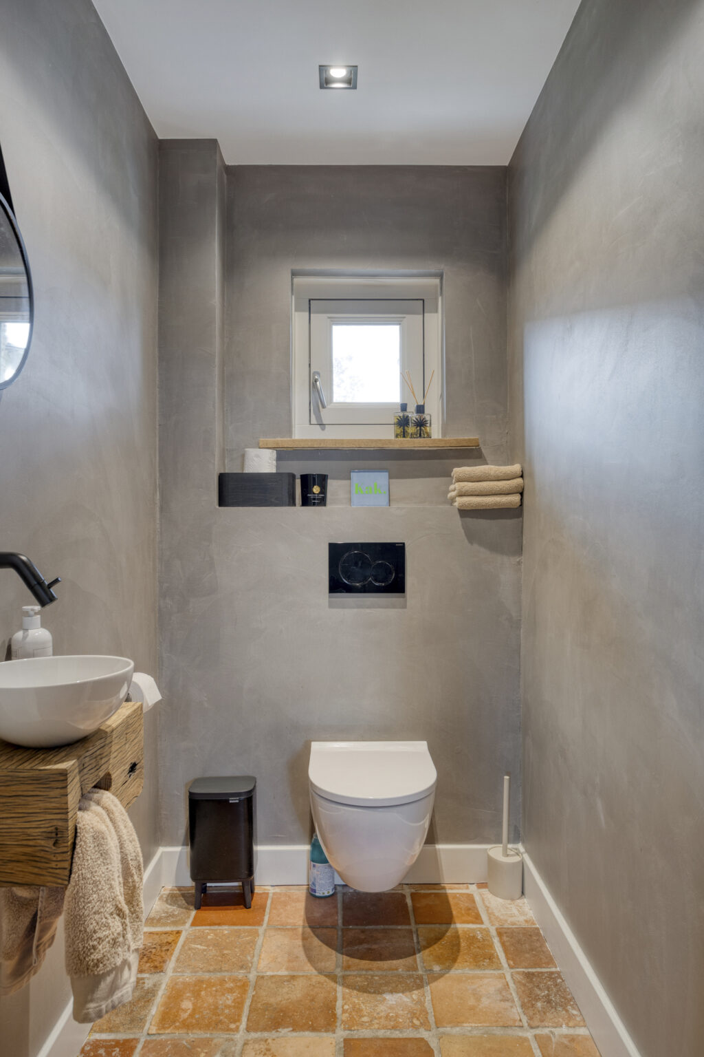 Het separate toilet is voorzien van beton cire en een hangcloset en fontein.