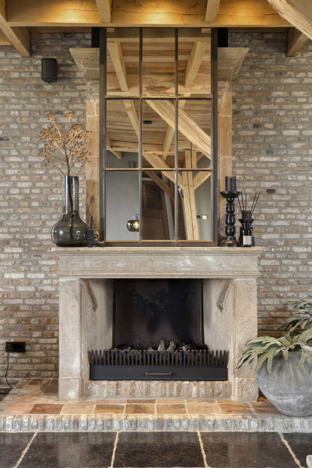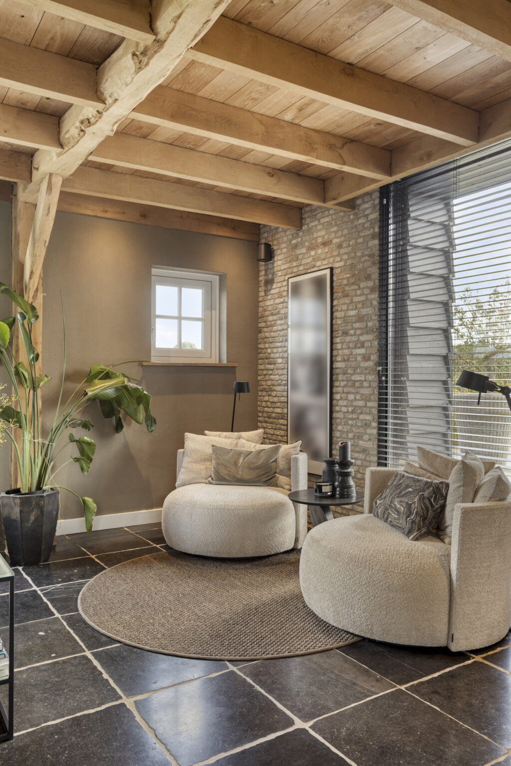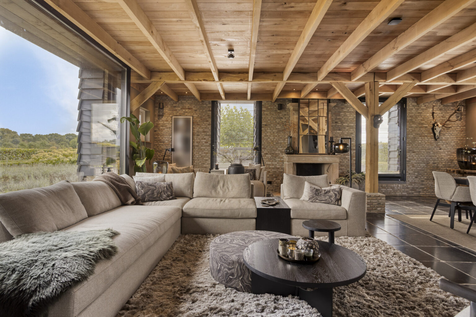 De woonkamer straalt warmte en karakter uit dankzij het prachtige balkenplafond, de sfeervolle gashaard en de combinatie van leemstuc en schoonmetselwerk wanden.