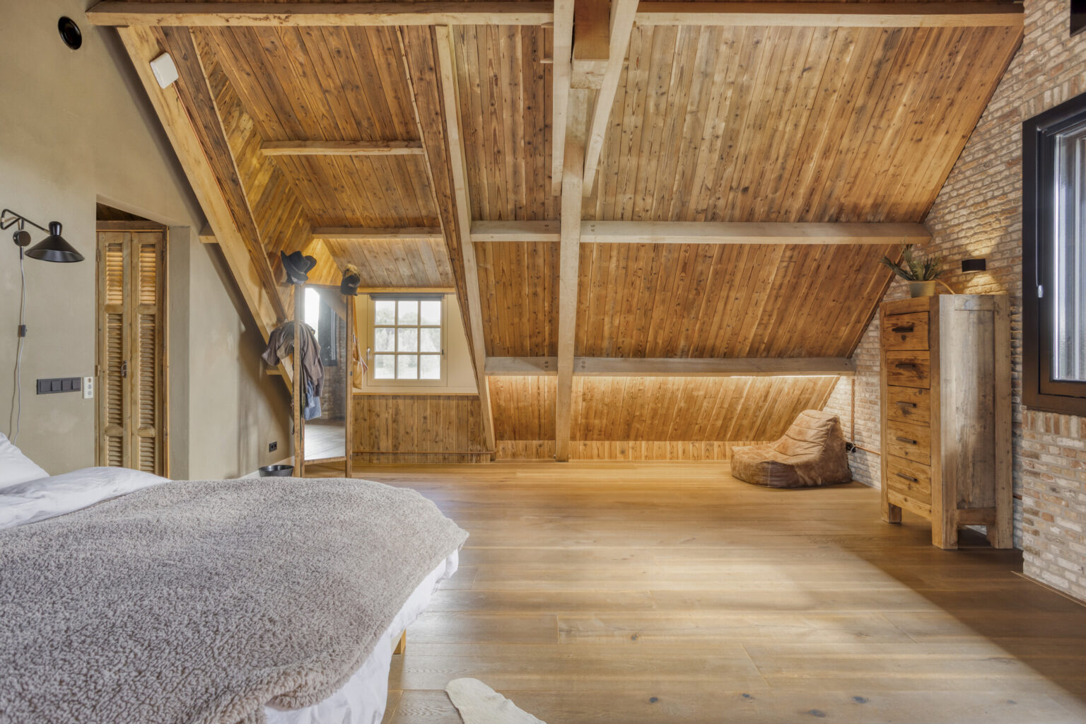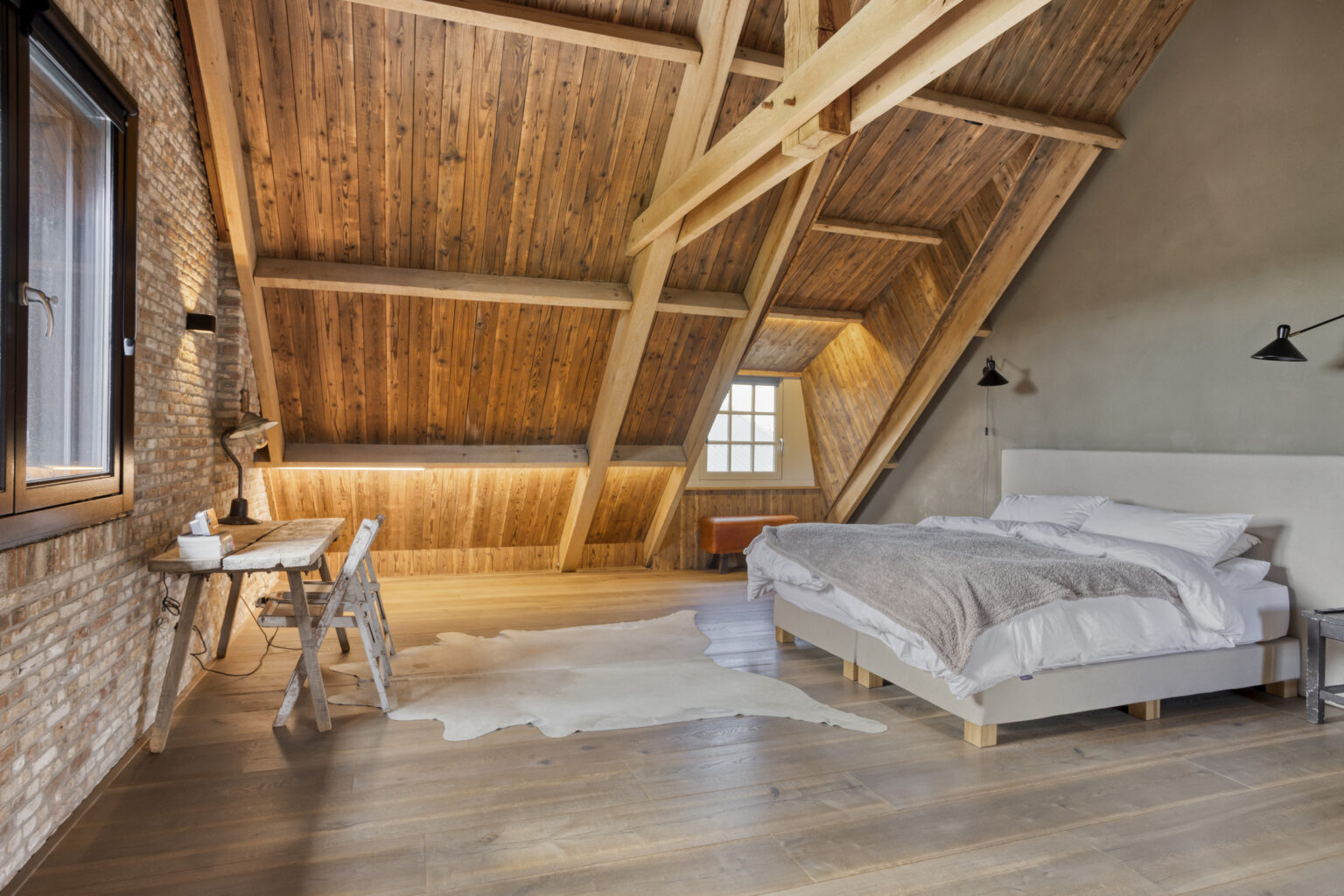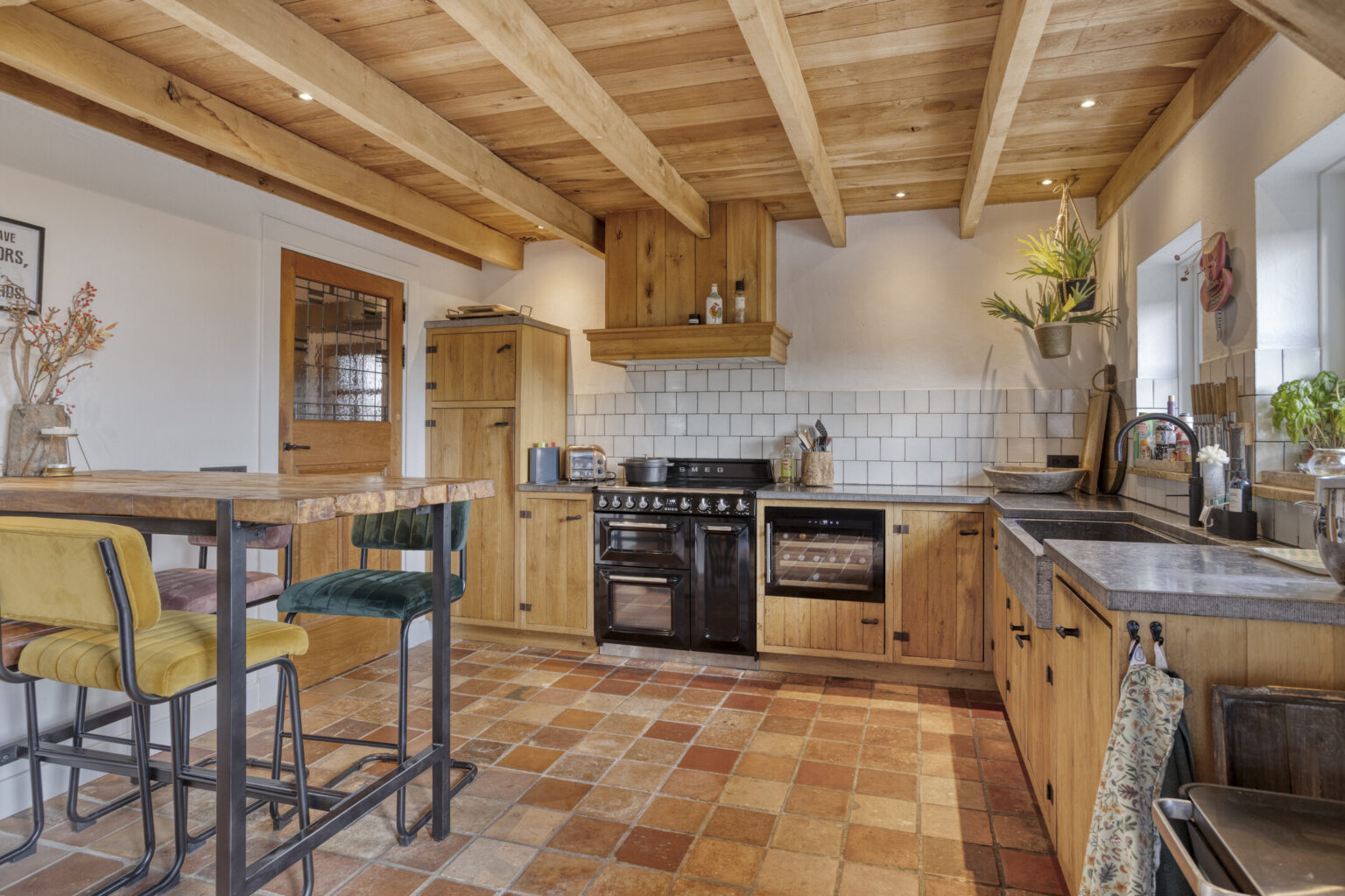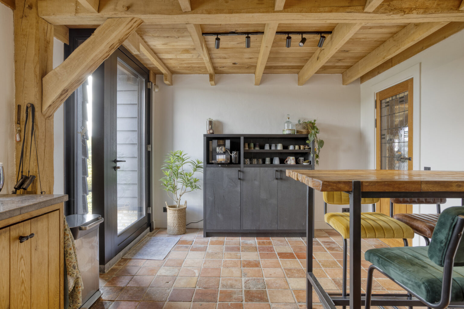 houten balken en dakplaten waardoor een unieke, sfeervolle woning is gecreëerd;