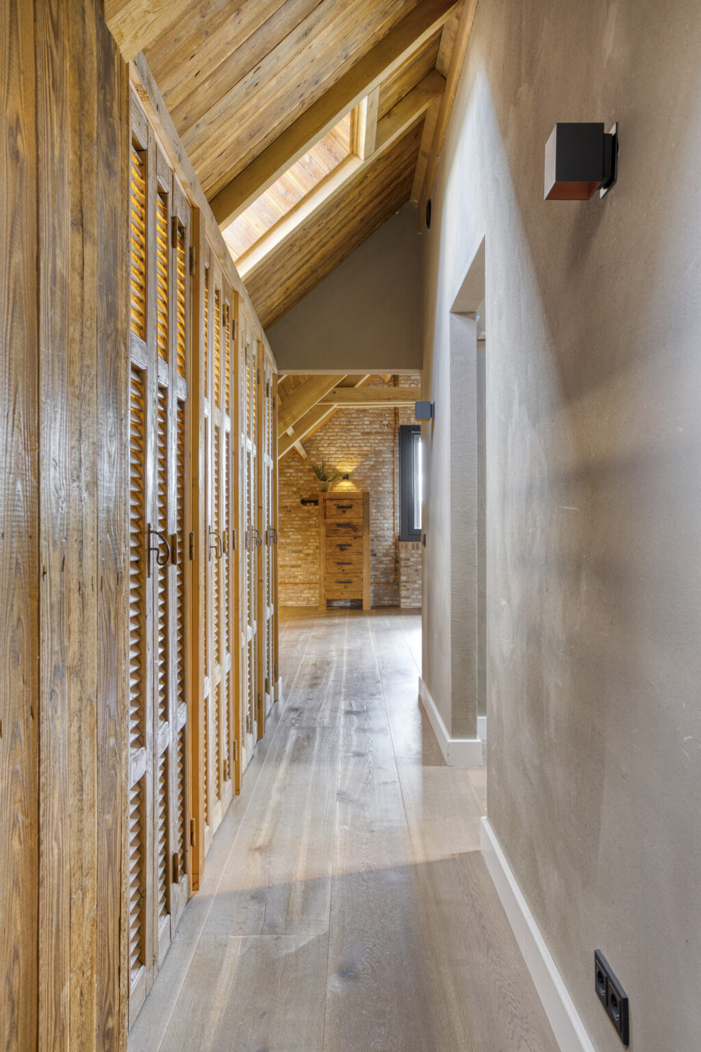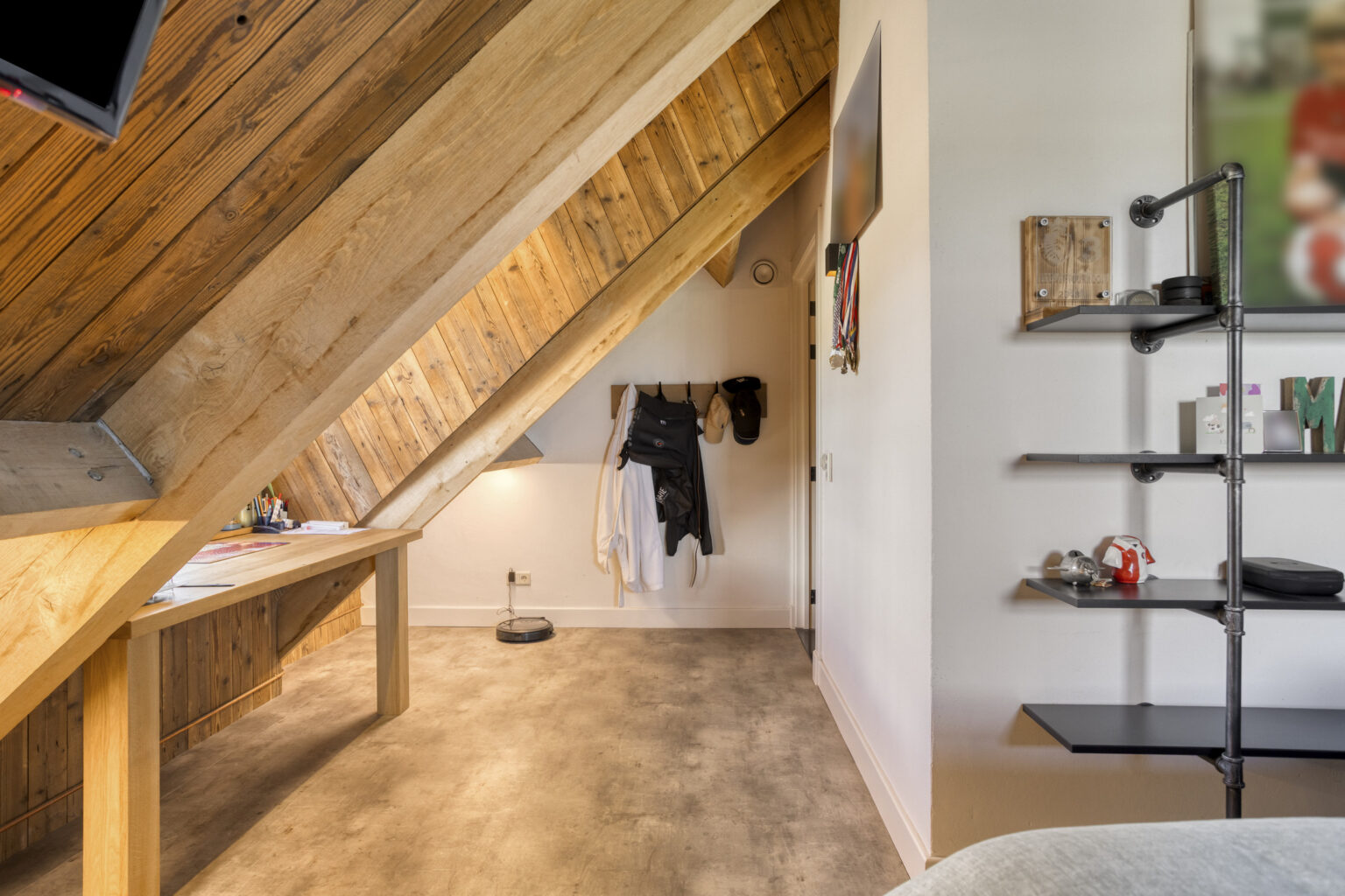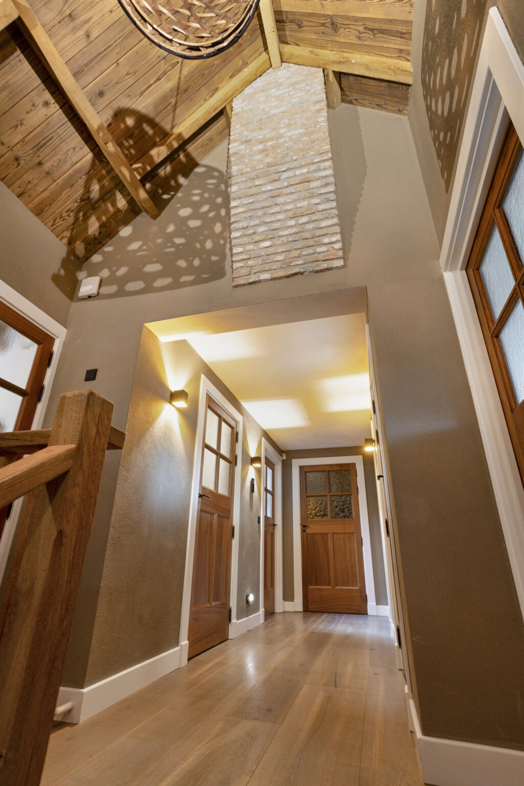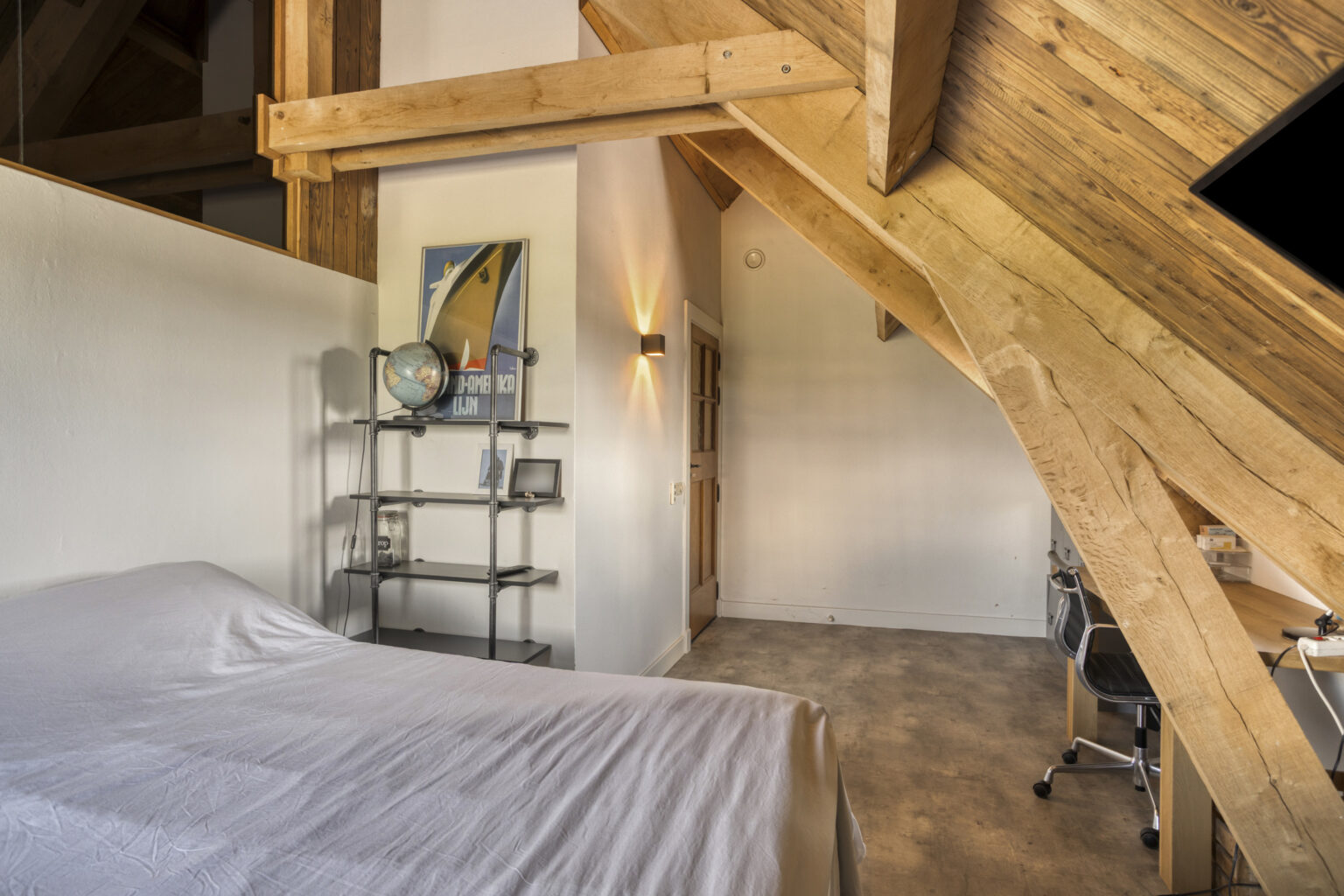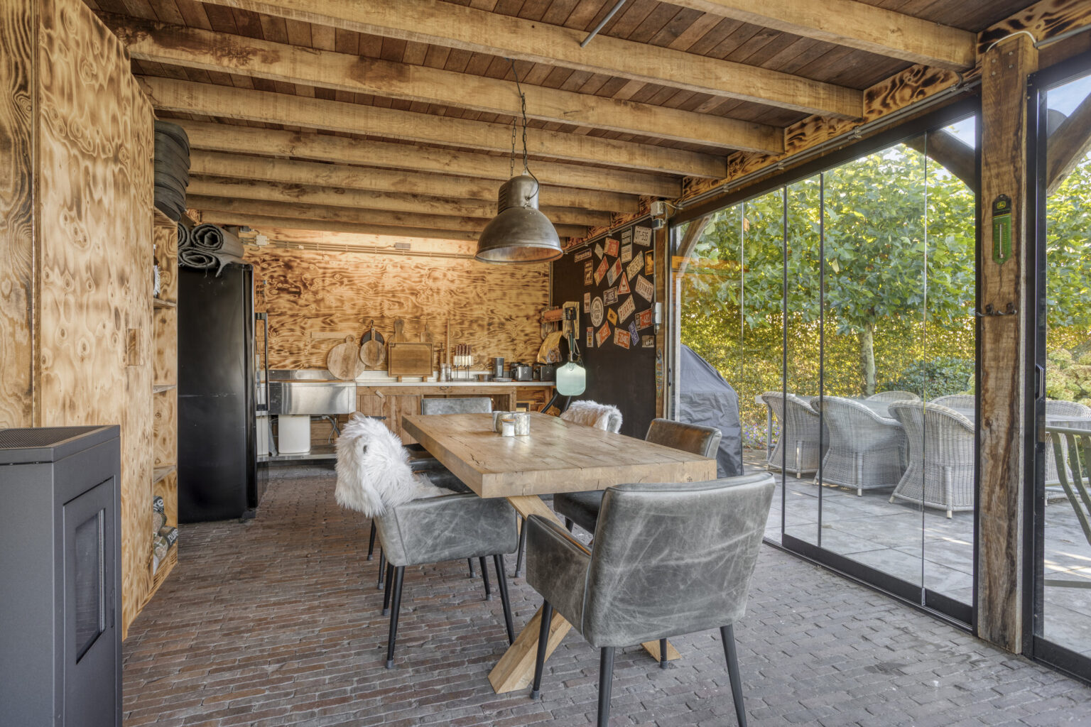 houten balken en dakplaten waardoor een unieke, sfeervolle woning is gecreëerd;