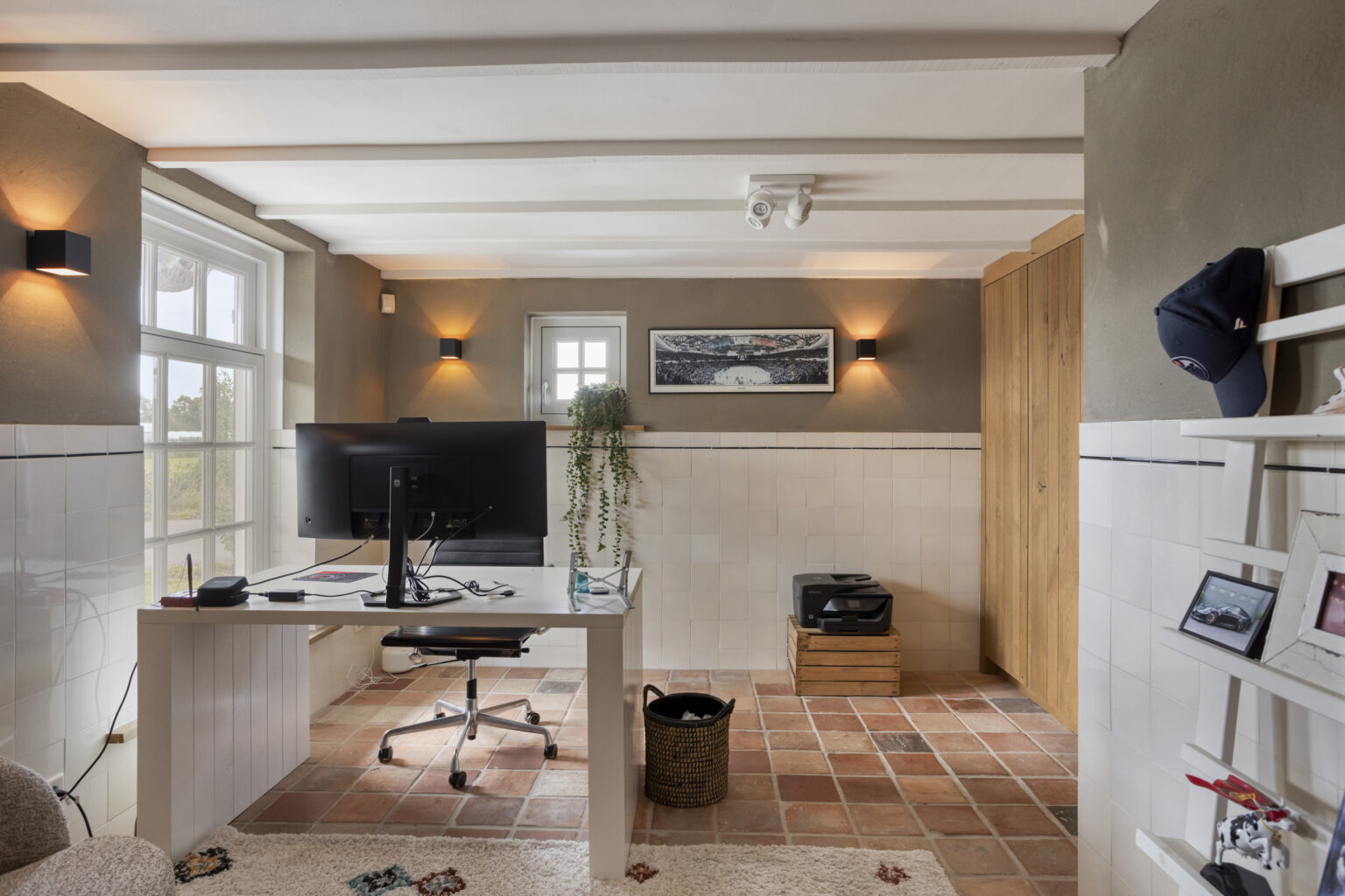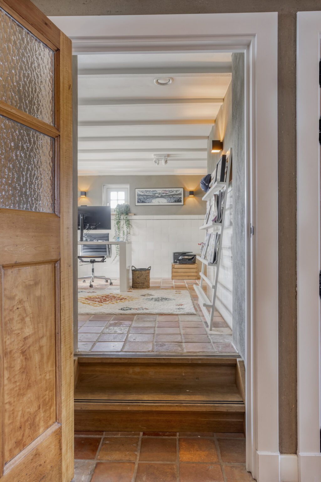 Een multifunctionele ruimte aan de voorzijde kan dienen als kantoor, hobbyruimte of extra slaapkamer, en de gezellige opkamer met authentieke spoelbak en balkenplafond voegt extra charme toe.