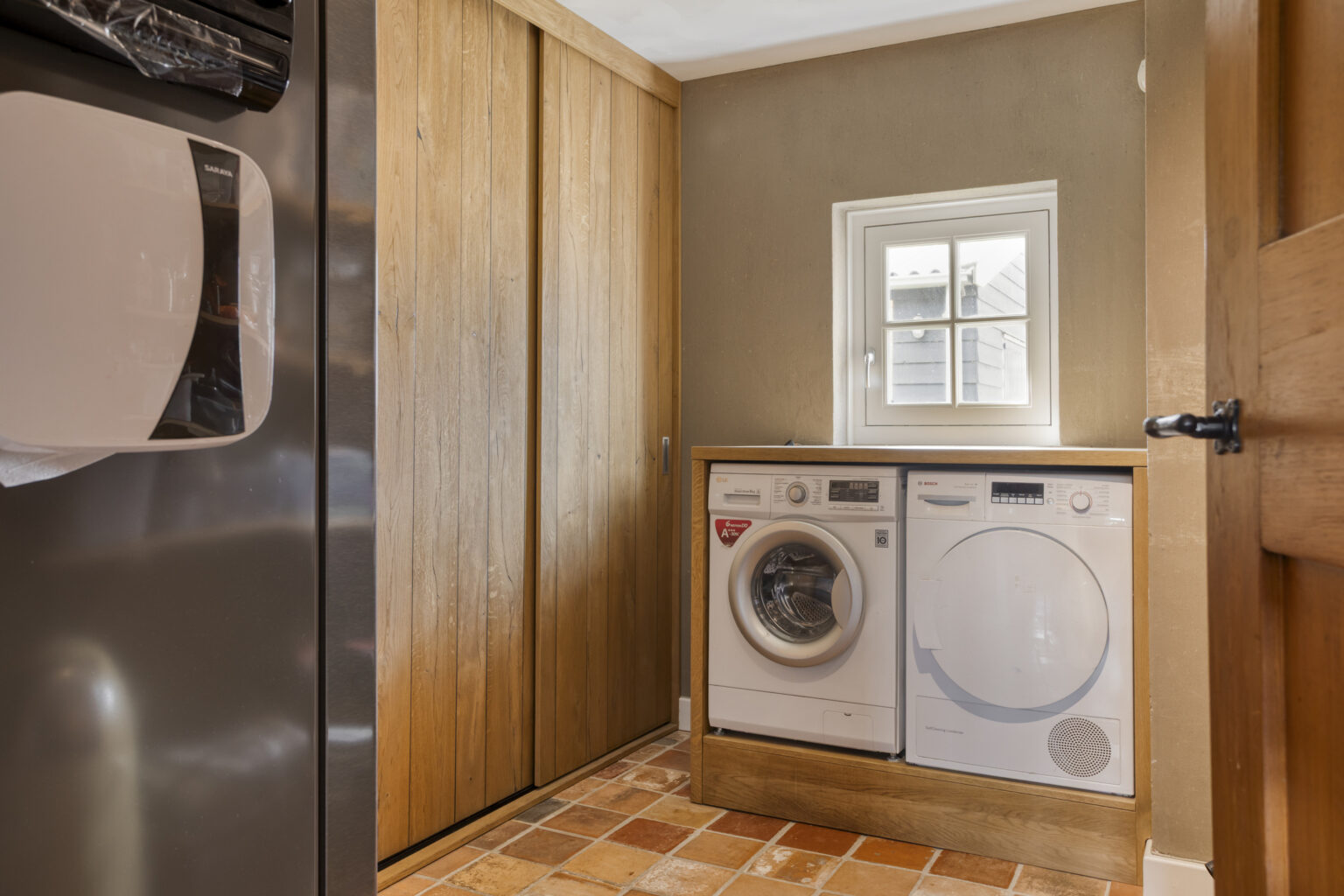 De bijkeuken biedt praktische bergruimte en herbergt de warmtepompinstallatie, terwijl de kelder extra opslagruimte biedt.