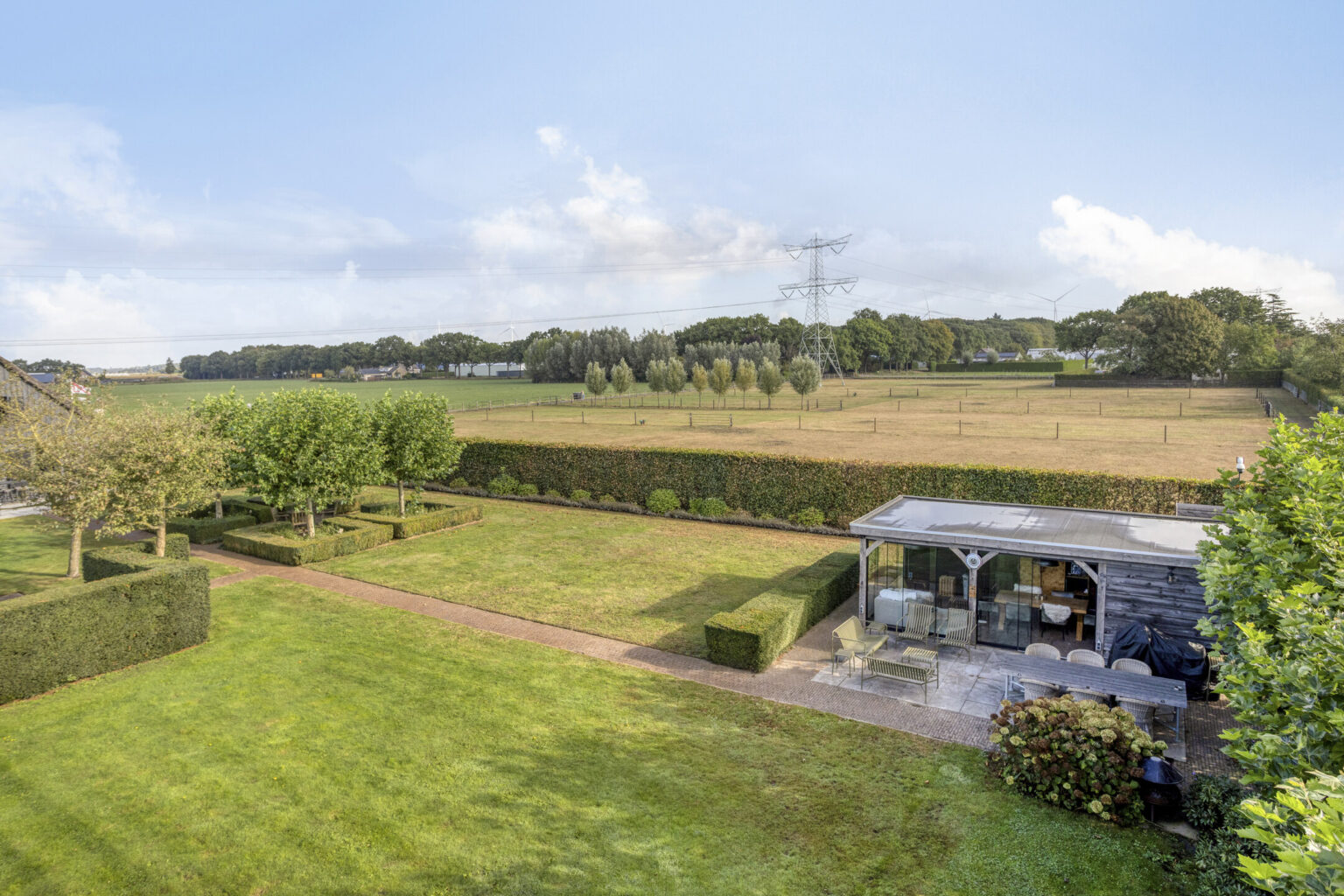 De diverse weilanden, voorzien van stroom en beregening, bieden een veilige en comfortabele omgeving voor uw paarden en maken dit landgoed tot een waar paradijs voor iedere paardenliefhebber.