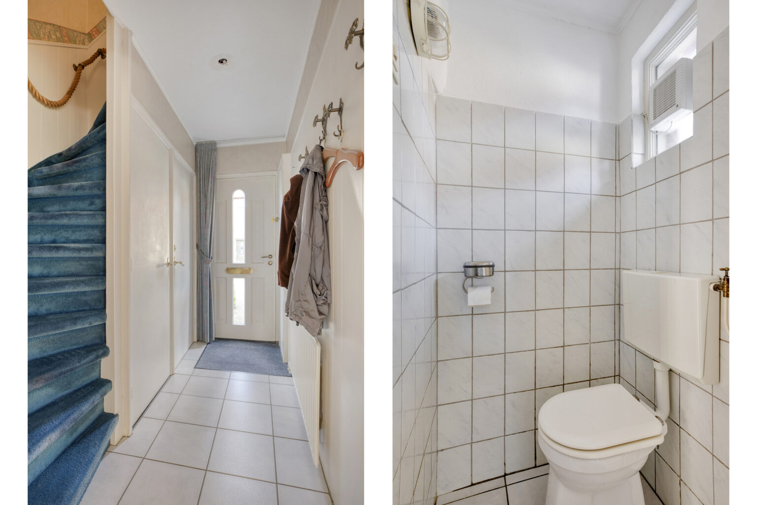 De entree van de woning biedt toegang tot de meterkast, het toilet, trapopgang, trapkast en de keuken.