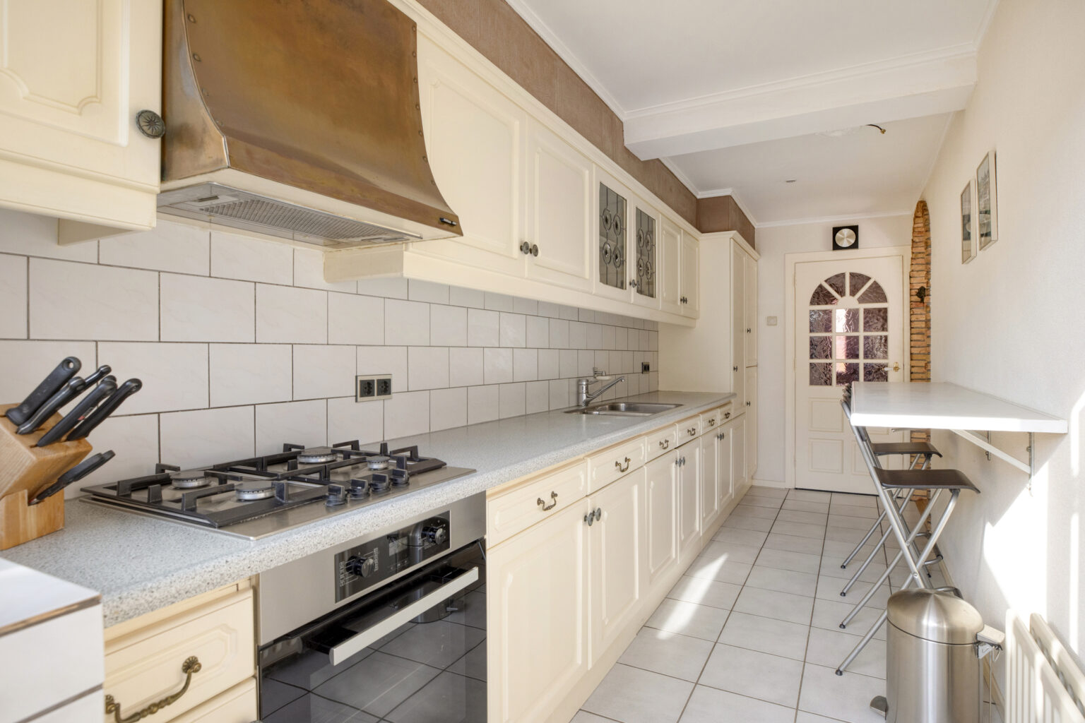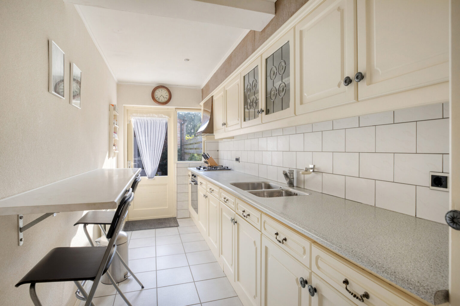 De keuken biedt plavuizen, deels betegelde wanden, stucplafond en je treft hier een 4-pits gasfornuis, afzuigkap, oven, vaatwasser, koel/vrieskast en diverse kasten. Een loopdeur leidt naar de tuin.