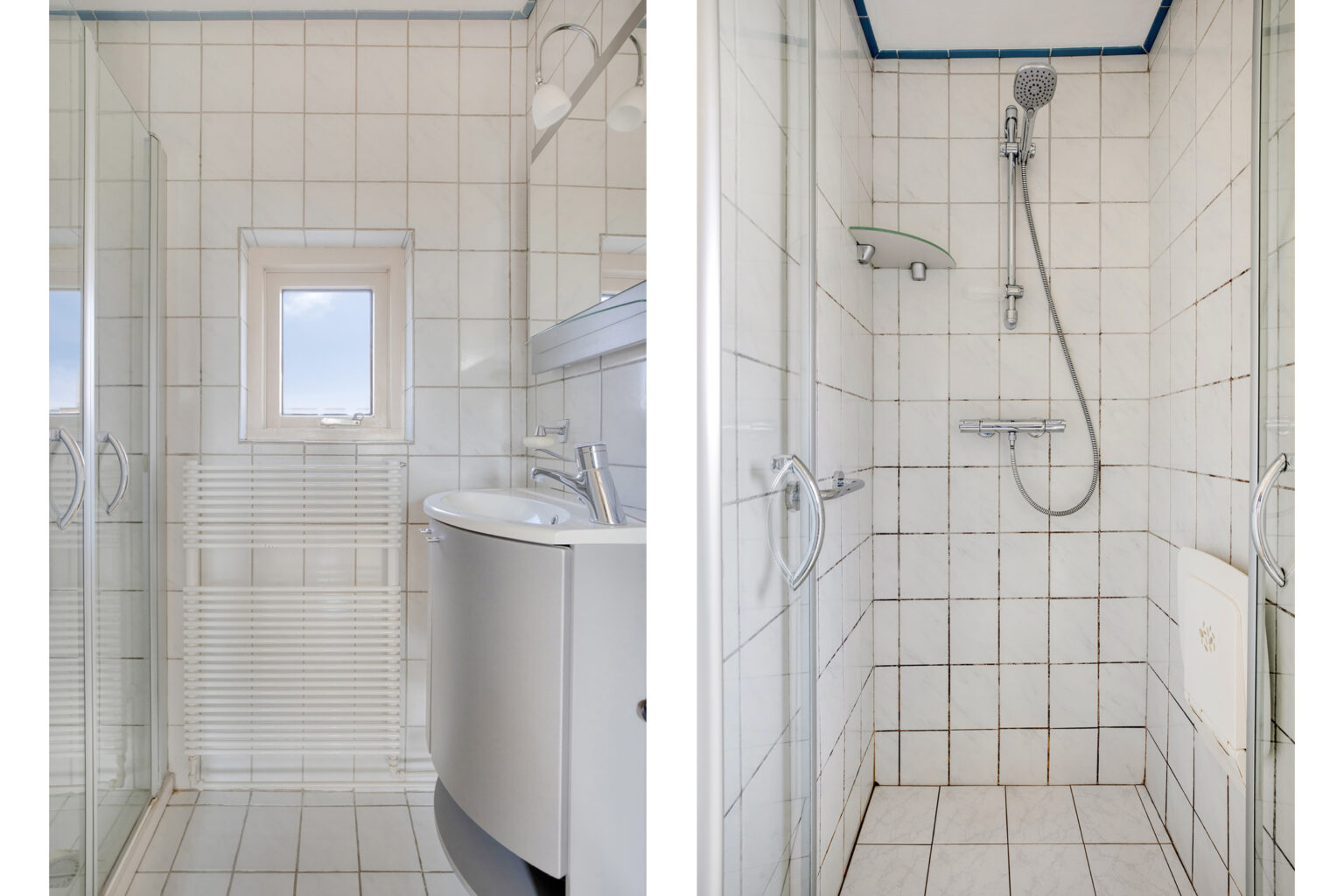 De badkamer is geheel betegeld en biedt een douche en wastafel.