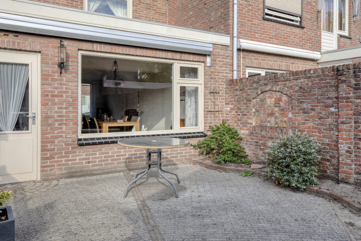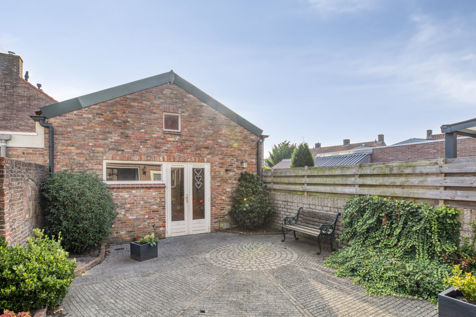 De achtertuin is strak en verzorgd aangelegd, grotendeels bestraat met hier en daar een groene touch die het geheel sfeervol maakt. Door de ligging op het oosten en een vrije doorkijk naar het zuiden geniet je hier van de zon van vroeg in de ochtend tot in de avond – een perfecte plek voor een ontbijtje in de zon of een ontspannen borrel in de avondschemering.