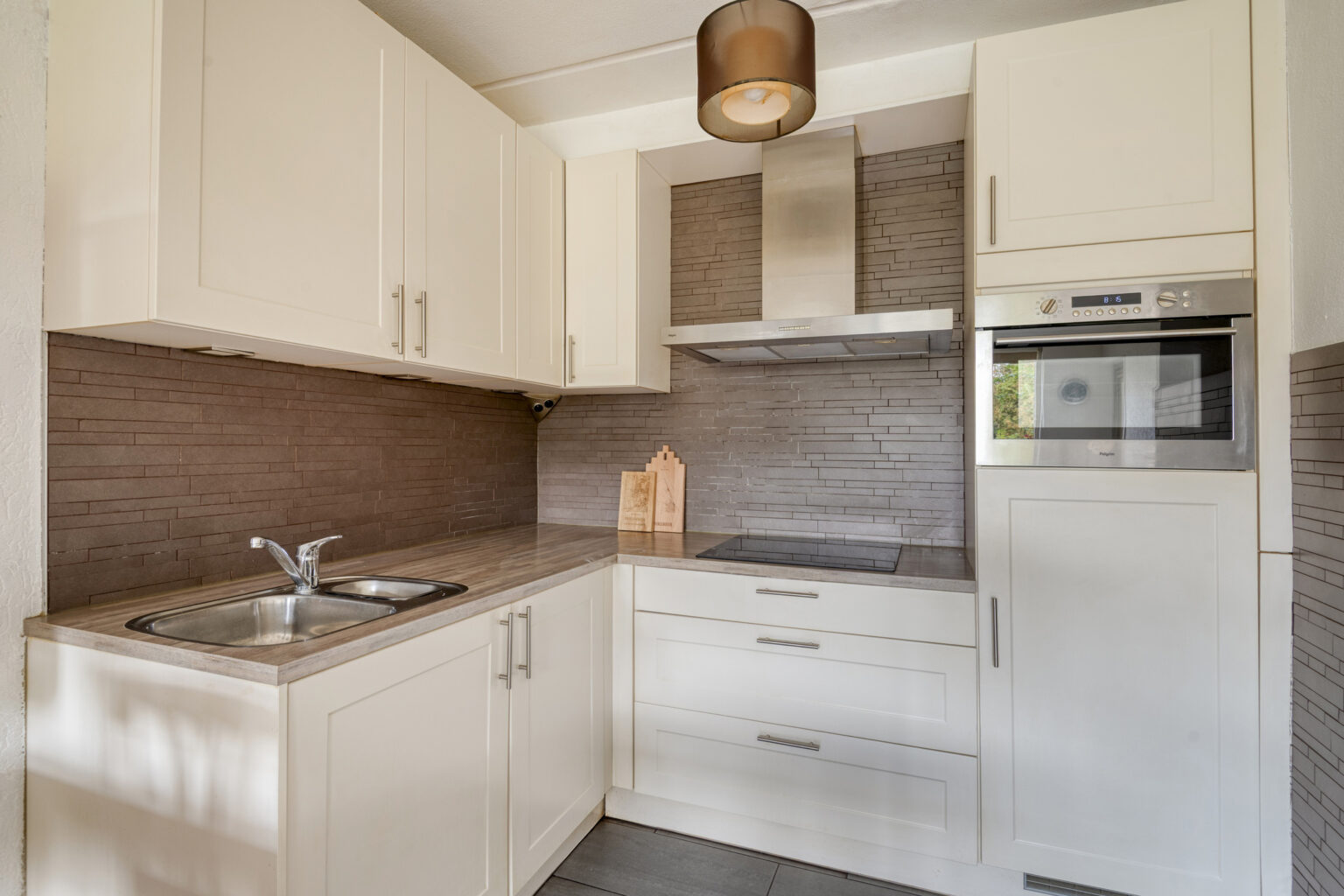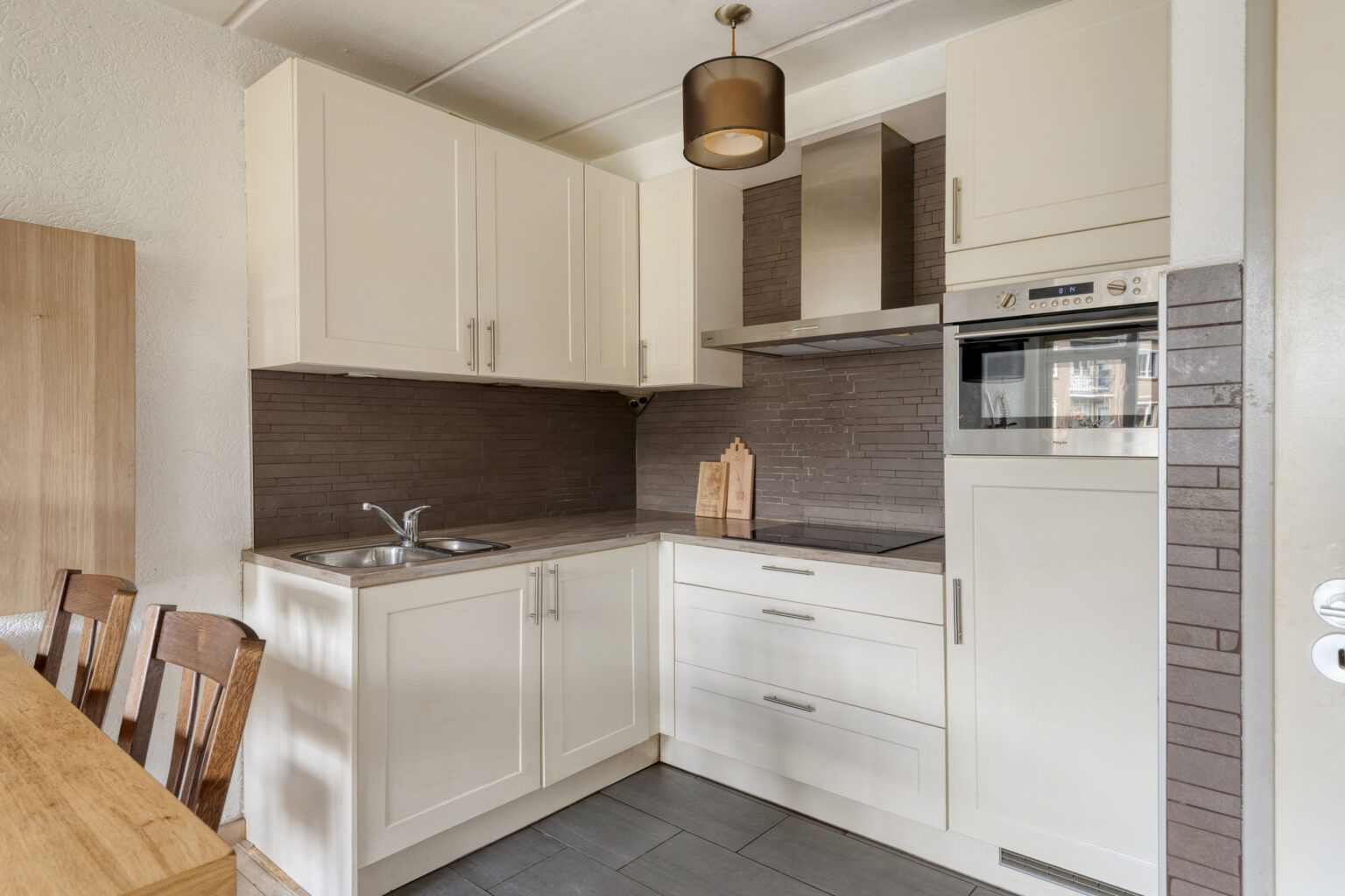 De open keuken is netjes, licht en praktisch ingericht. Ook de badkamer is verzorgd en volledig betegeld.