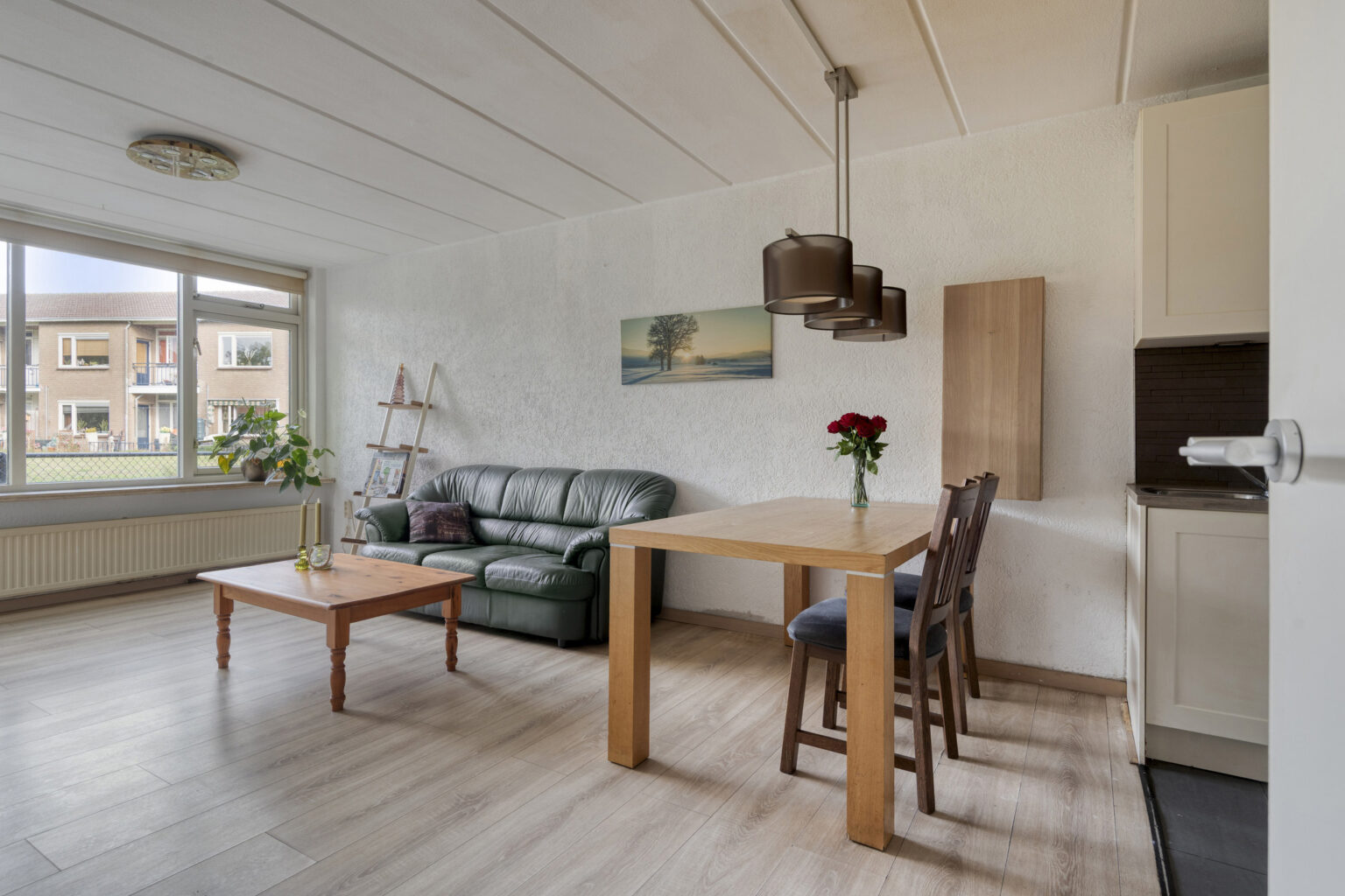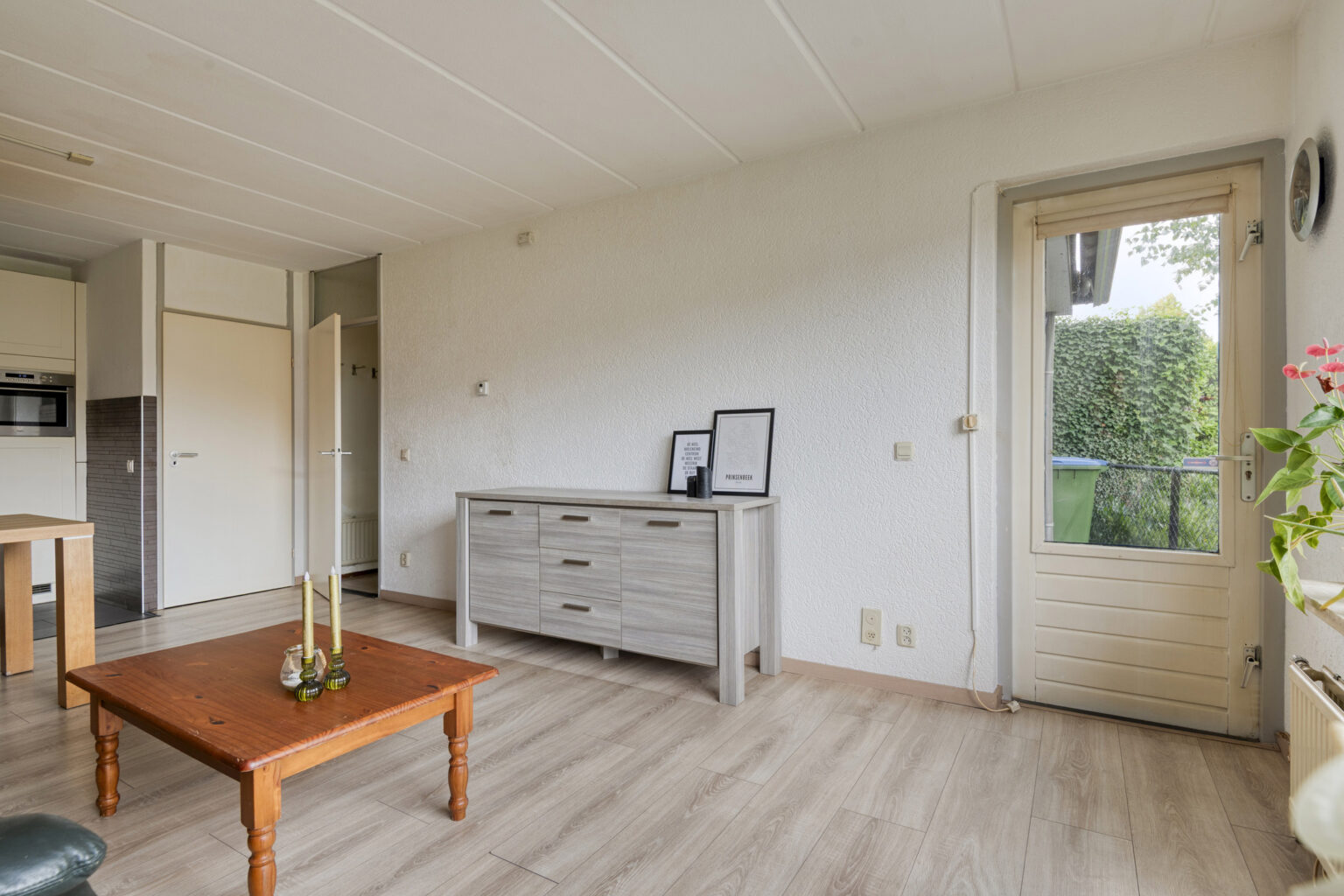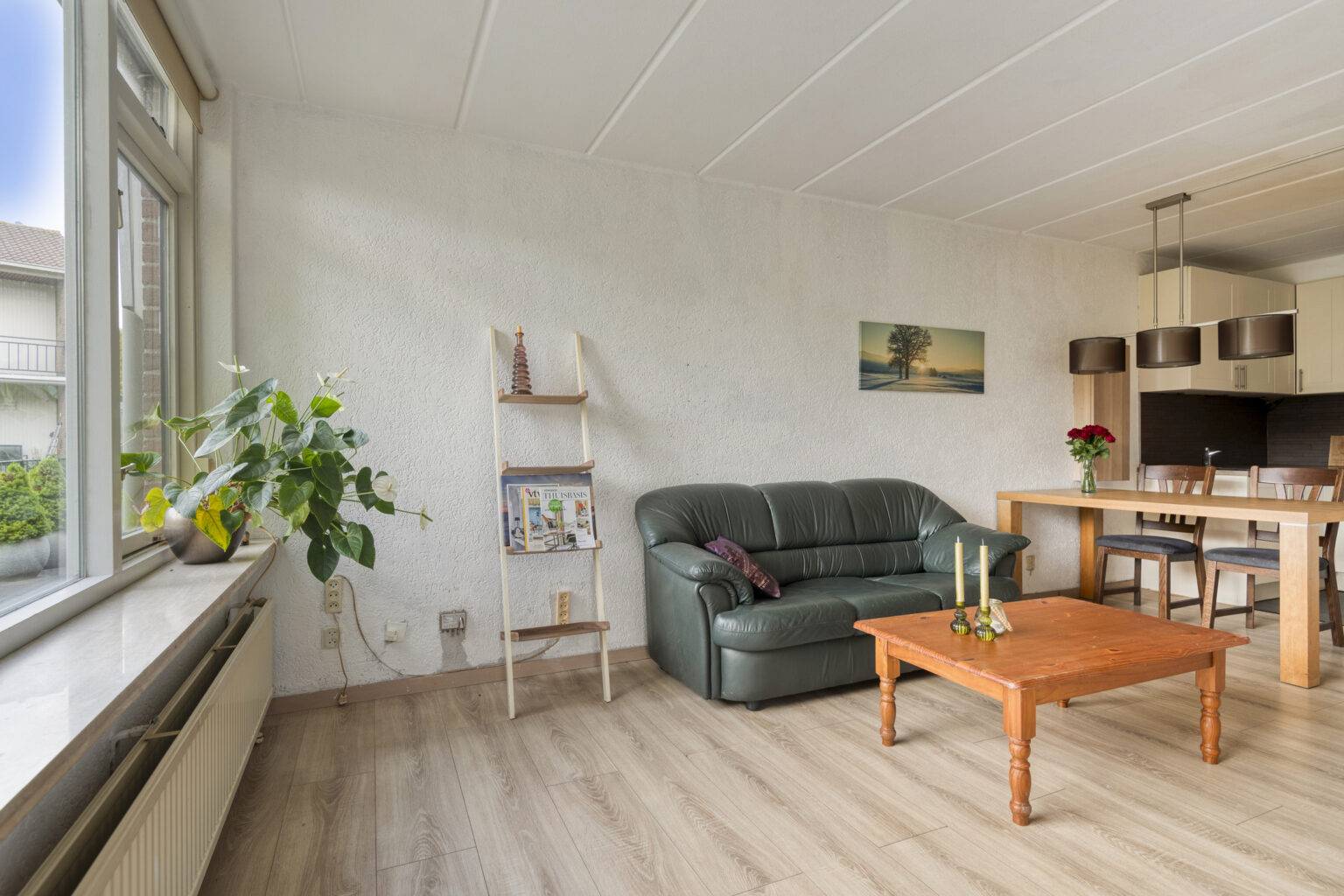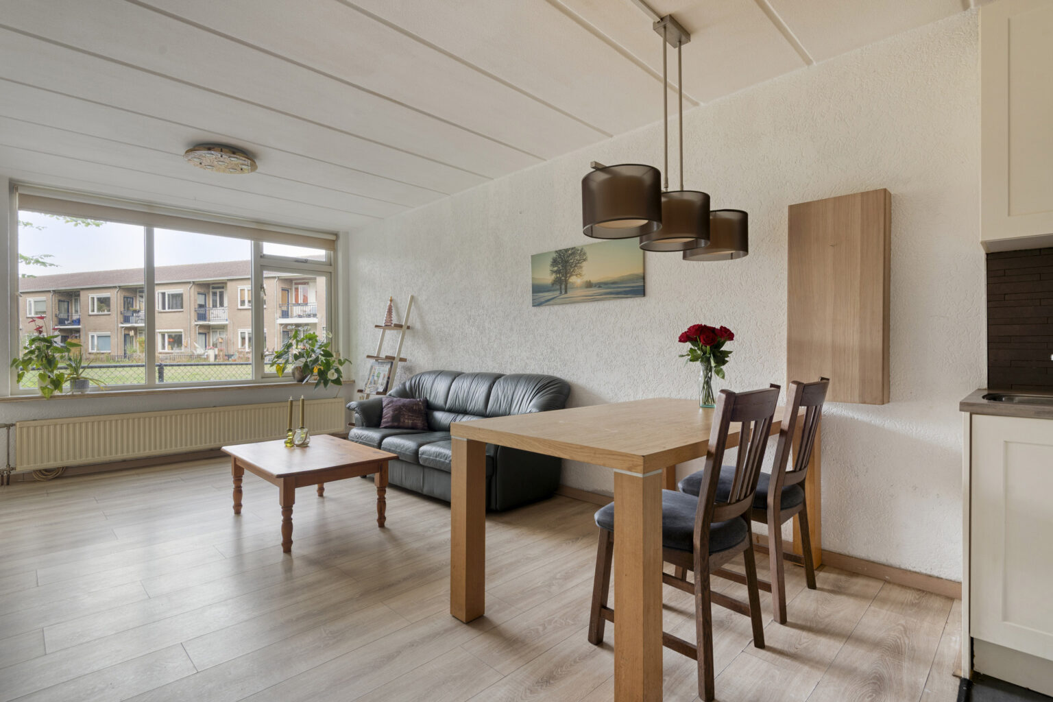 De woonkamer heeft een fijne sfeer door het mooie laminaat, stucwanden dankzij de grote raampartijen ervaar je veel lichtinval.