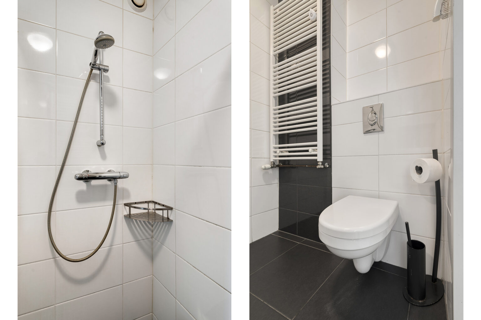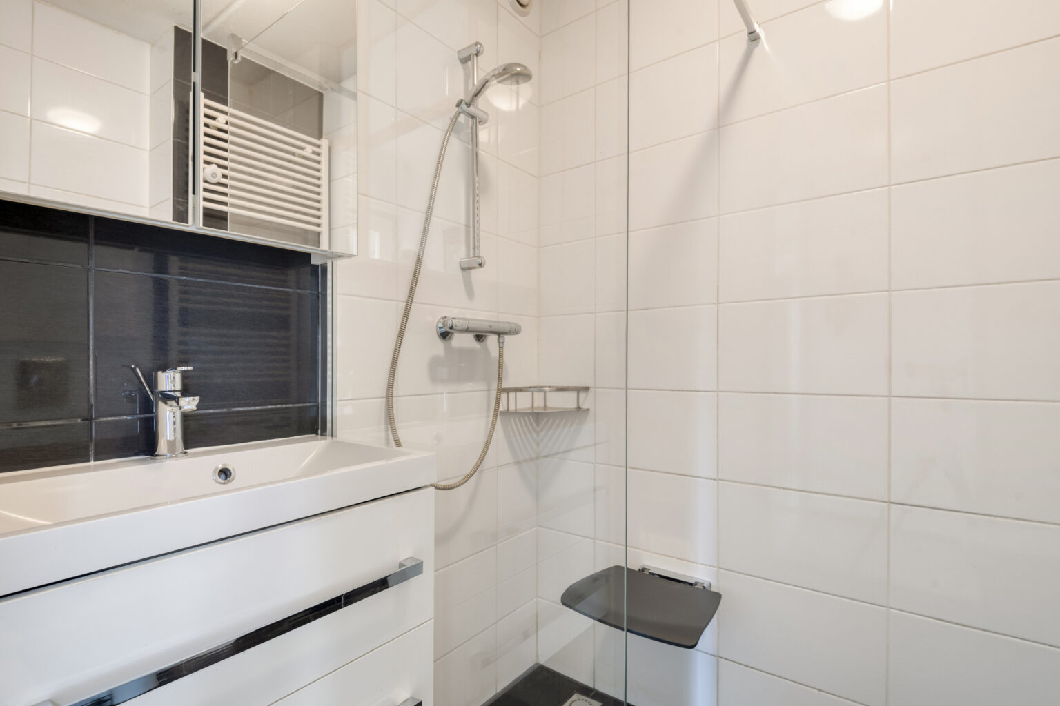 De badkamer is volledig betegeld en je treft hier een douche, wastafelmeubel en hangcloset.