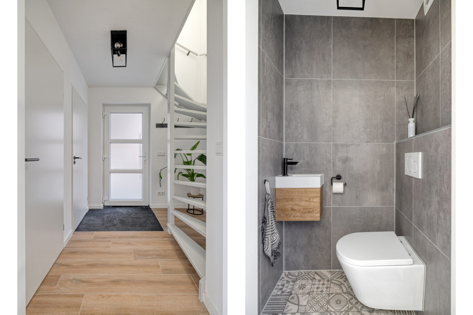 Het toilet is strak afgewerkt met een modern hangcloset en fontein.