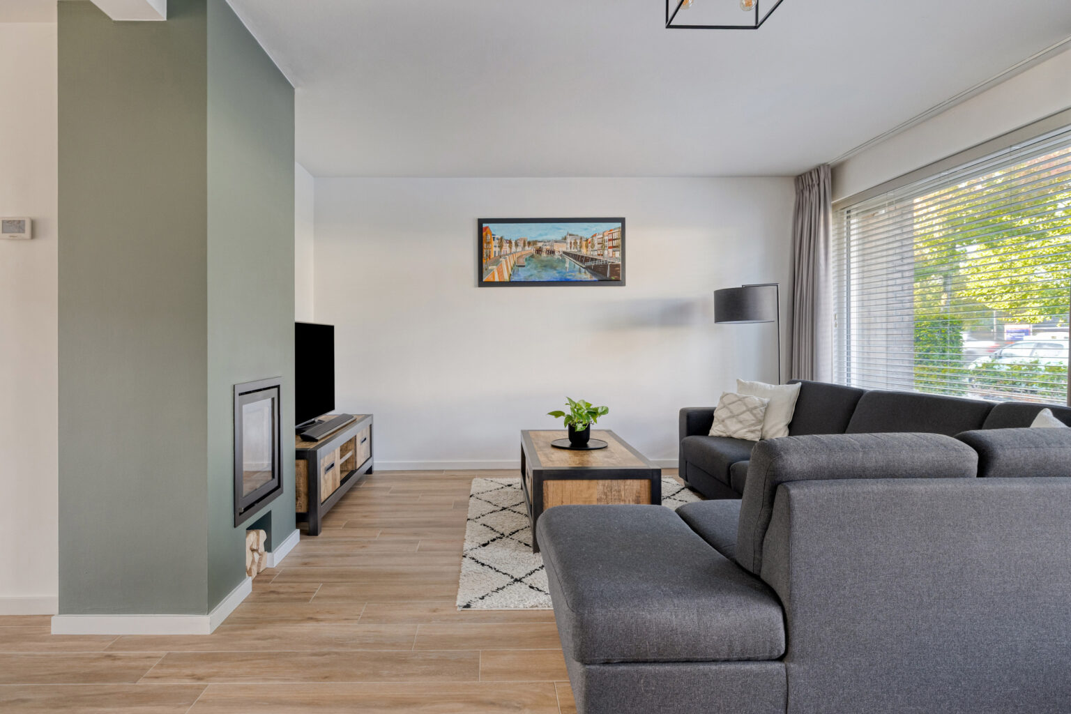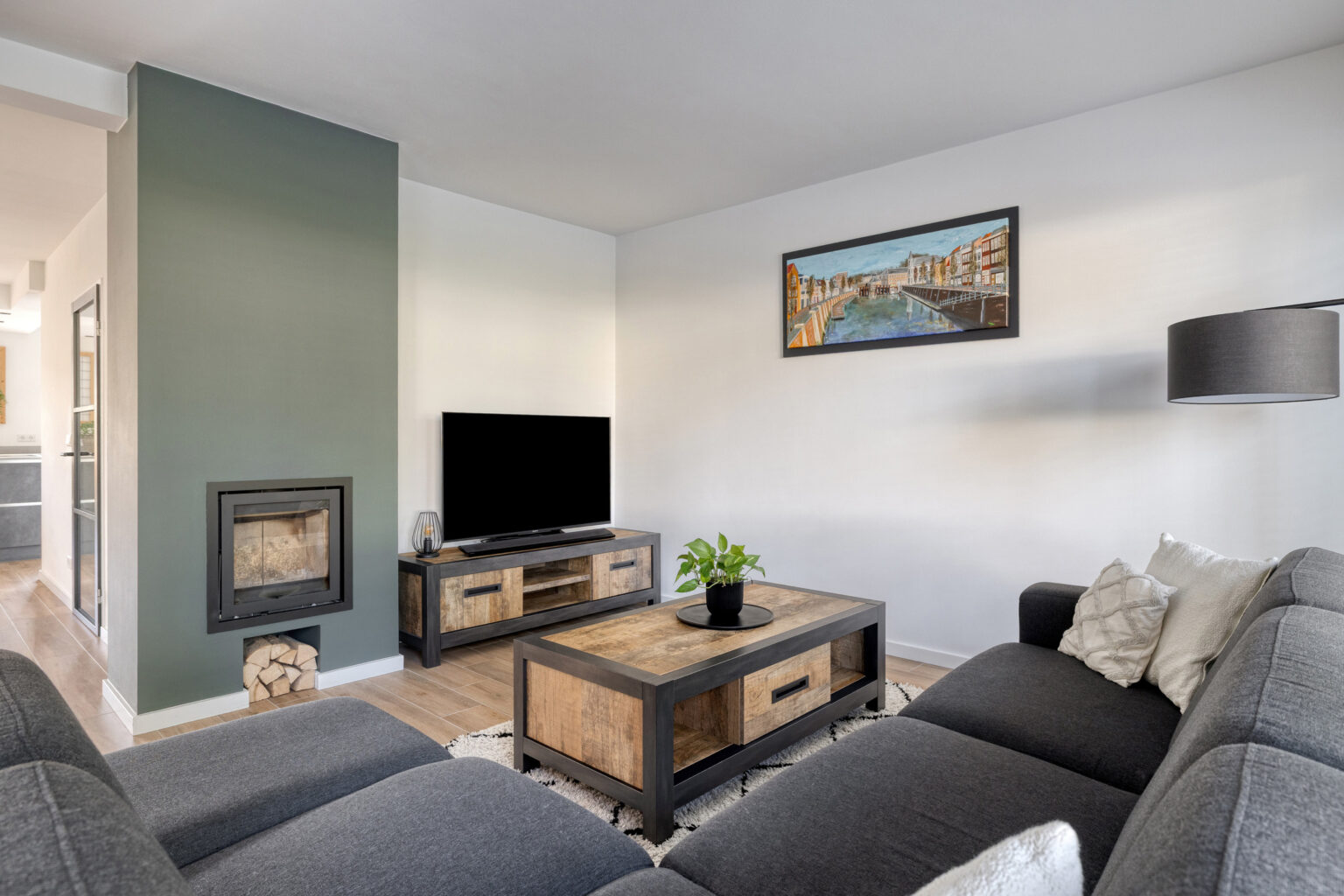De woonkamer is stijlvol afgewerkt met plavuizen, stucwanden en stucplafond, voorzien van vloerverwarming en een sfeervolle houthaard. Dankzij de vele raampartijen en de kunststof kozijnen met HR++ glas is de ruimte heerlijk licht en voelt het direct comfortabel en uitnodigend.