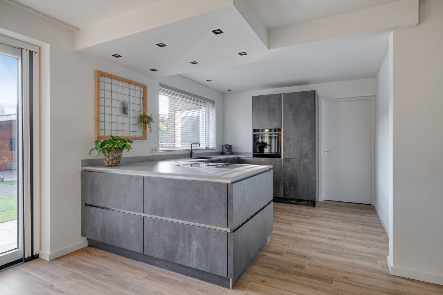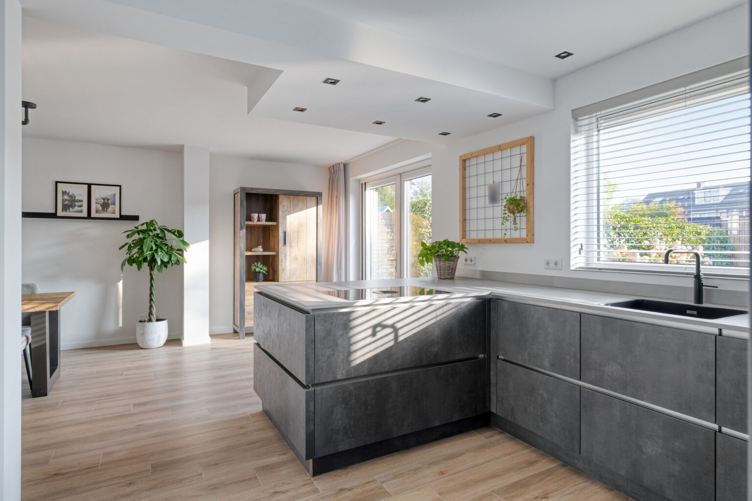 Aan de achterzijde bevindt zich de moderne open keuken, volledig uitgerust en klaar om in te koken, met een Quooker, vaatwasser, oven, koelkast, vriezer, Bora afzuigsysteem en inductiekookplaat.