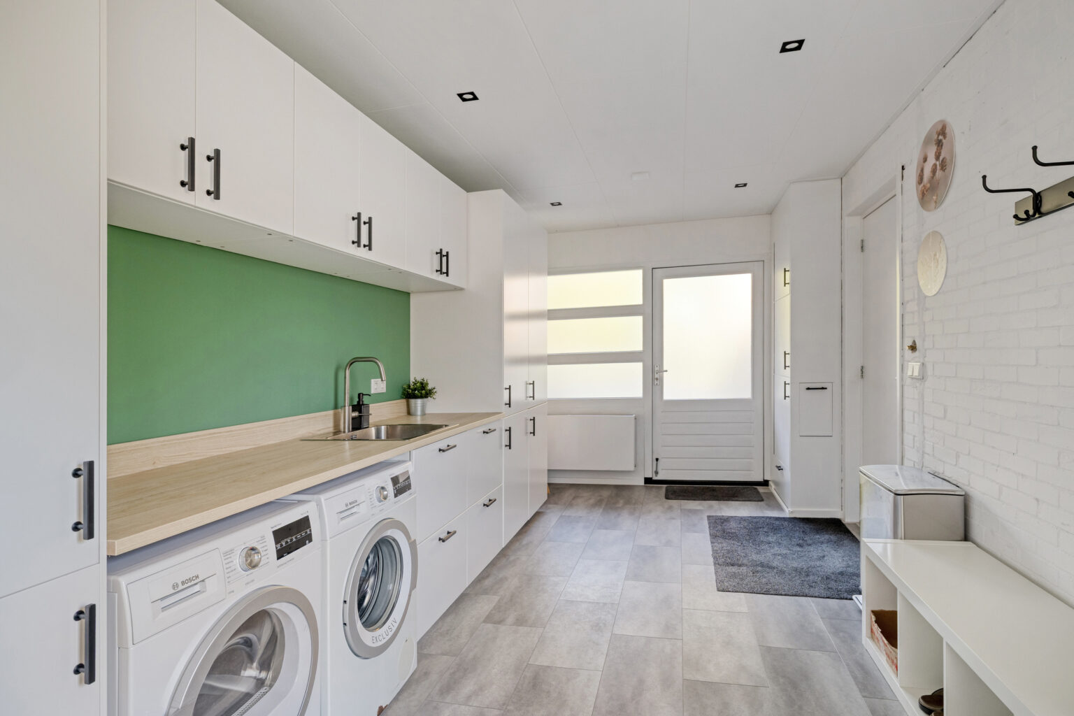 Bereikbaar vanaf de keuken tref je de praktische inpandige garage die is omgebouwd tot luxe bijkeuken. Je vindt hier een mooie pvc-vloer, loopdeur naar de oprit, fraai keukenblok met koel/vriescombinatie, close-in boiler en je treft de aansluiting voor de wasapparatuur, verwarming en de waterontharder.