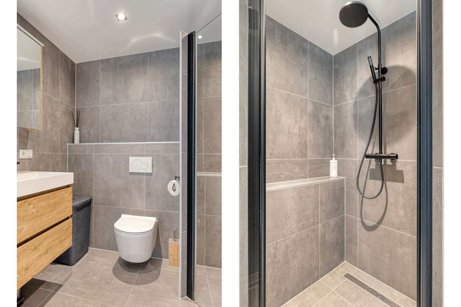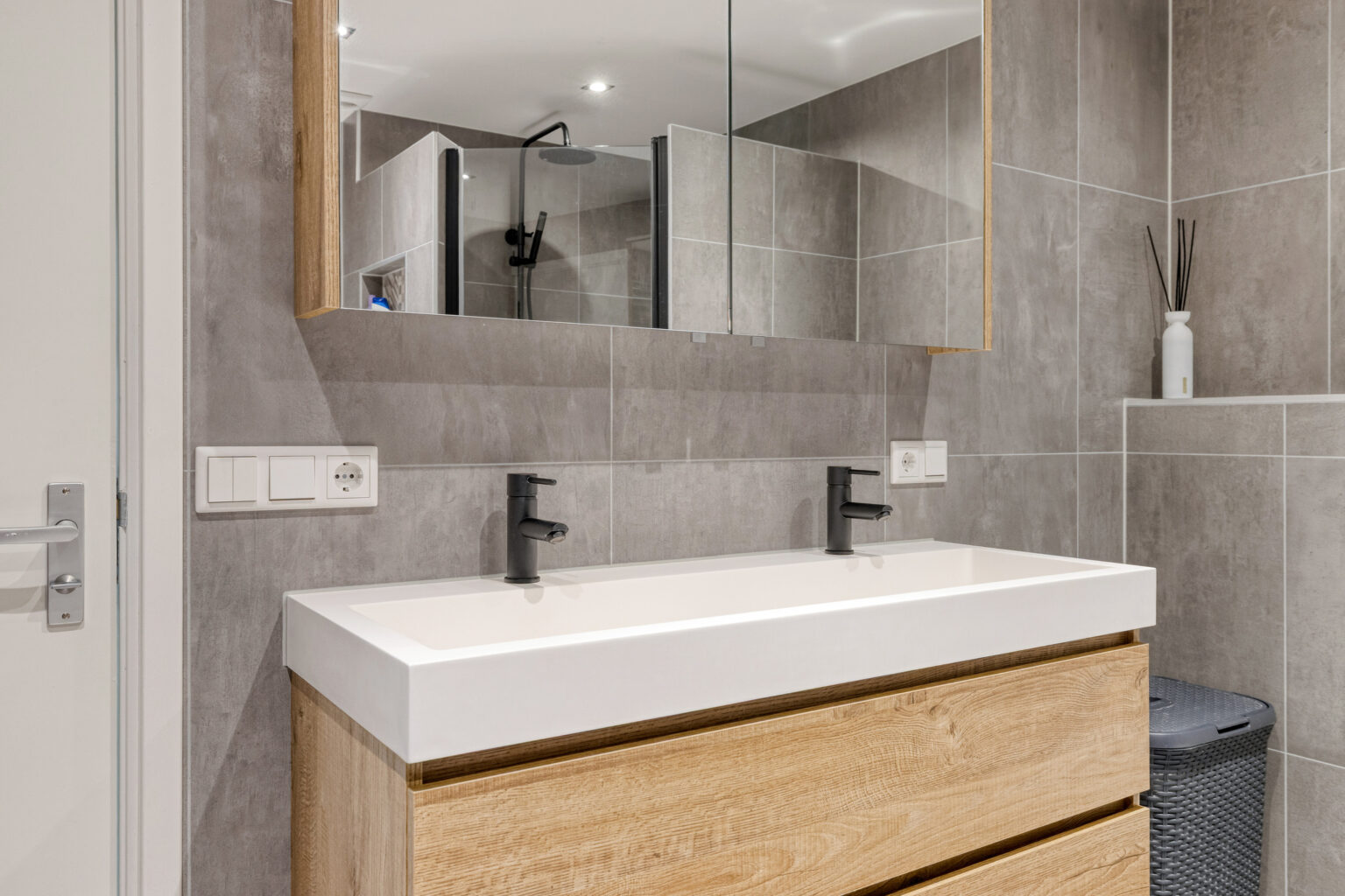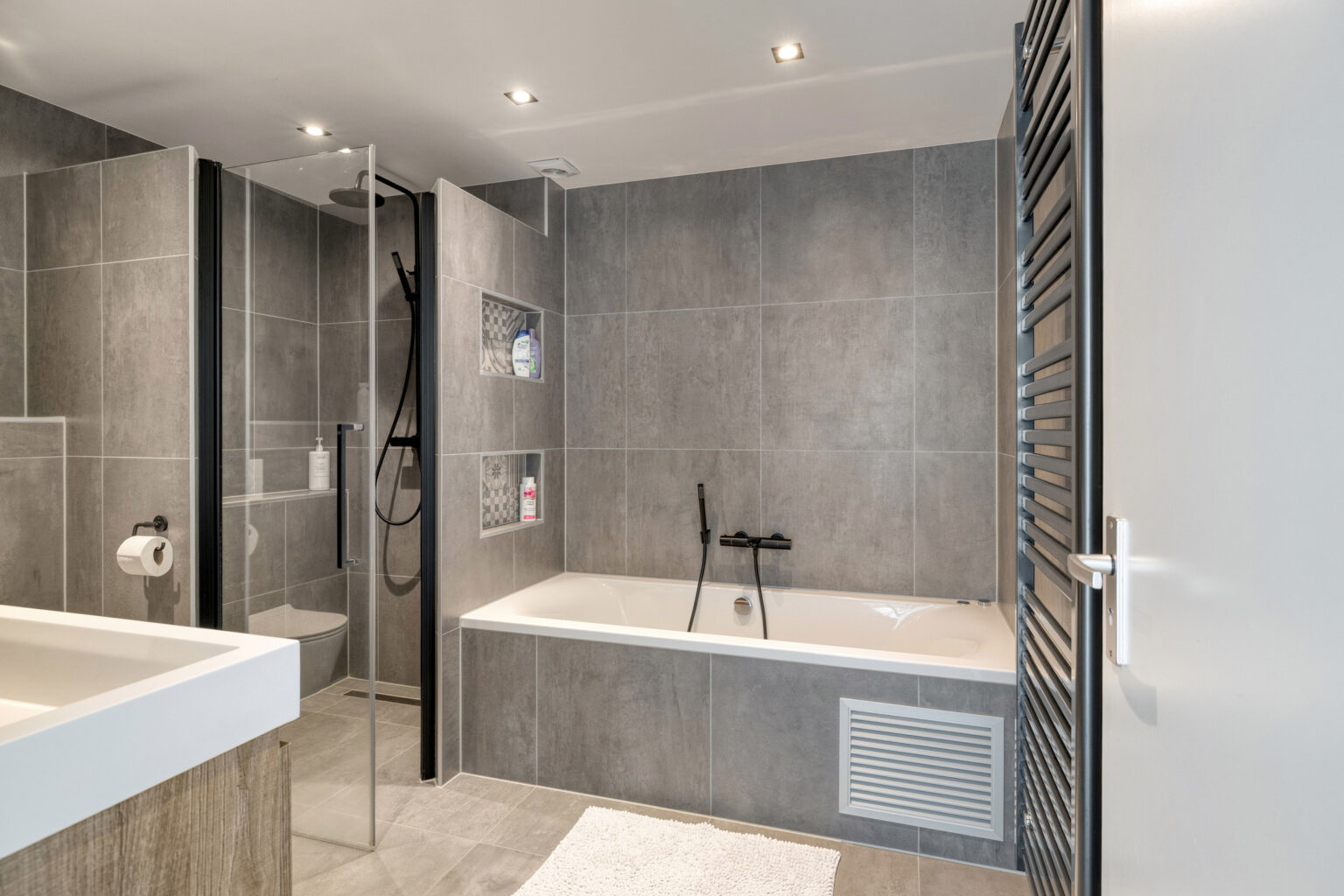 De stoere badkamer is van alle gemakken voorzien en beschikt over een ligbad, inloopdouche, hangcloset en een dubbel wastafelmeubel, perfect voor een comfortabel ochtend- of avondritueel.