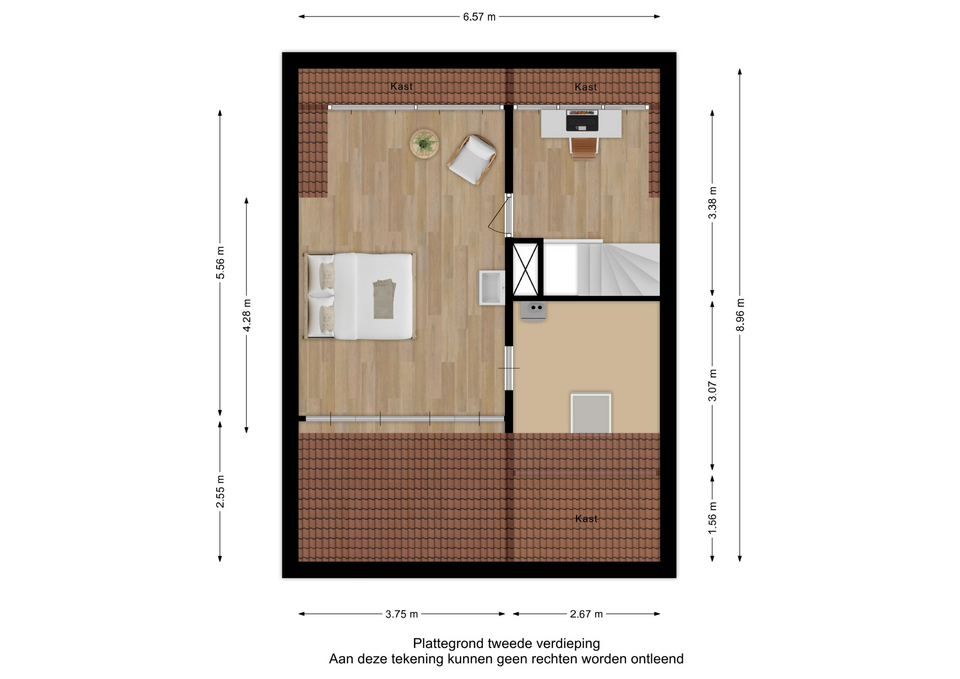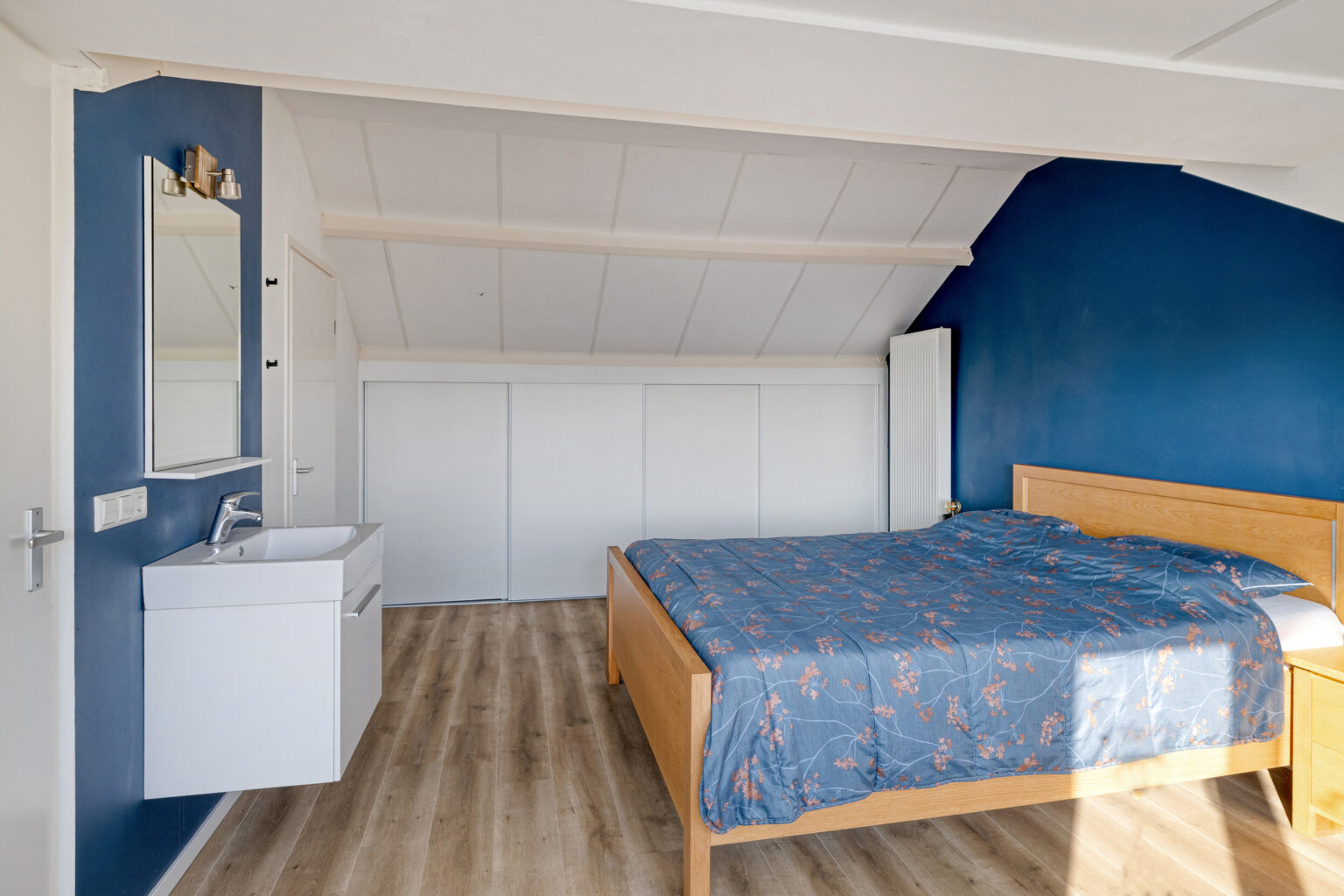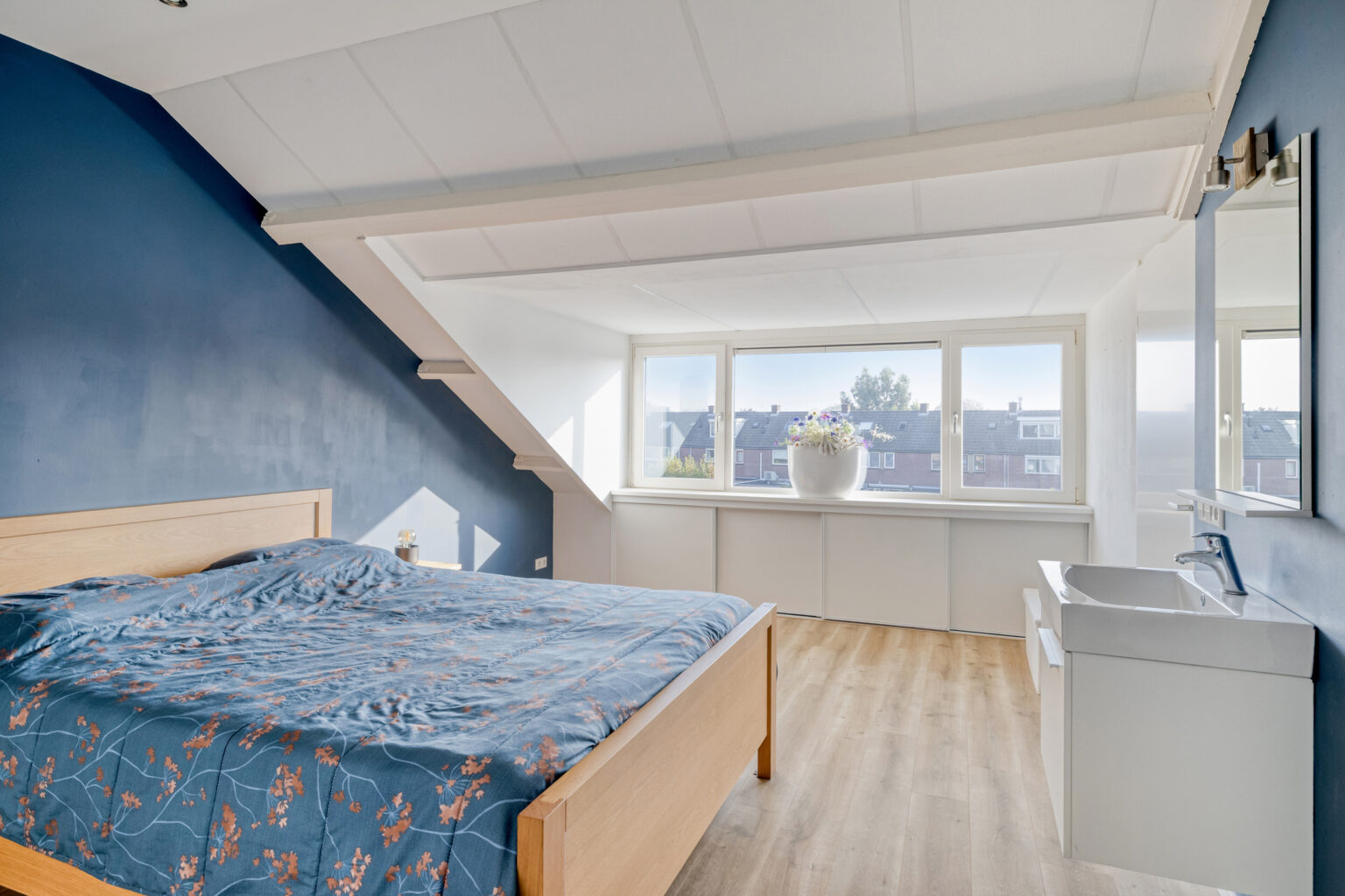 De zolderslaapkamer is verrassend ruim en volledig instapklaar, afgewerkt met laminaat, stucwanden en een strak platenplafond. Dankzij het dakkapel valt er veel licht naar binnen en er is volop bergruimte, terwijl een praktische wastafel extra comfort biedt.