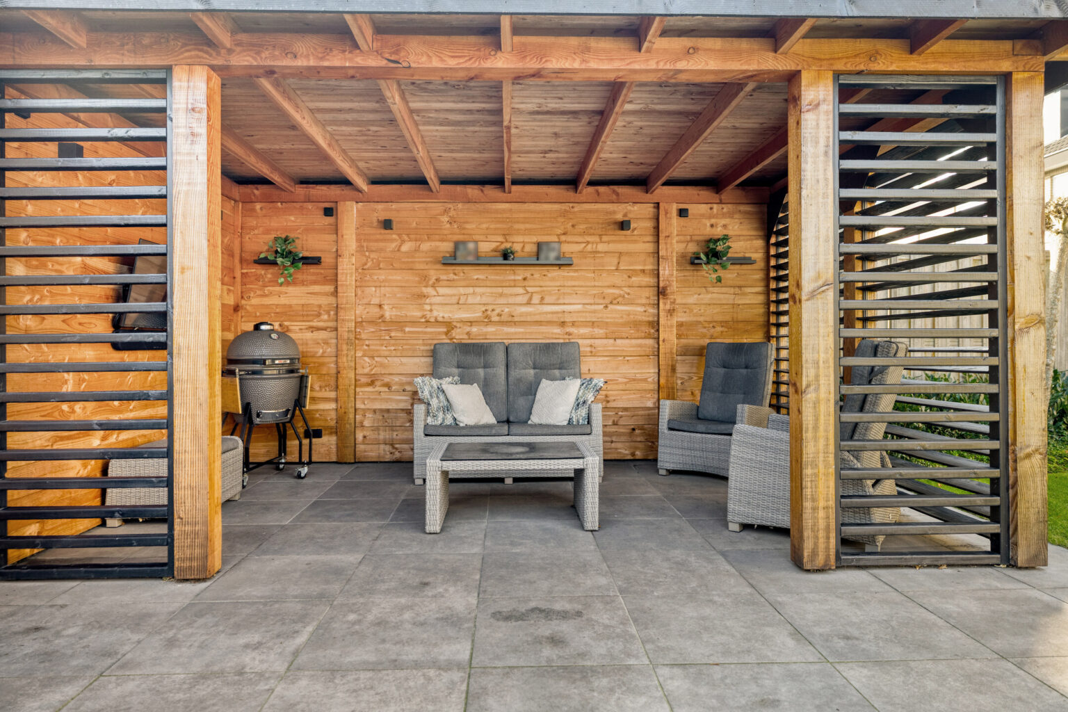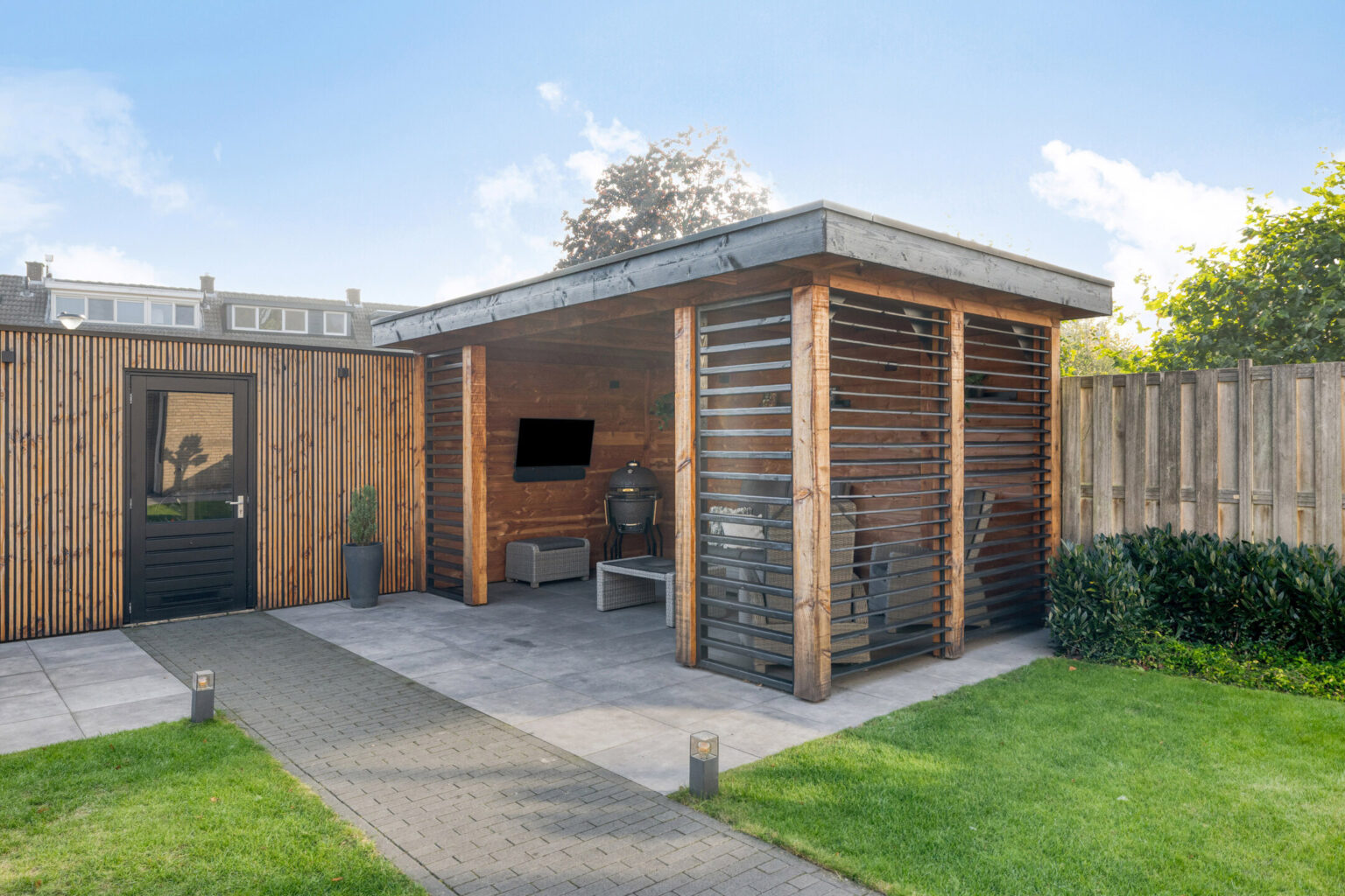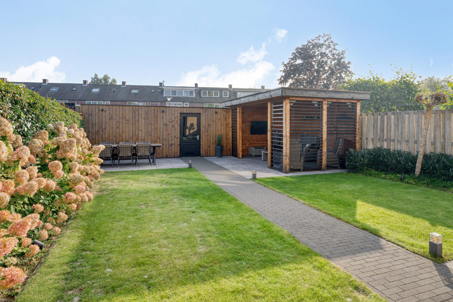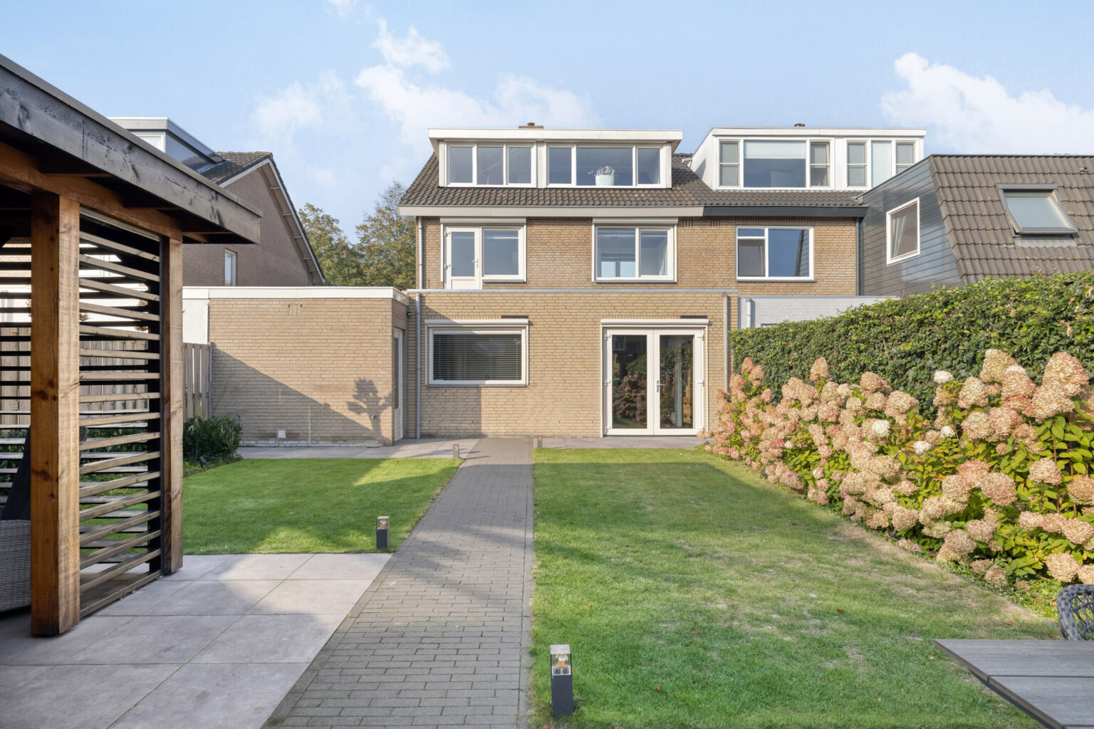 De achtertuin is onderhoudsvriendelijk en trendy aangelegd met gazon, diverse terrassen, goede schuttingen, mooie beplanting en een royale veranda die als een extra tuinkamer dienstdoet, ideaal om van het buitenleven te genieten.