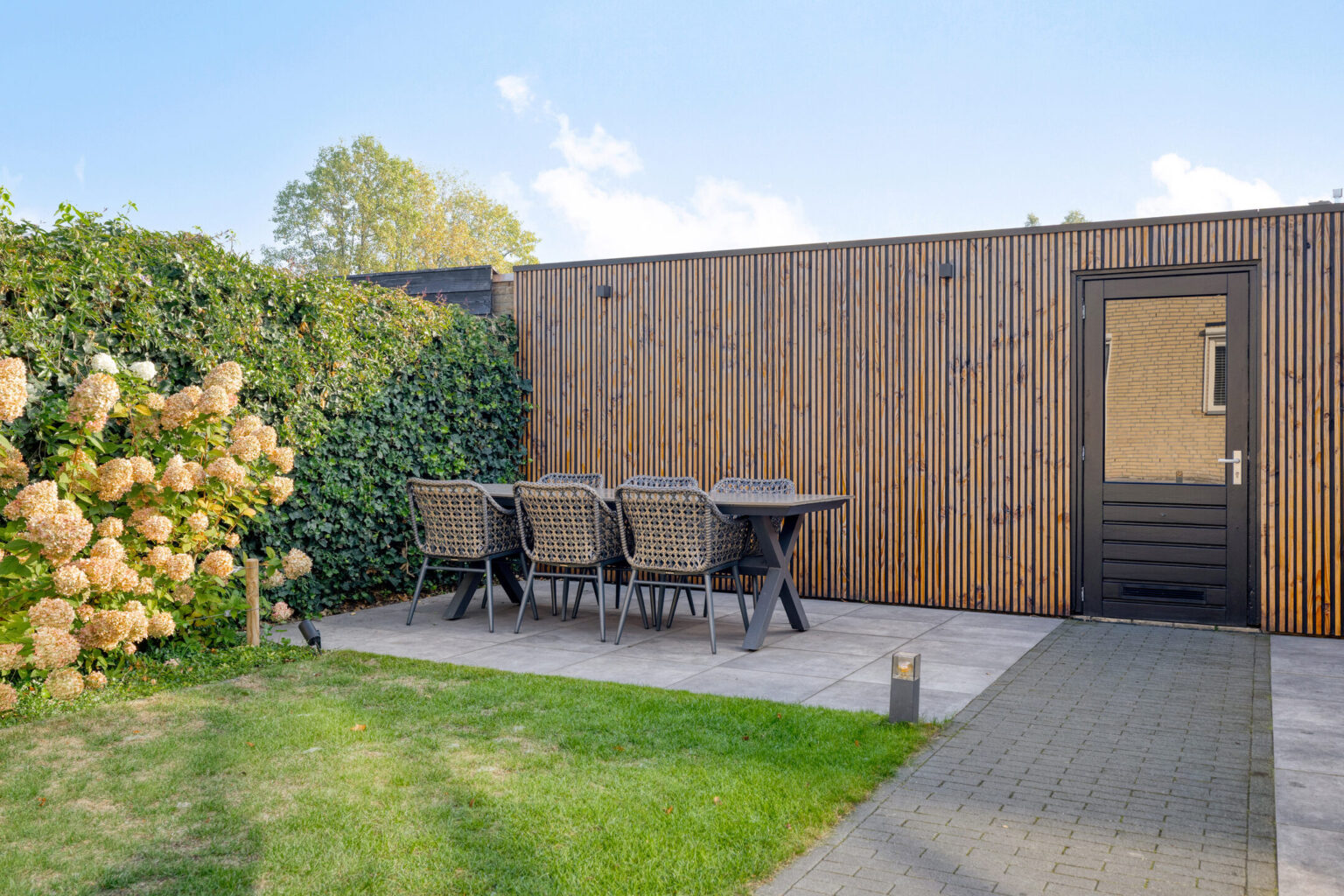 De voortuin is ruim en goed aangelegd, wat bij aankomst direct een vriendelijk beeld geeft.