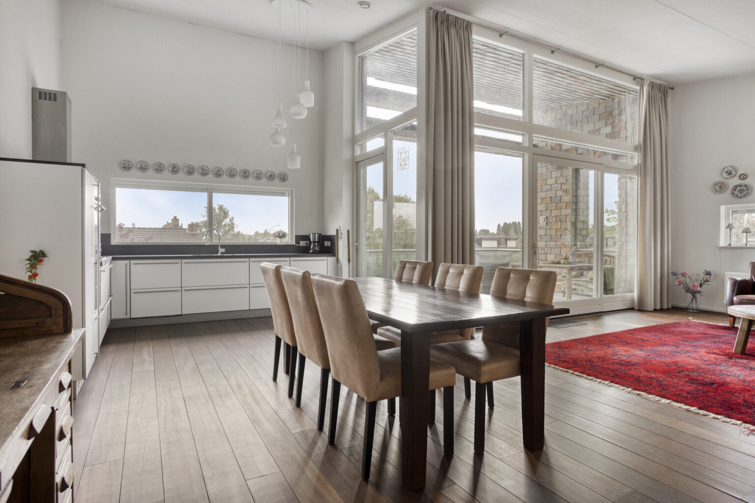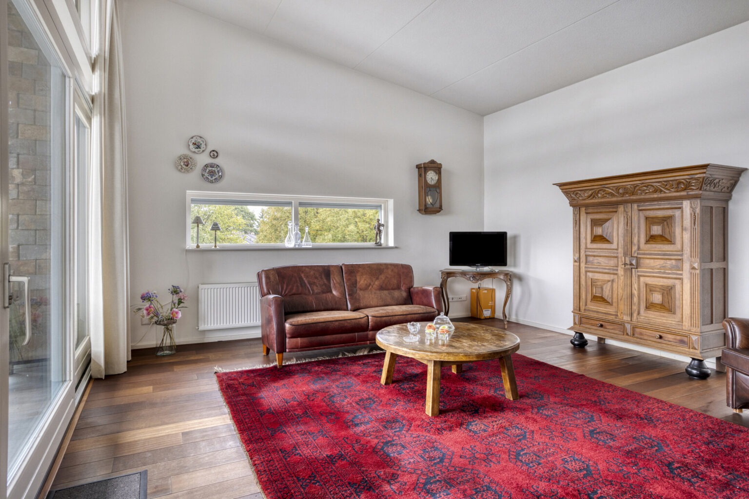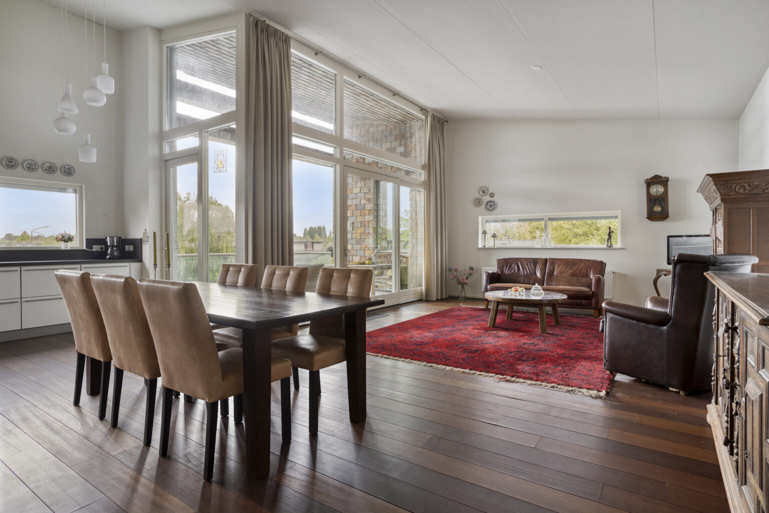 De woonkamer is heerlijk ruim en sfeervol, met grote raampartijen en een houten vloer.