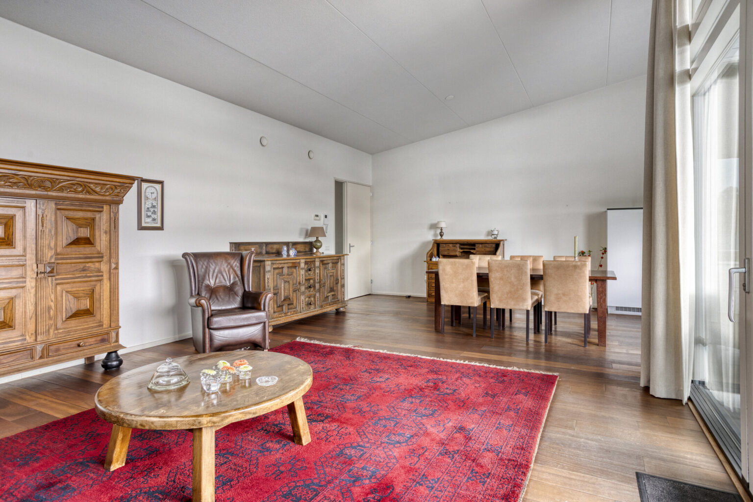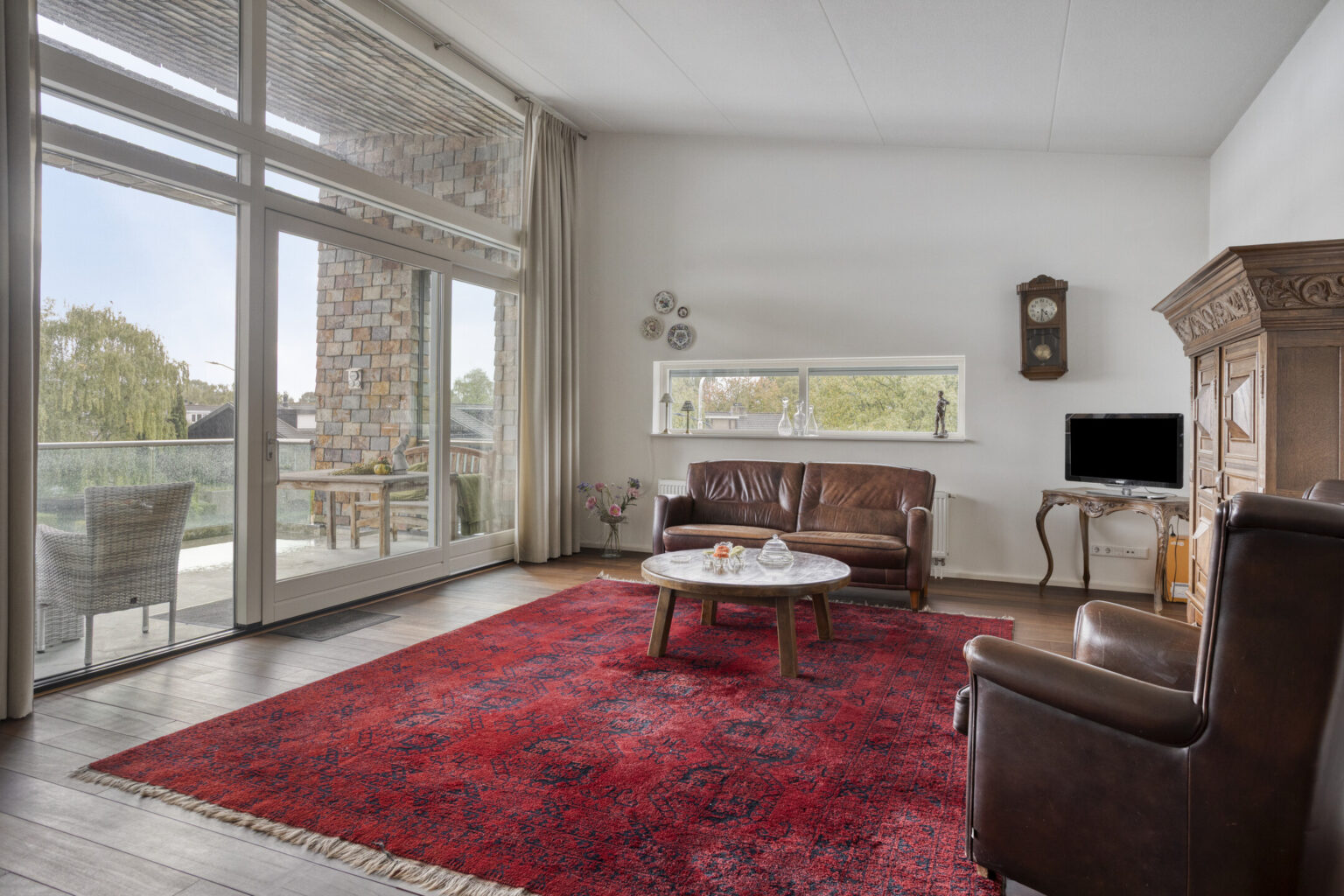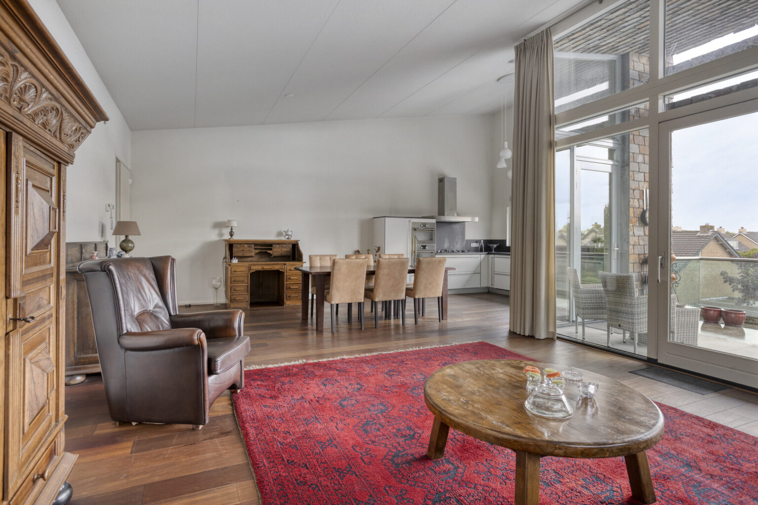 De woonkamer is heerlijk ruim en sfeervol, met grote raampartijen en een houten vloer.